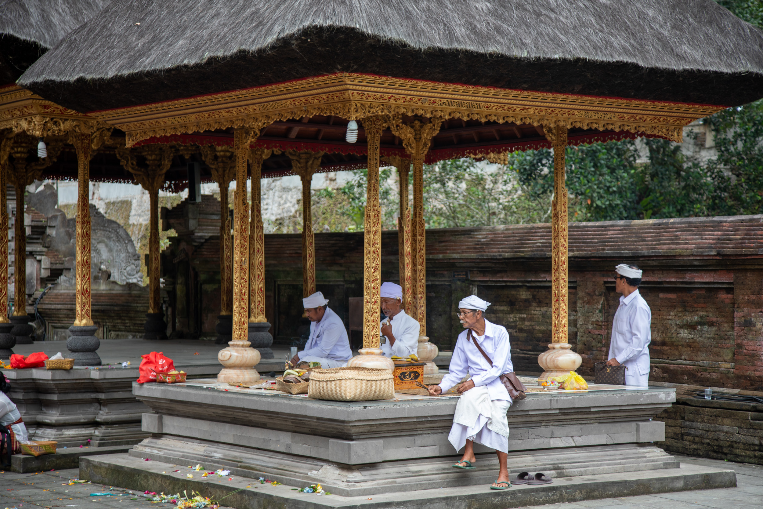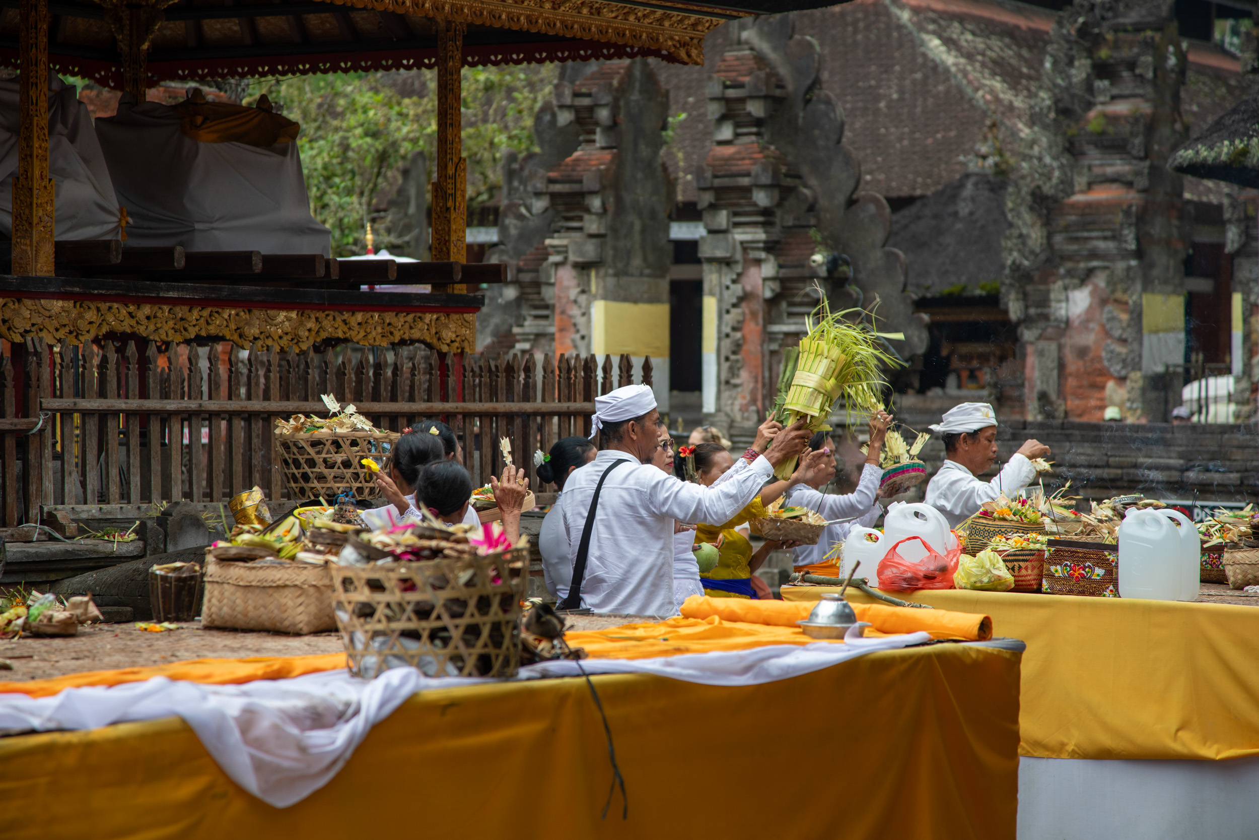 Il y a une cérémonie au coeur du temple, il y a de la musique, des gens posent des offrandes sur une table puis s'installent. On trouve dans les offrandes de la nourriture, et même un poussin dans un panier!