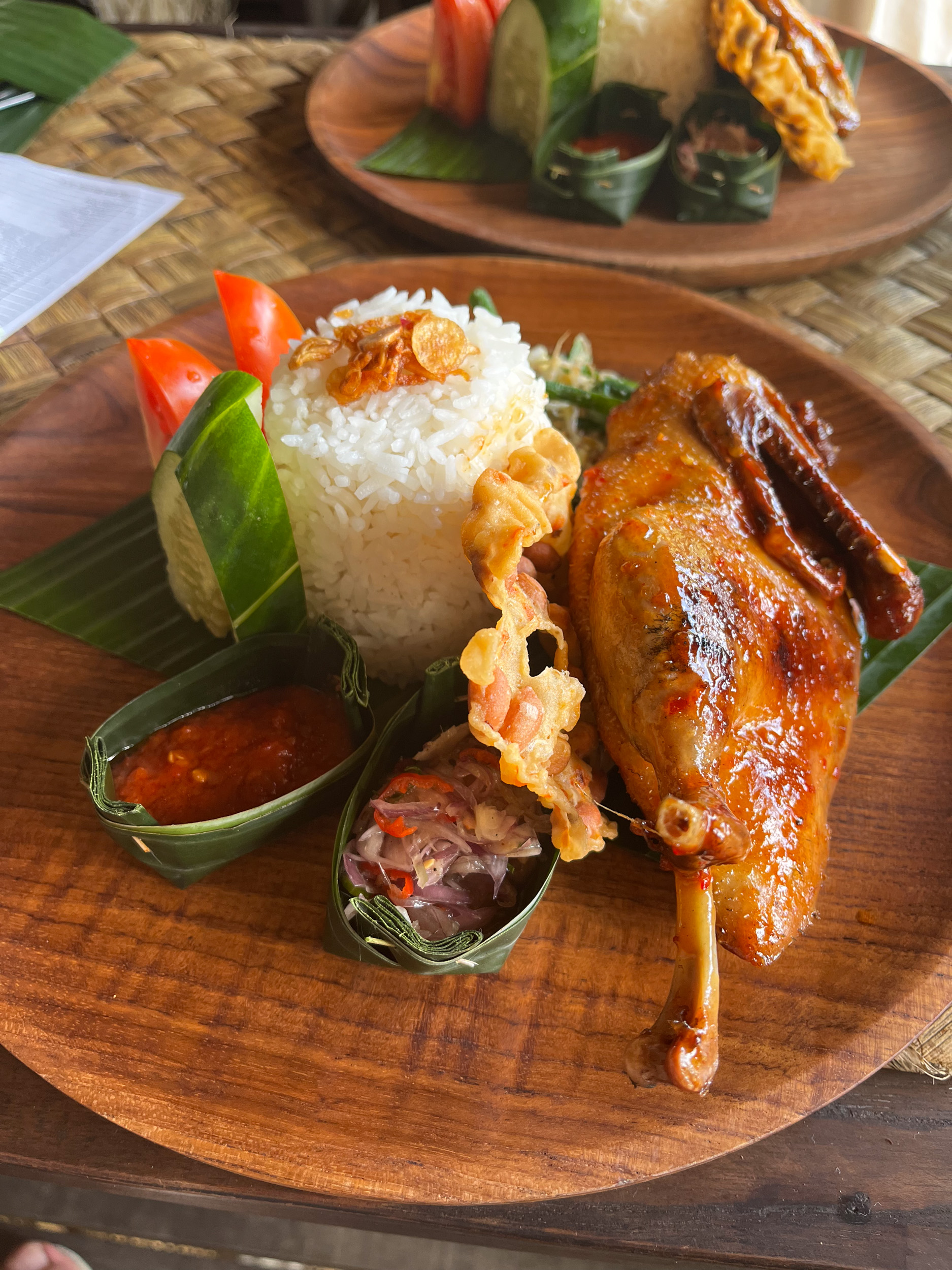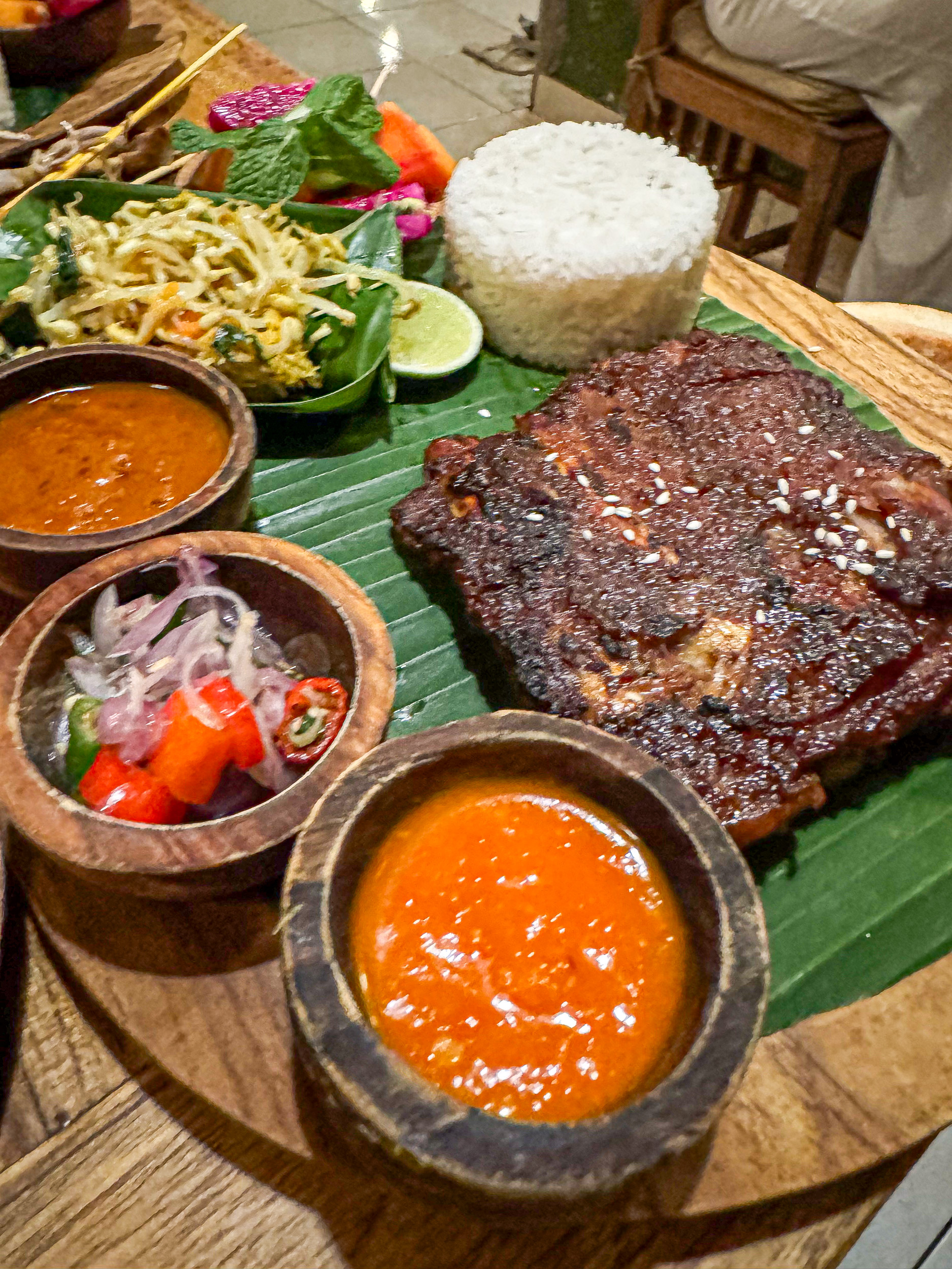 On fini même par s’endormir un moment. Ce sont les fines gouttes de pluie qui nous font partir, on ne veut pas se prendre la tempête, qui menace avec ses gros nuages noirs. On part diner dans un restaurant qui sert une des spécialités de Bali, la peau de porc grillée. On trouve le Warung Babi Guling Ibu Oka 1, à proximité. On attendait beaucoup de ce plat, mais finalement il n’y a pas beaucoup à manger et on reste un peu sur notre faim.