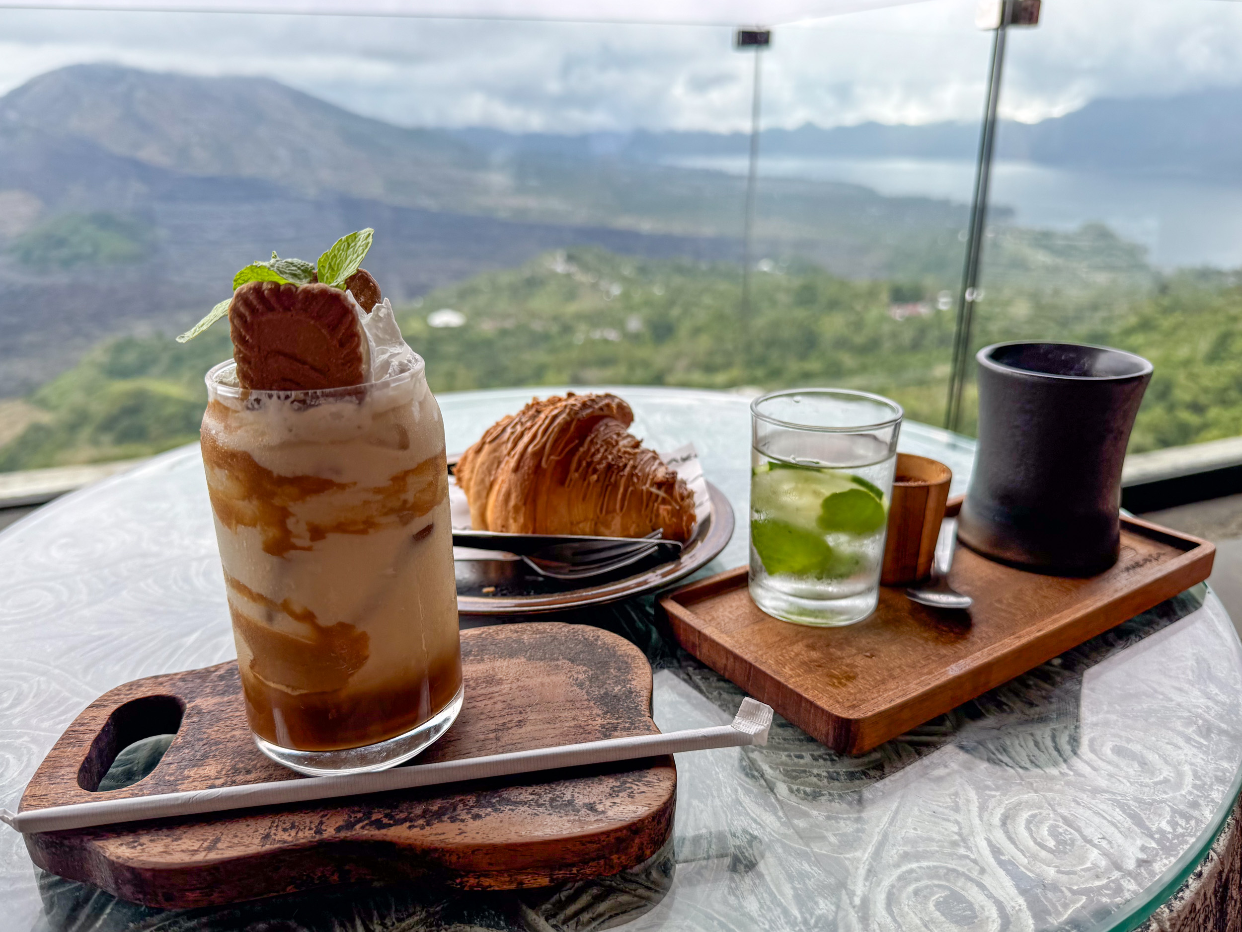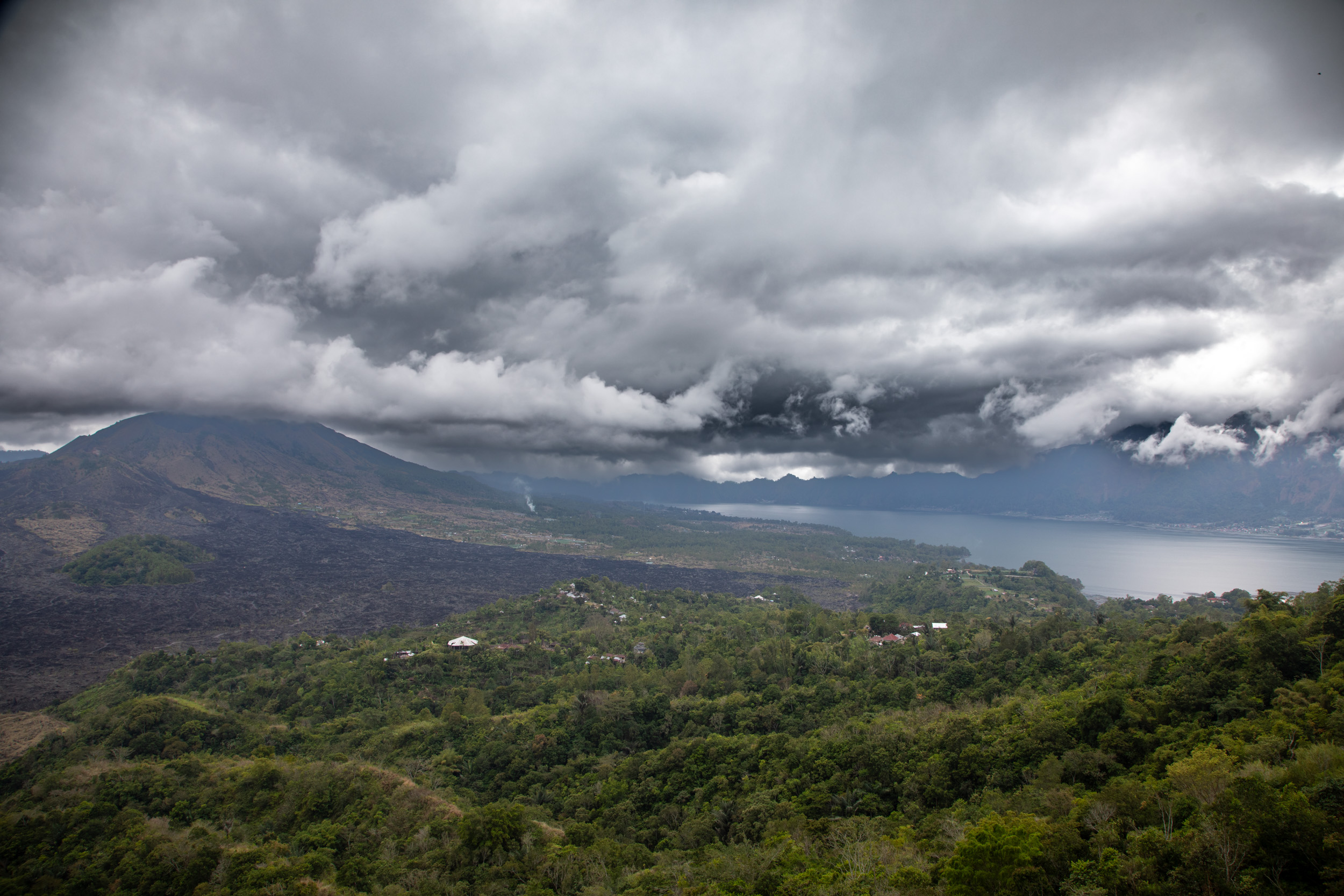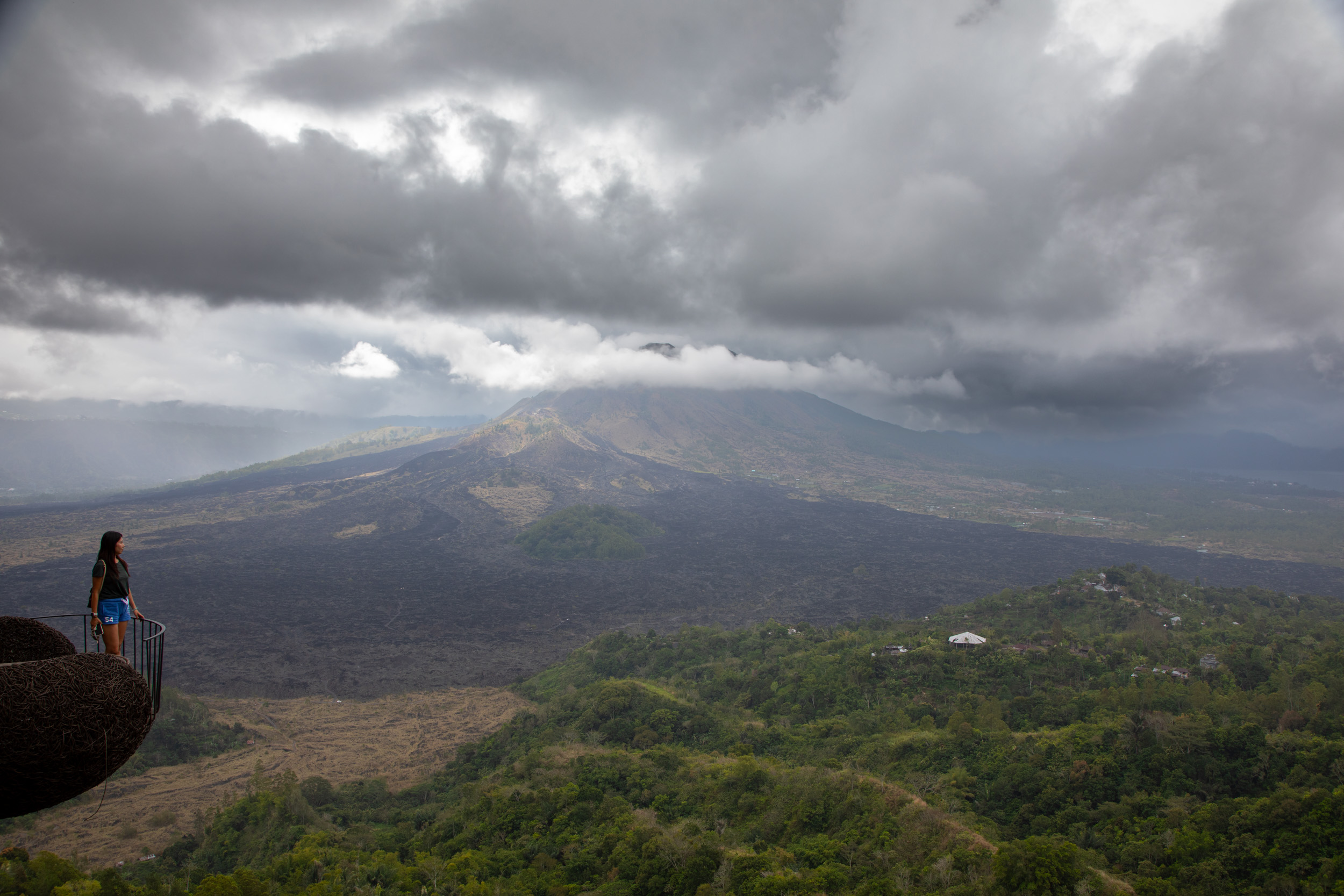 Puis le temps s'est dégradé rapidement alors que l'on voulait visiter le Nord autour du volcan Batur. On se réfugie dans le café Akasa pour manger le déjeuner avec une vue de fin du monde sur ce volcan qui a laissé des traces très visibles de sa dernière éruption. Il y a aussi un lac dans le cratère. Malgré le temps, la vue est splendide. Et étonnamment on a un peu froid à cette altitude.