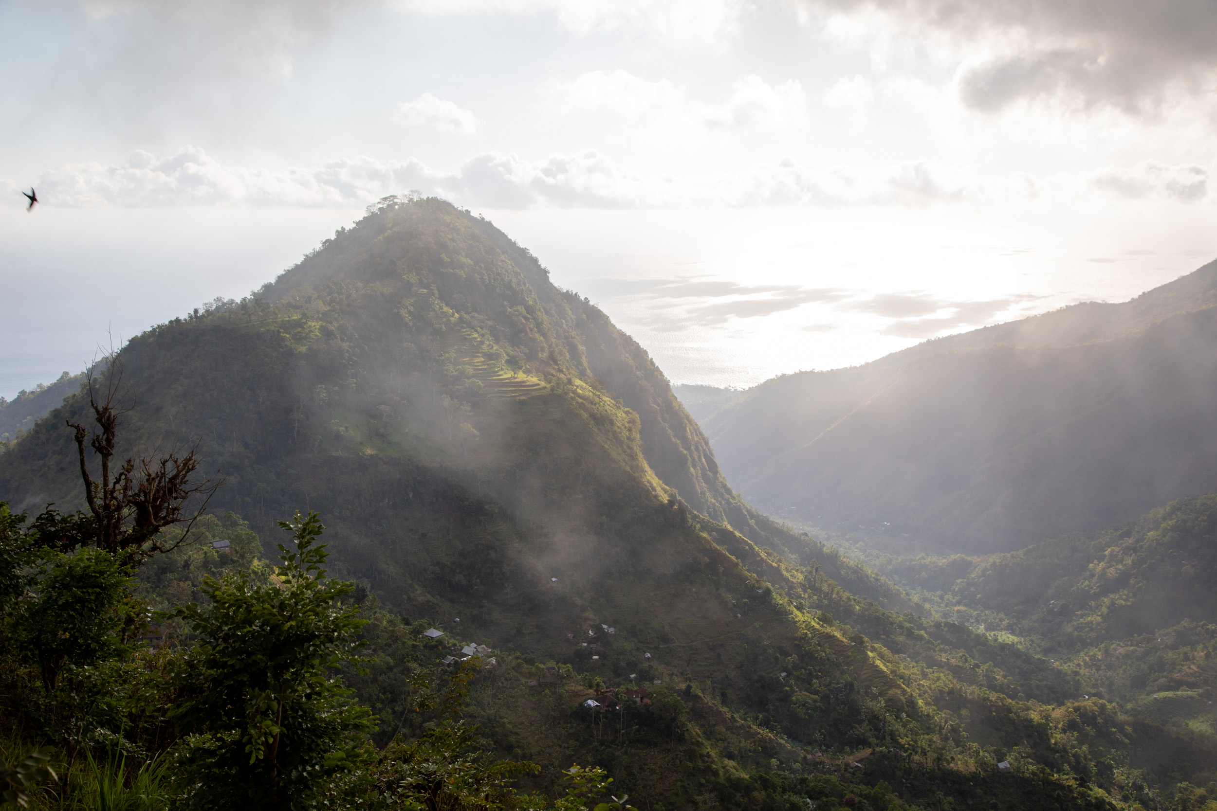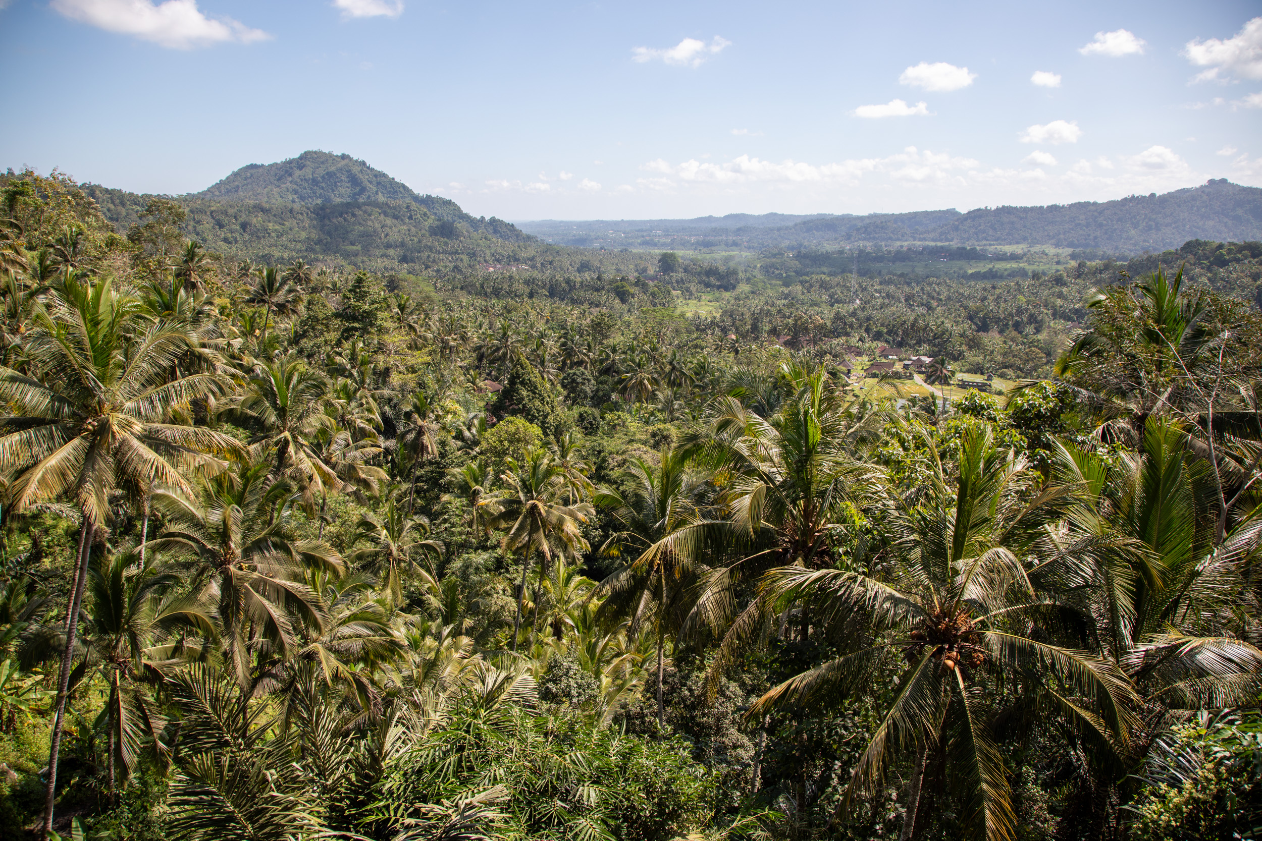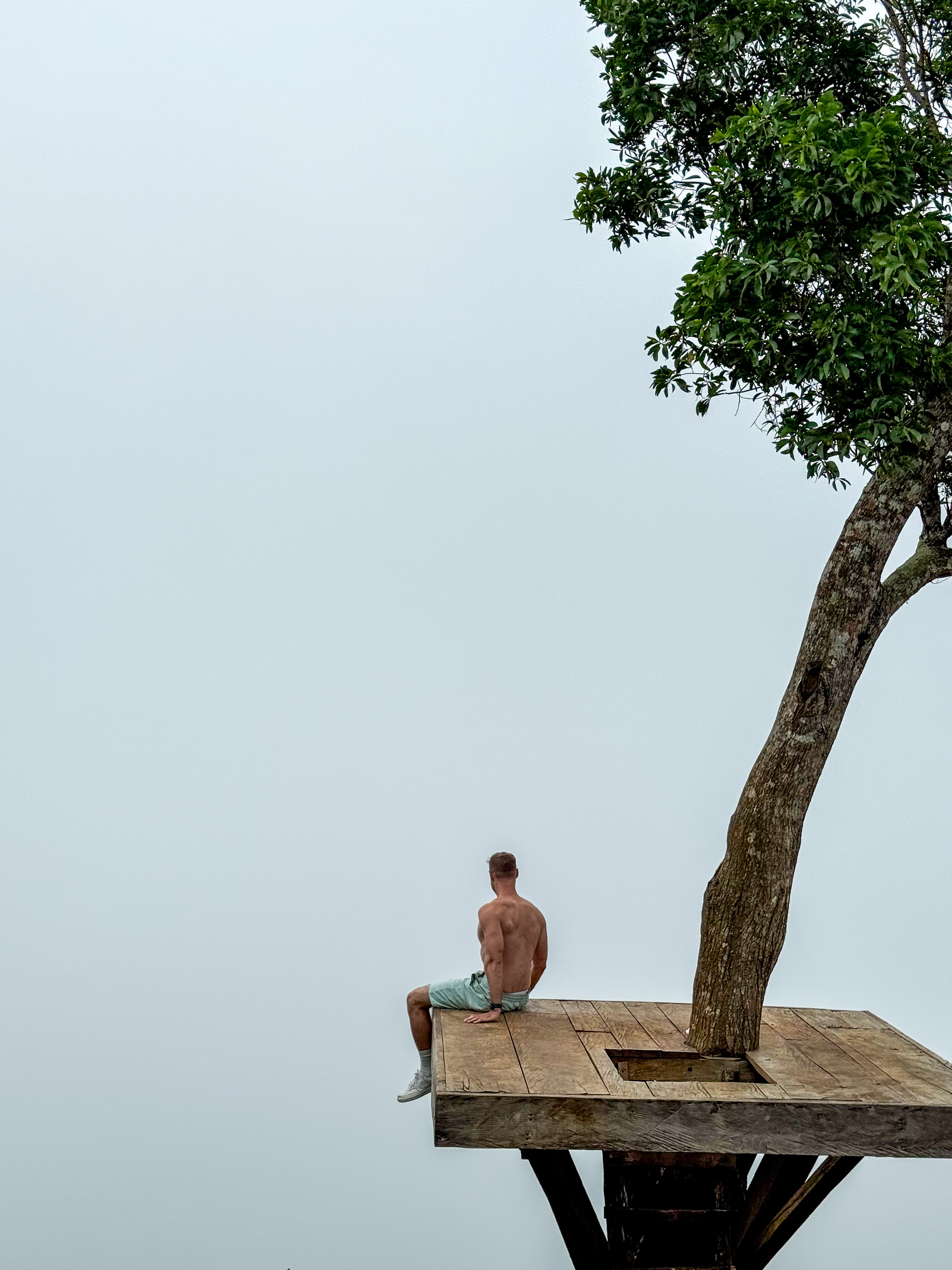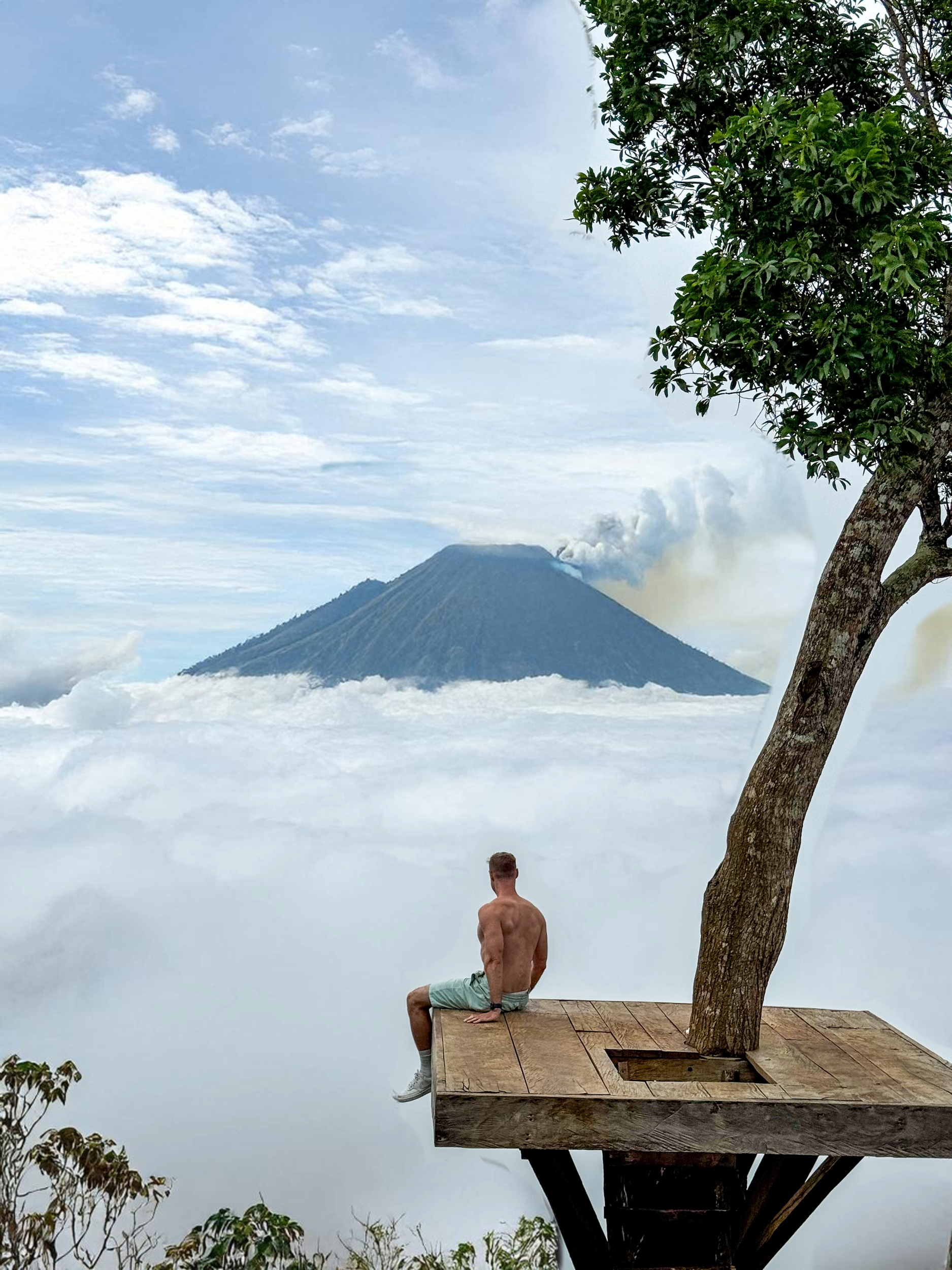Le lendemain matin, on se dit que l’on va retourner à un autre spot qui a été développé pour faire des photos parfaites pour les réseaux sociaux, ce qui est finalement devenu la spécialité de Bali. On part assez tôt pour grimper avec le scooter à Lahangan Sweet, qui se trouve de l’autre côté de la montagne, pour cela il faut prendre une petite route très pentue qui serpente au milieu de la forêt. Alors qu’il faisait beau à Amed, ici on est en plein milieu des nuages. On a quand même une belle vue sur la mer, une image qui nous ferait presque penser à l’île de la Réunion.