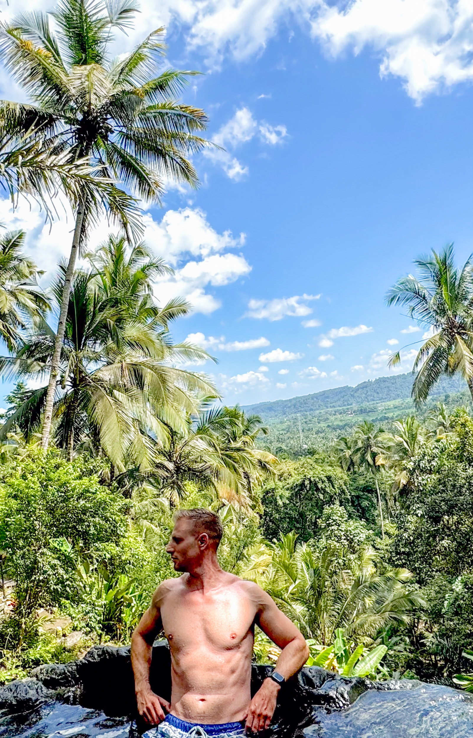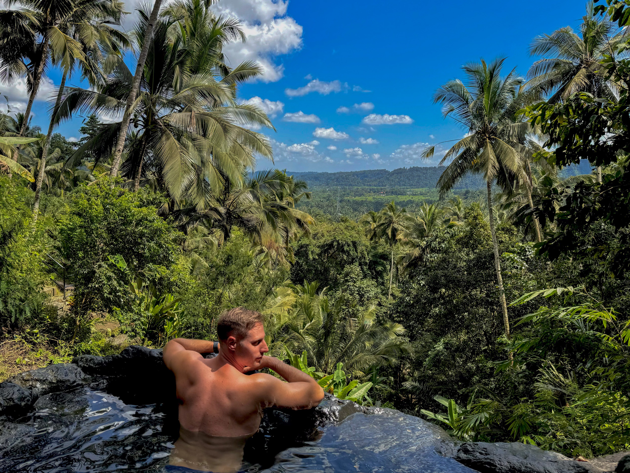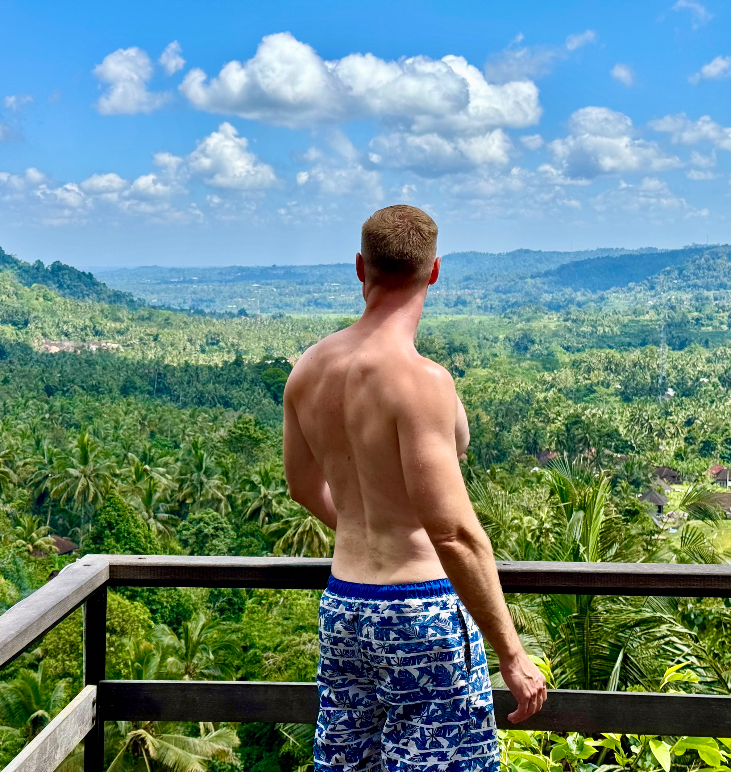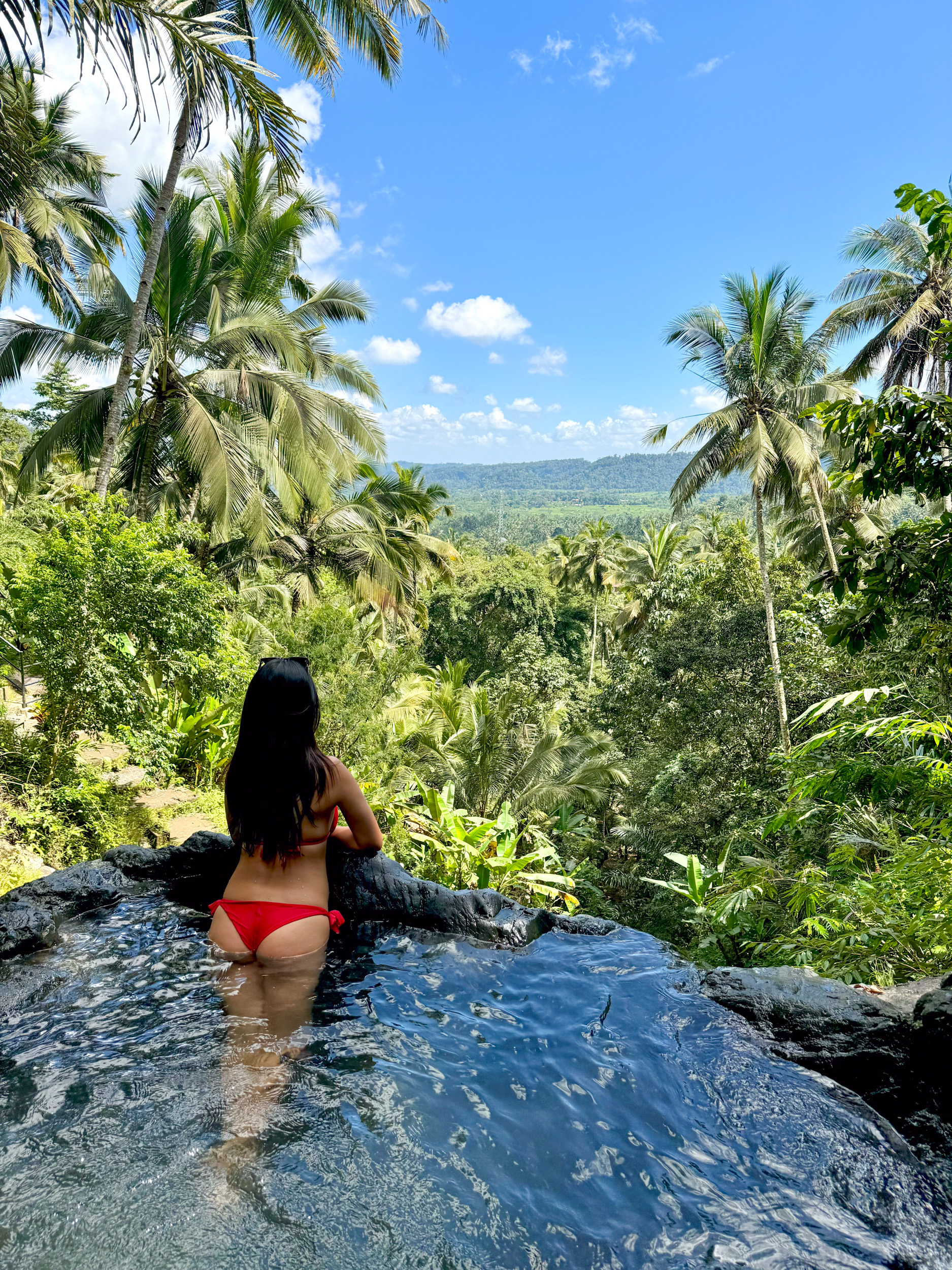 Le lendemain matin, on se dit que l’on va retourner à un autre spot qui a été développé pour faire des photos parfaites pour les réseaux sociaux, ce qui est finalement devenu la spécialité de Bali. On part assez tôt pour grimper avec le scooter à Lahangan Sweet, qui se trouve de l’autre côté de la montagne, pour cela il faut prendre une petite route très pentue qui serpente au milieu de la forêt. Alors qu’il faisait beau à Amed, ici on est en plein milieu des nuages. On a quand même une belle vue sur la mer, une image qui nous ferait presque penser à l’île de la Réunion.