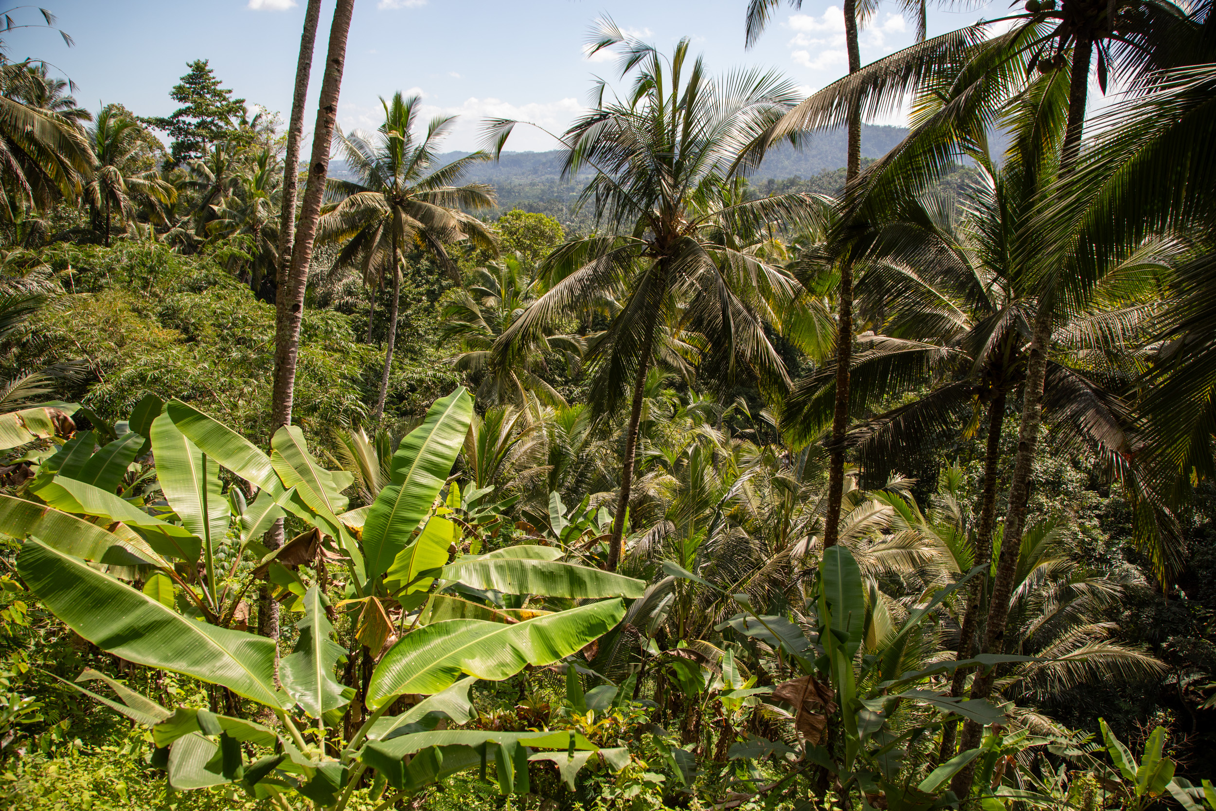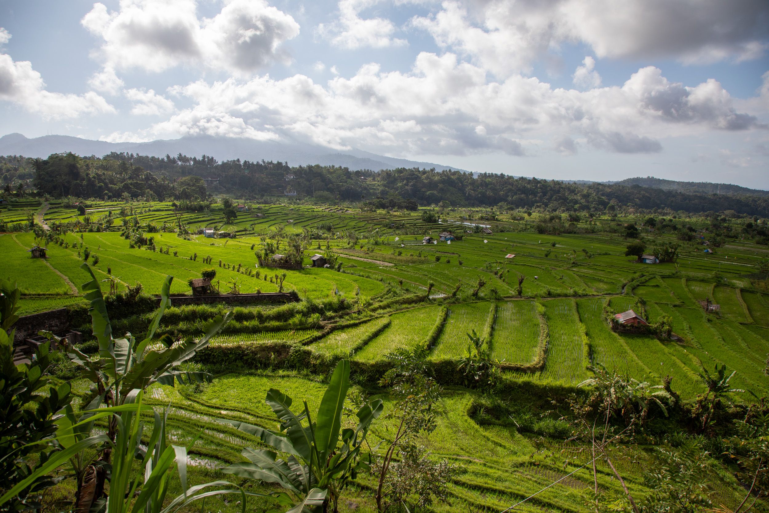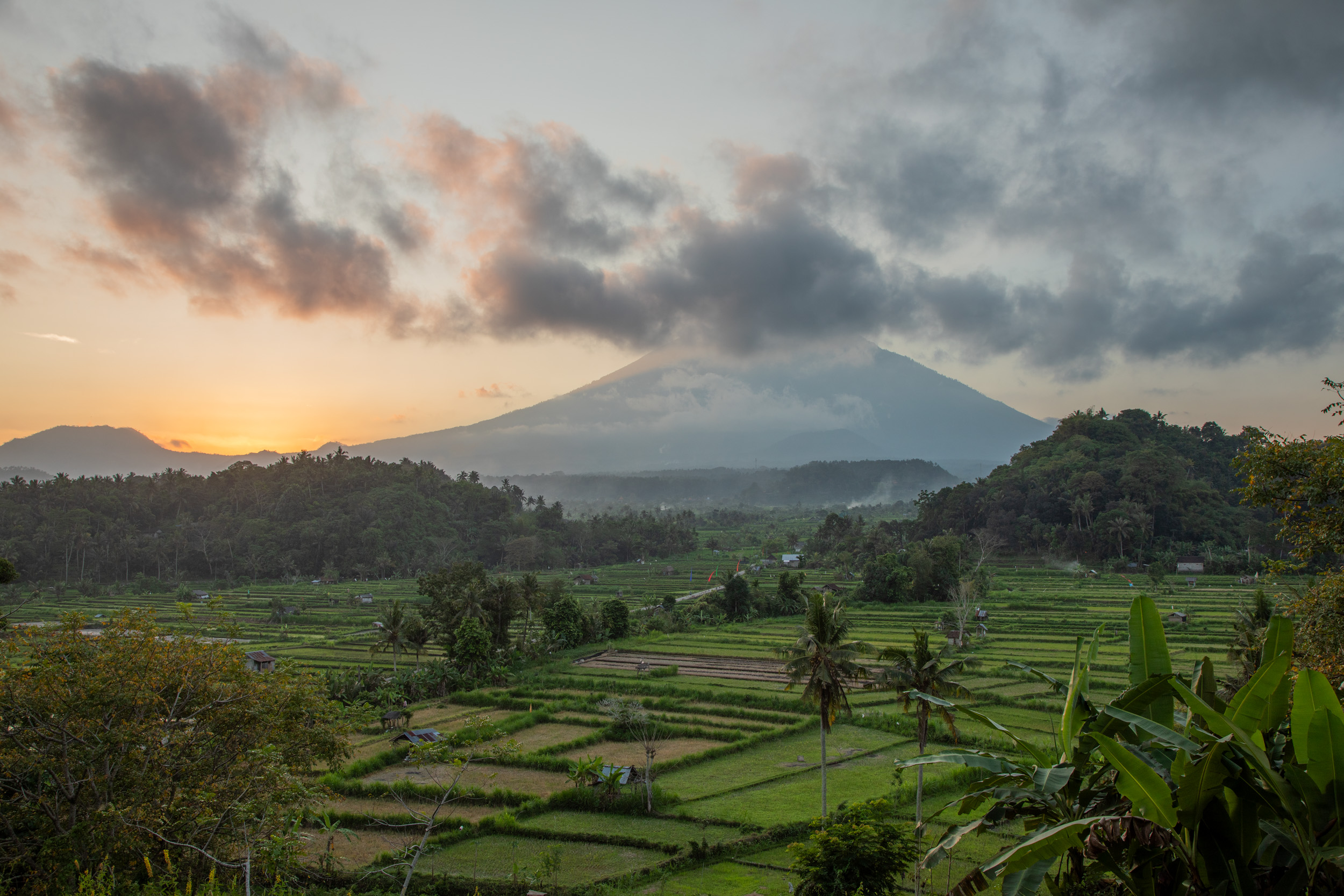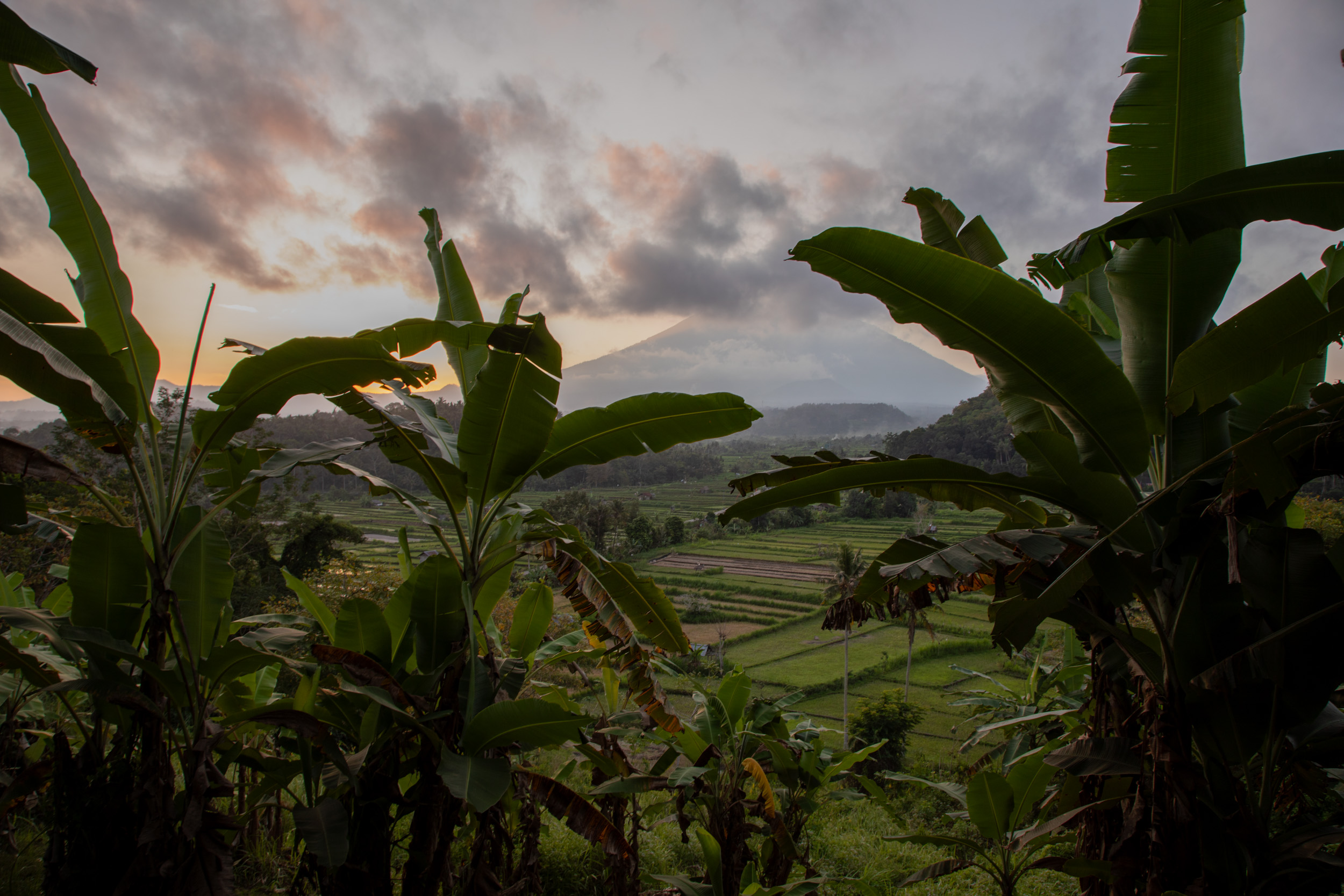 On avait prévu de visiter le palais de Tirta Gangga dans l’après midi mais le temps presse et il y a des bouchons sur la route. Il n’y a pas beaucoup de stations services à Bali (il y a des revendeurs d’essence un peu partout par contre) et les camions qui attendent pour faire le plein de diesel bloquent la route sur des kilomètres. La police est obligée d’intervenir mais cela n’aide pas beaucoup. Finalement ils se rangent sur le bas côté pour laisser passer les voitures et on s’en sort enfin. Puisque l’on a plus le temps d’aller au palais, on décide de bifurquer pour au moins aller voir le coucher de soleil sur le volcan Agung depuis un point de vue avantageux vu que l’heure arrive. On rejoint le point de vue de Bukit Cinta, on est au milieu des bananiers sur une colline, on domine une plaine, on est face au volcan.
