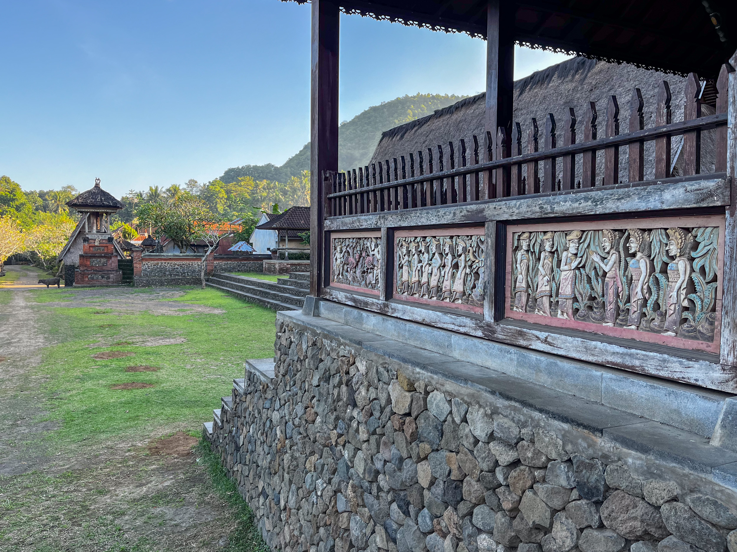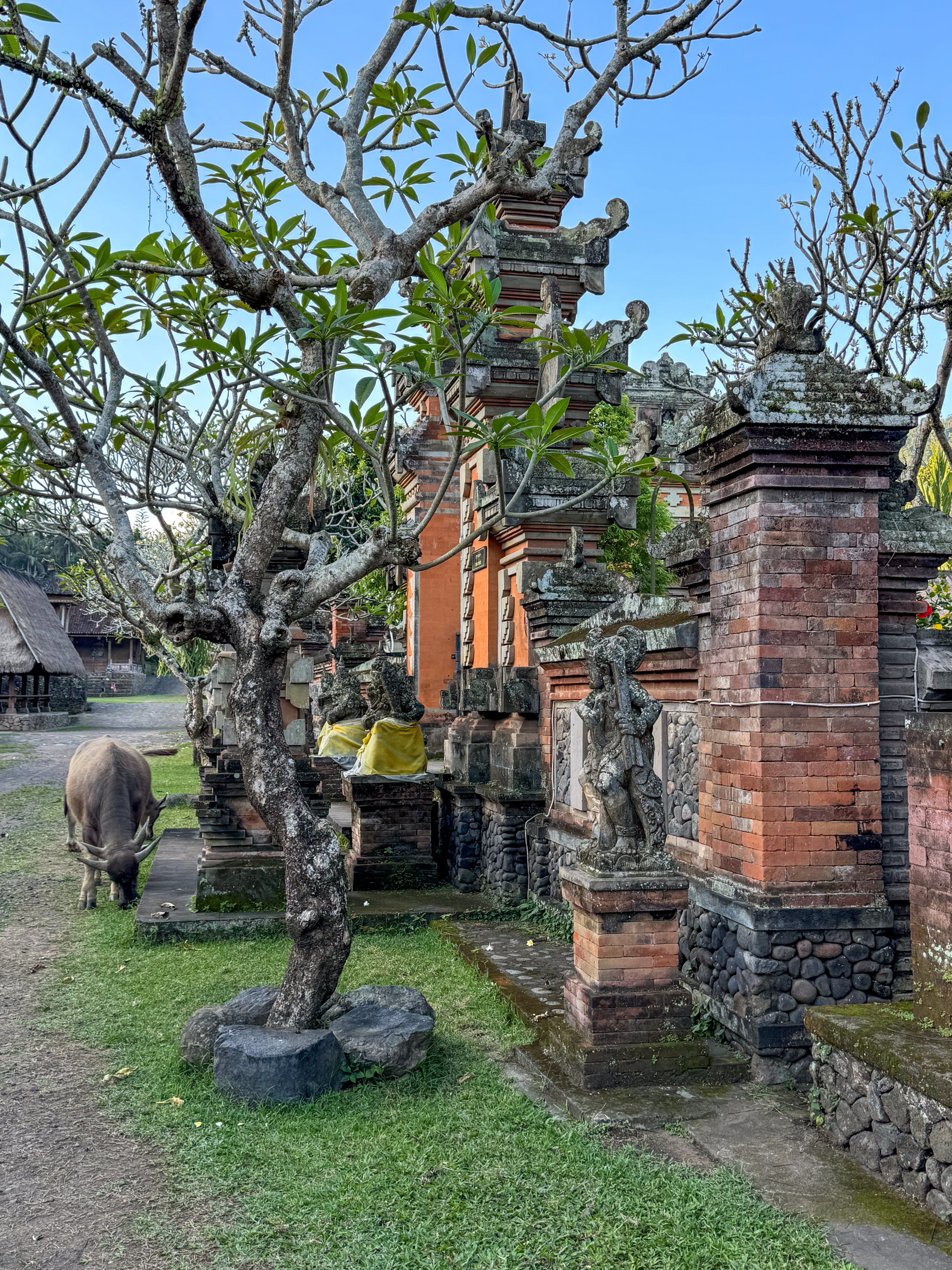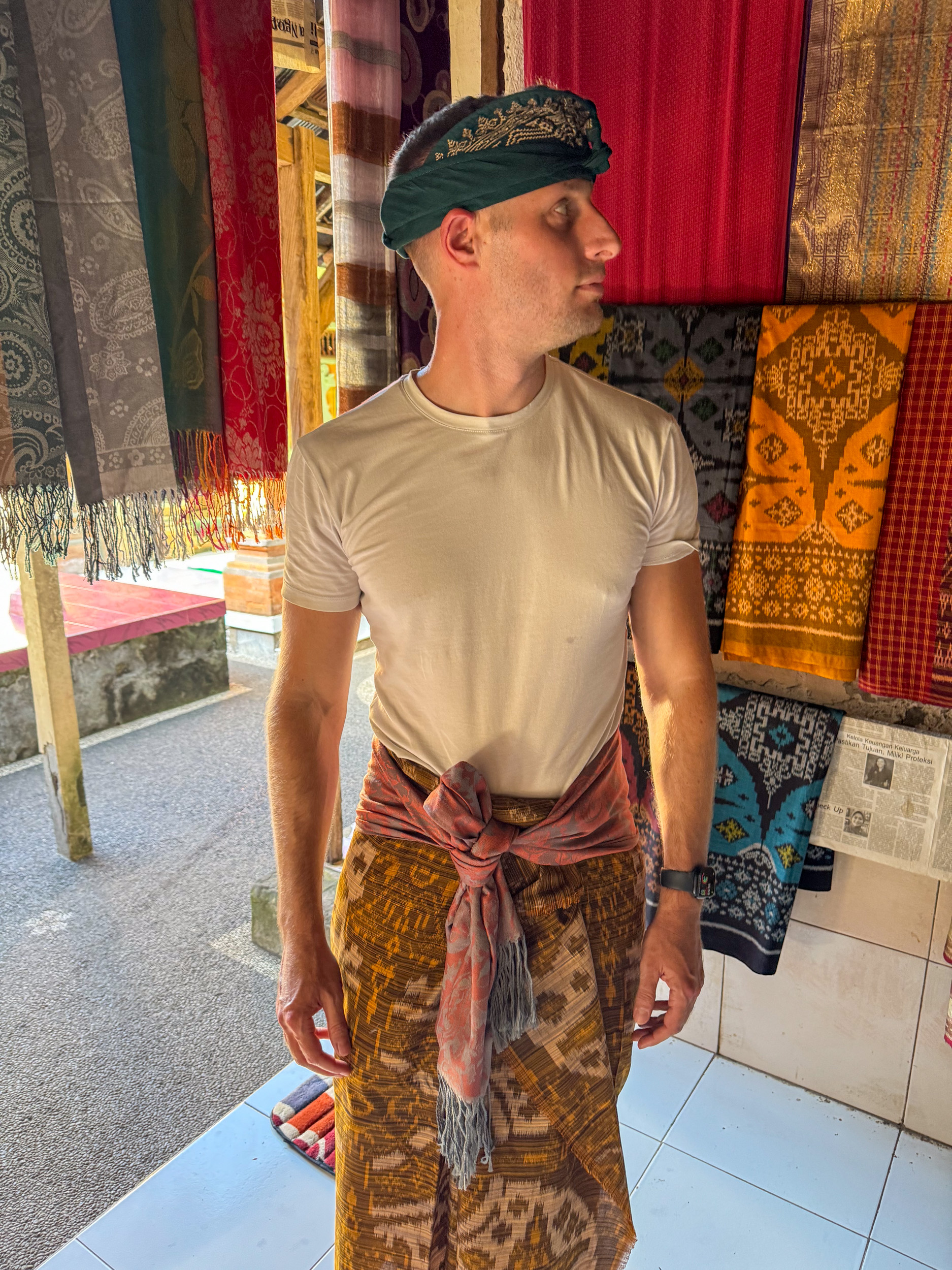 On reprend après déjeuner pour visiter le village de Tenganan, le plus vieux village de Bali, avec sa culture propre et son textile. Bien sur, l’endroit semble avoir adapté son mode de vie aux touristes et on nous présente pleins de textiles qui seraient fabriqués selon les techniques locales, mais on se laisse quand même tenter et achetons un sarong en double ikat, la spécialité du village.