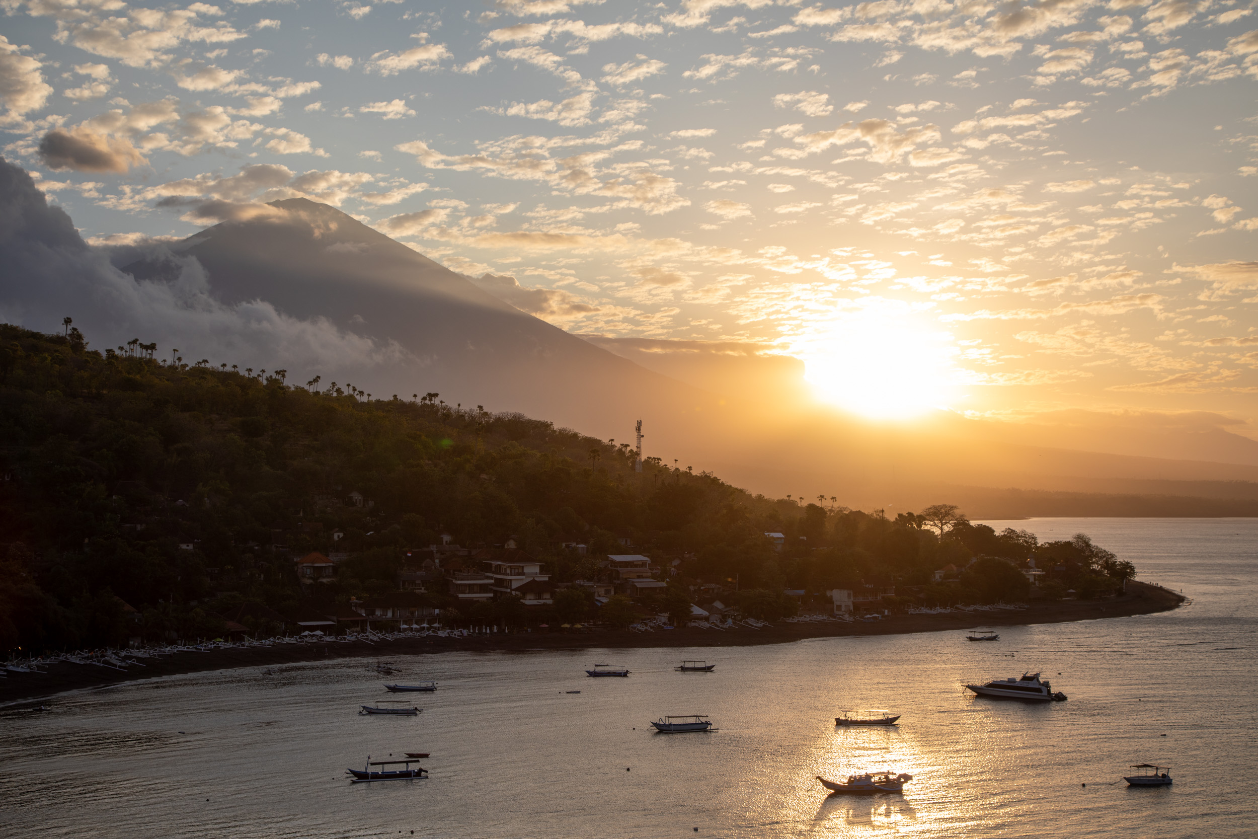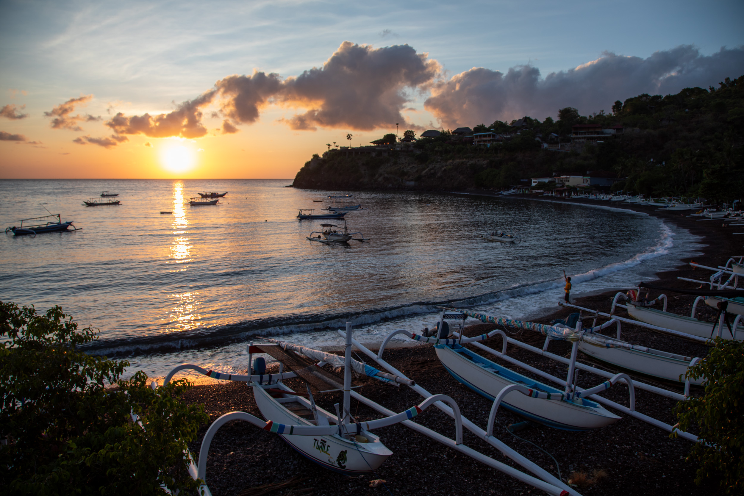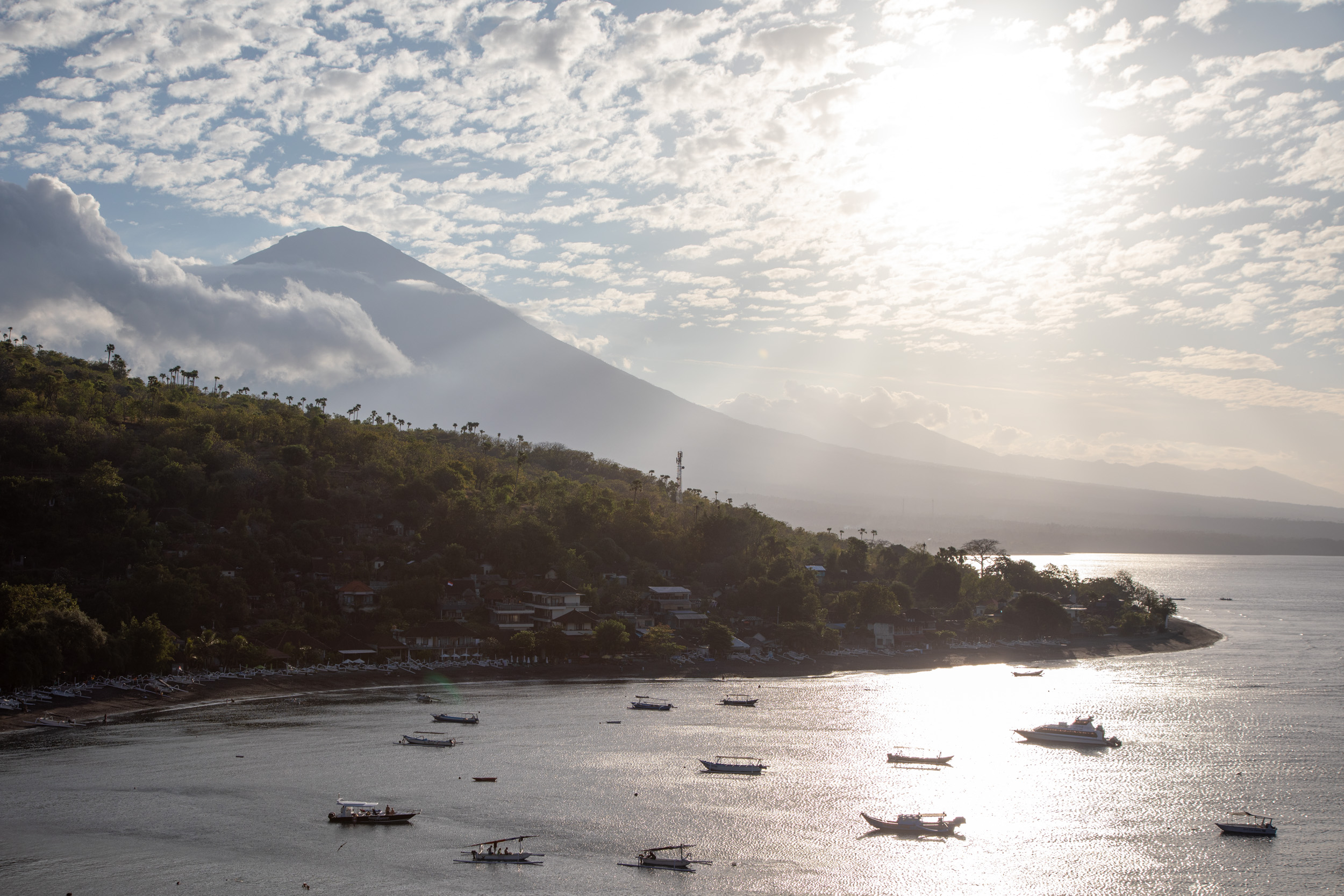 Tout au nord est de Bali, la petite ville d’Ames offre un panorama différent. Ici on quitte les rizières verdoyantes d’Ubud pour les plages de sable volcanique et les fonds marins exceptionnels, tout cela avec l’imposant volcan Agung en toile de fond. Amed sera notre deuxième coup de cœur après Ubud. On ne s’attendait pas à trouver un refuge aussi tranquille dans ce coin de l’île, si accessible et pourtant si calme.
