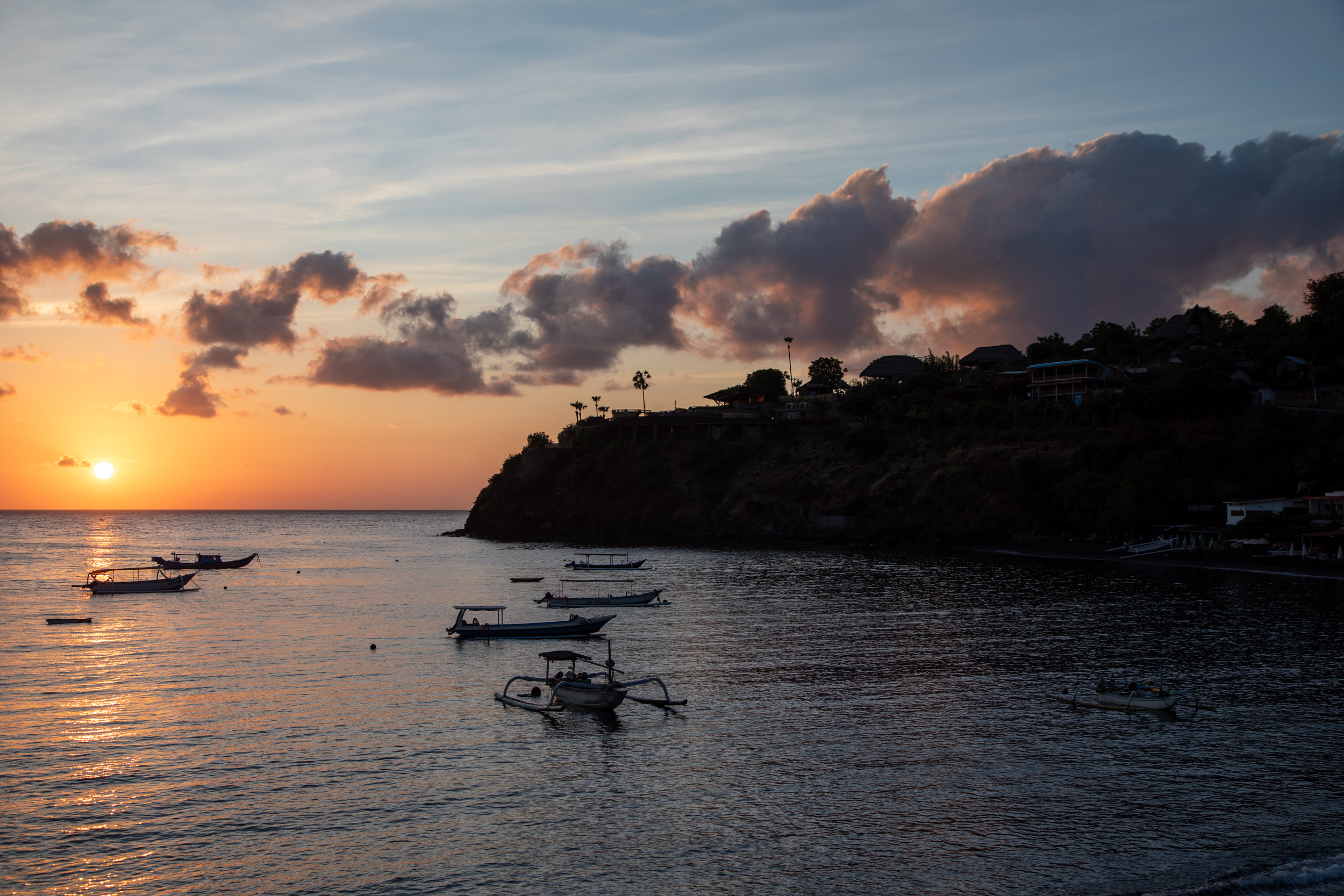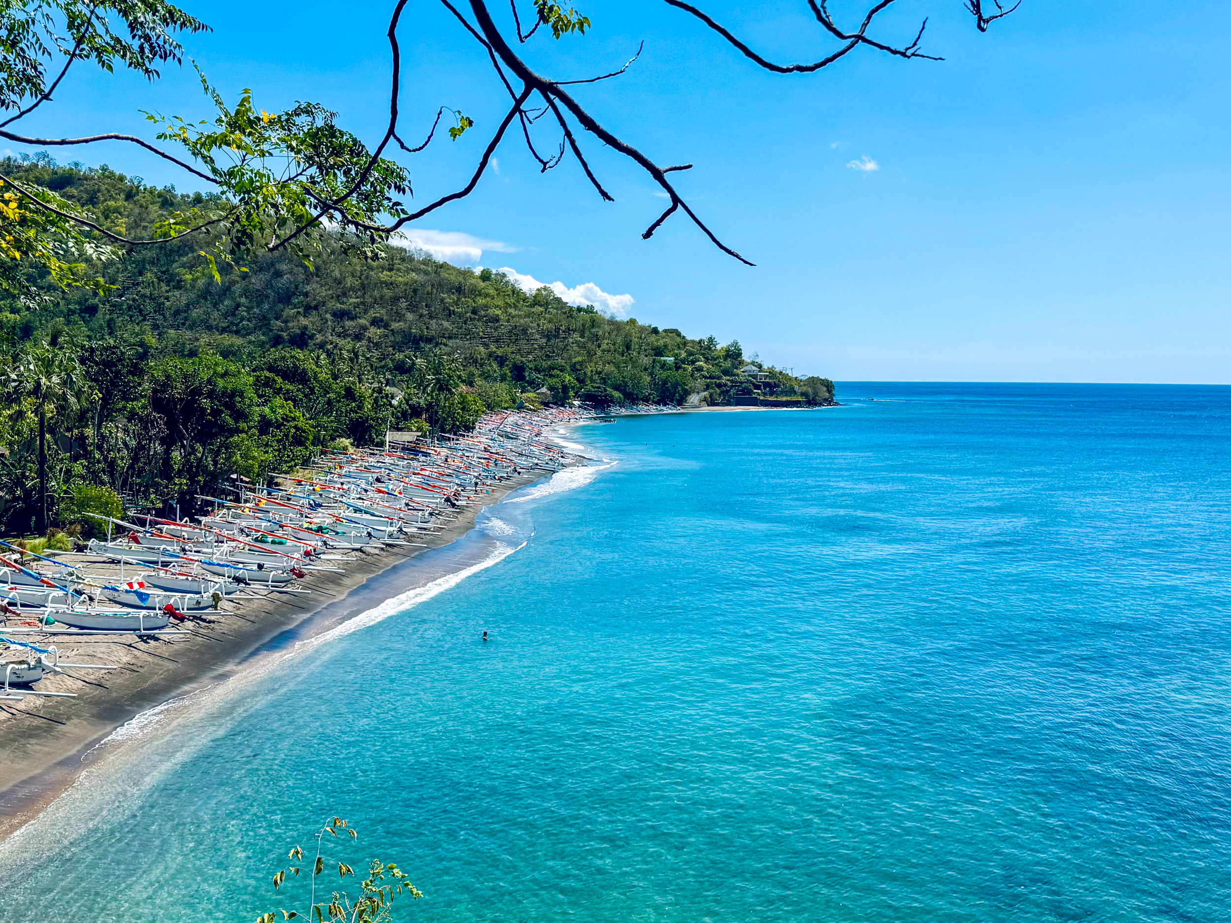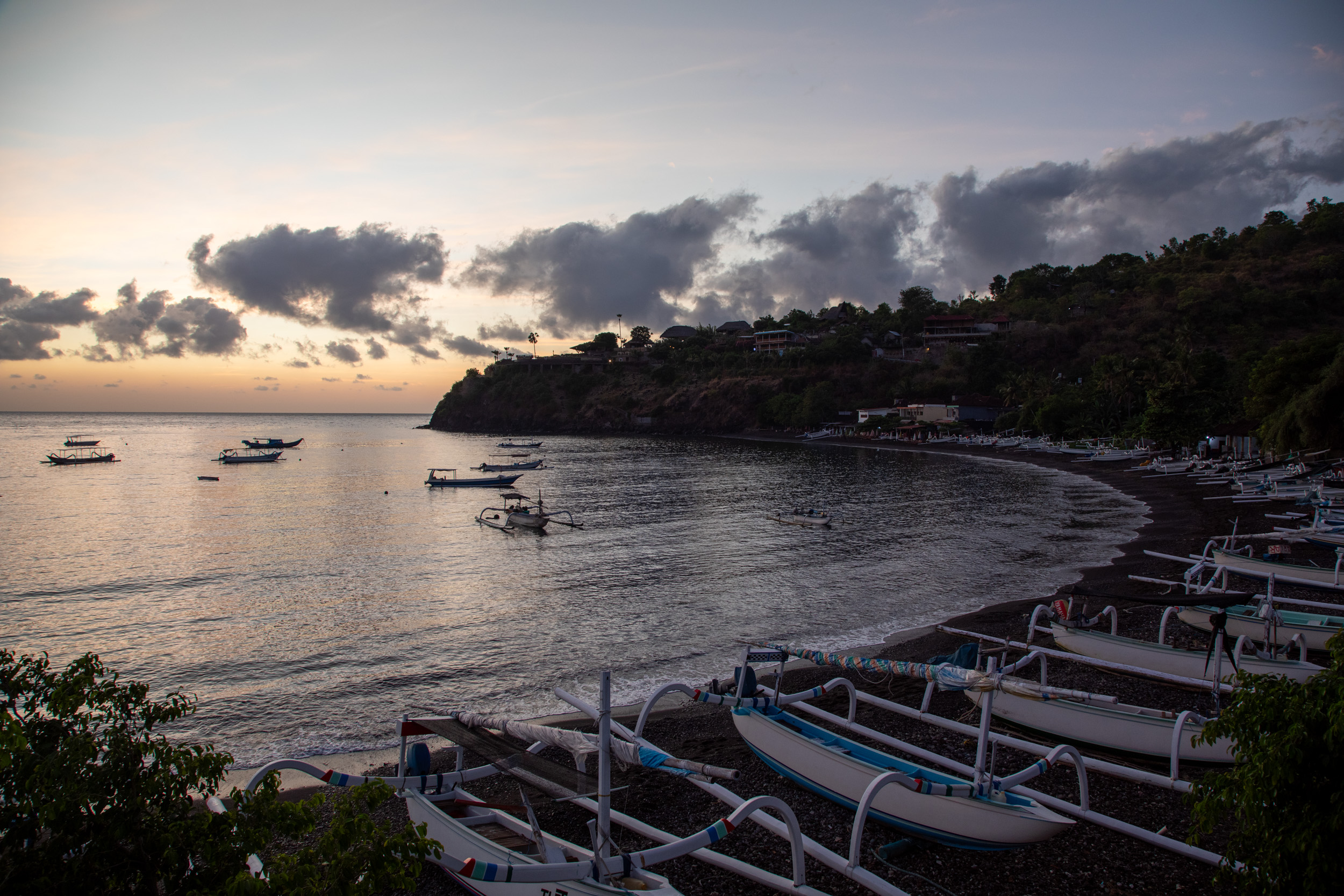 Tout au nord est de Bali, la petite ville d’Ames offre un panorama différent. Ici on quitte les rizières verdoyantes d’Ubud pour les plages de sable volcanique et les fonds marins exceptionnels, tout cela avec l’imposant volcan Agung en toile de fond. Amed sera notre deuxième coup de cœur après Ubud. On ne s’attendait pas à trouver un refuge aussi tranquille dans ce coin de l’île, si accessible et pourtant si calme.