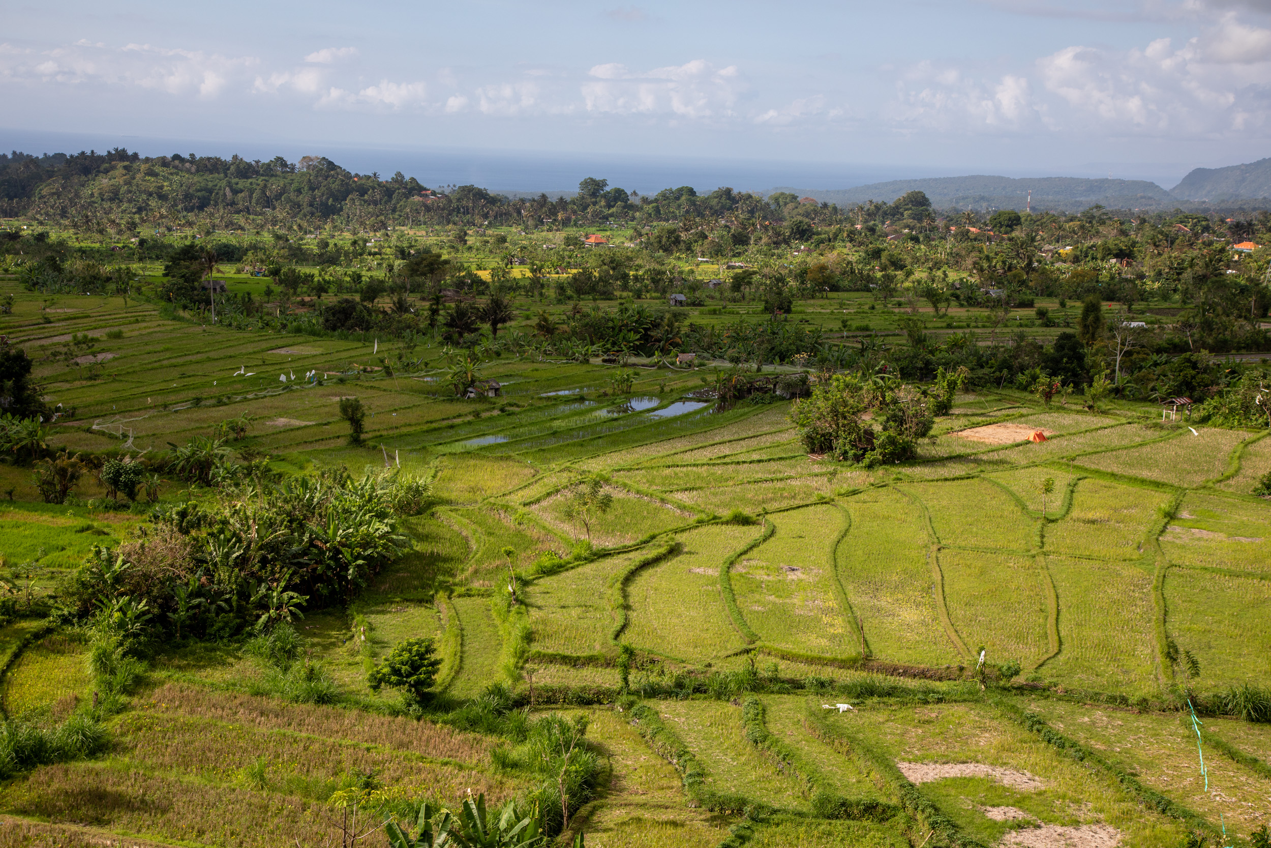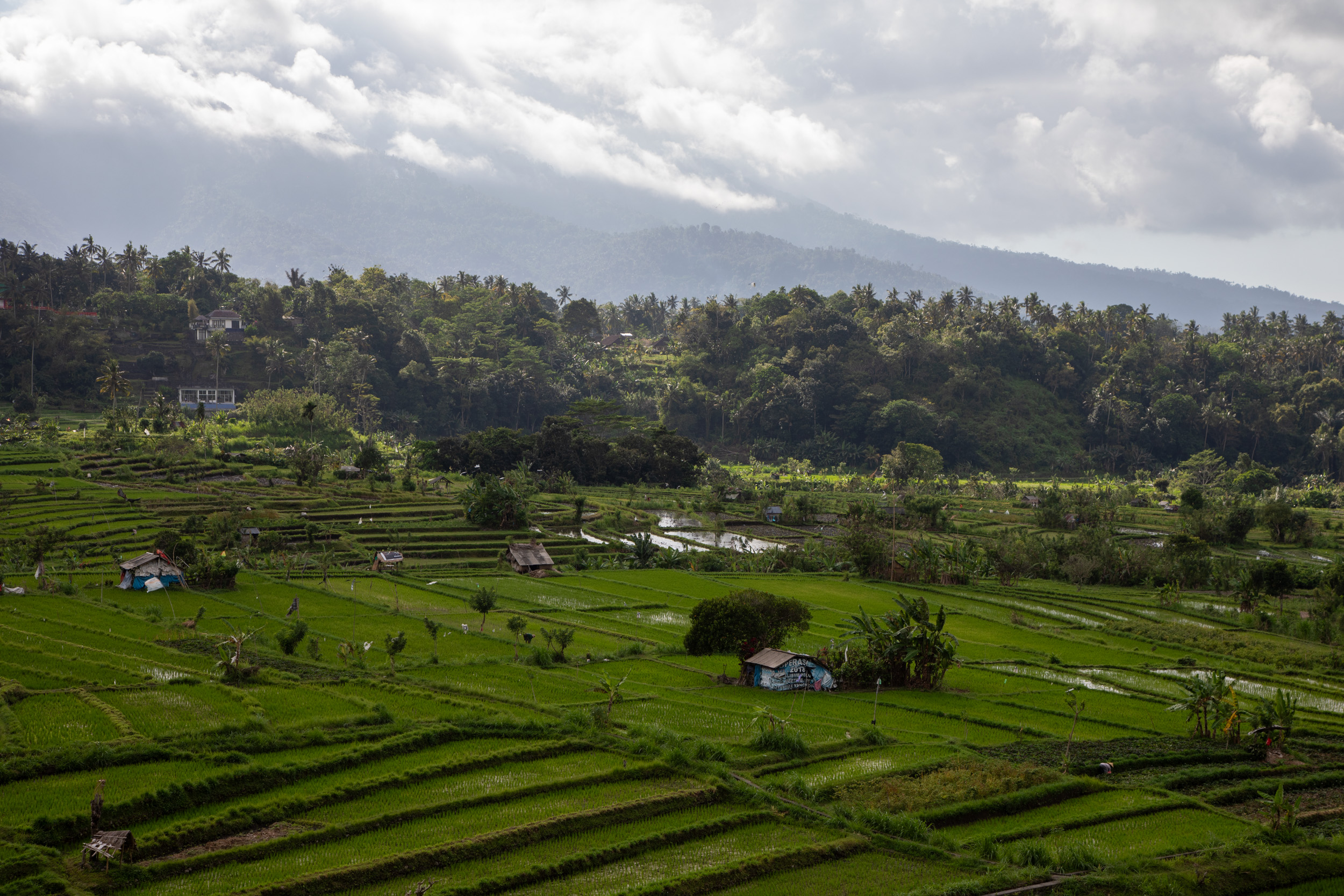 On se verrait rester plus longtemps à Amed, c’est vraiment une autre facette de Bali, plus balnéaire mais sans non plus qu’il y ait une grosse pression touristique. Les touristes viennent jusqu’ici pour profiter des fonds sous marins, mais il y a beaucoup de choses à faire autour, c’est une très bonne base pour visiter l’Est de Bali. D’ailleurs le palais de Tirta Gangga est à seulement à trente minutes de scooter. Il faut par contre remonter le col, on est bien content d’avoir pris un gros engin cette fois, sinon on aurait galéré à deux sur notre monture. Sur la route, on peut s’arrêter pour contempler de magnifiques rizières.