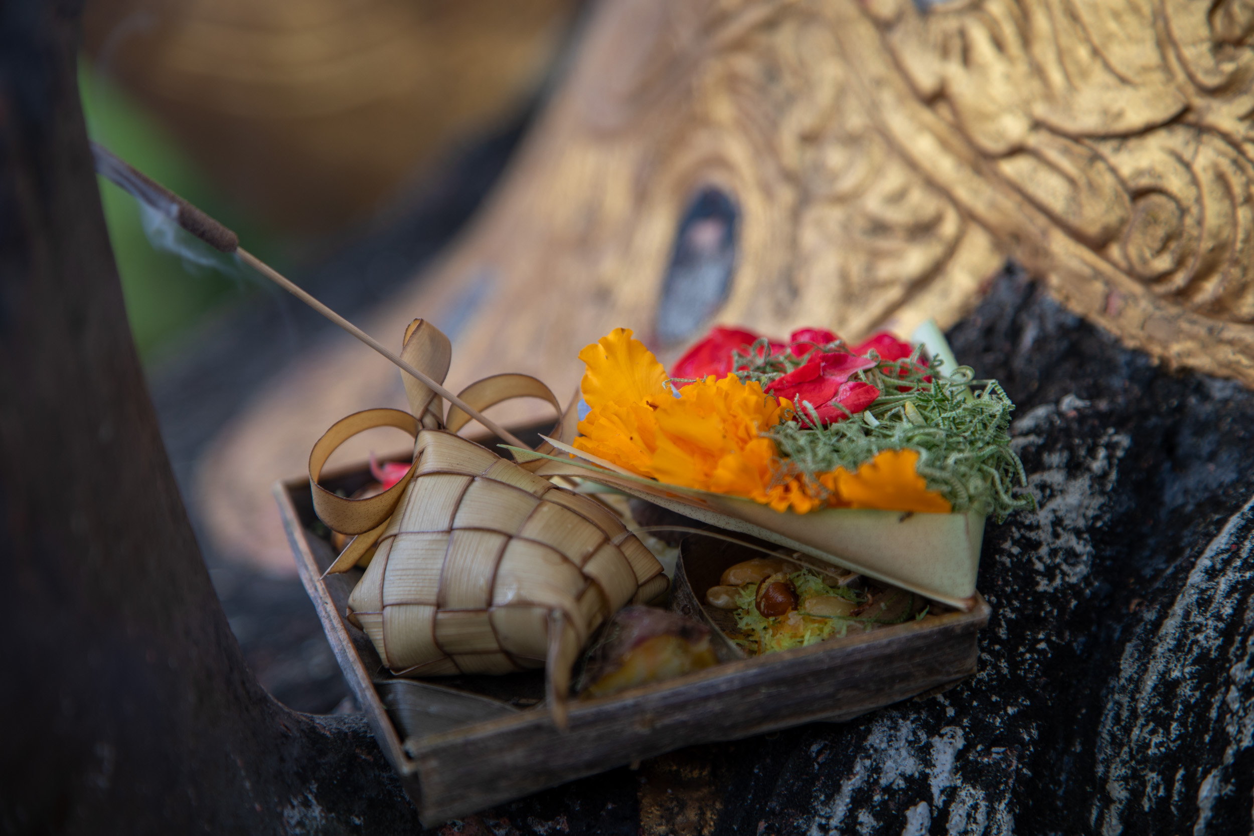 Des femmes ont déposées des offrandes sur une statue, on ne comprend pas le sens et les détails de la spiritualité balinaise, mais on la trouve très douce et accueillante.