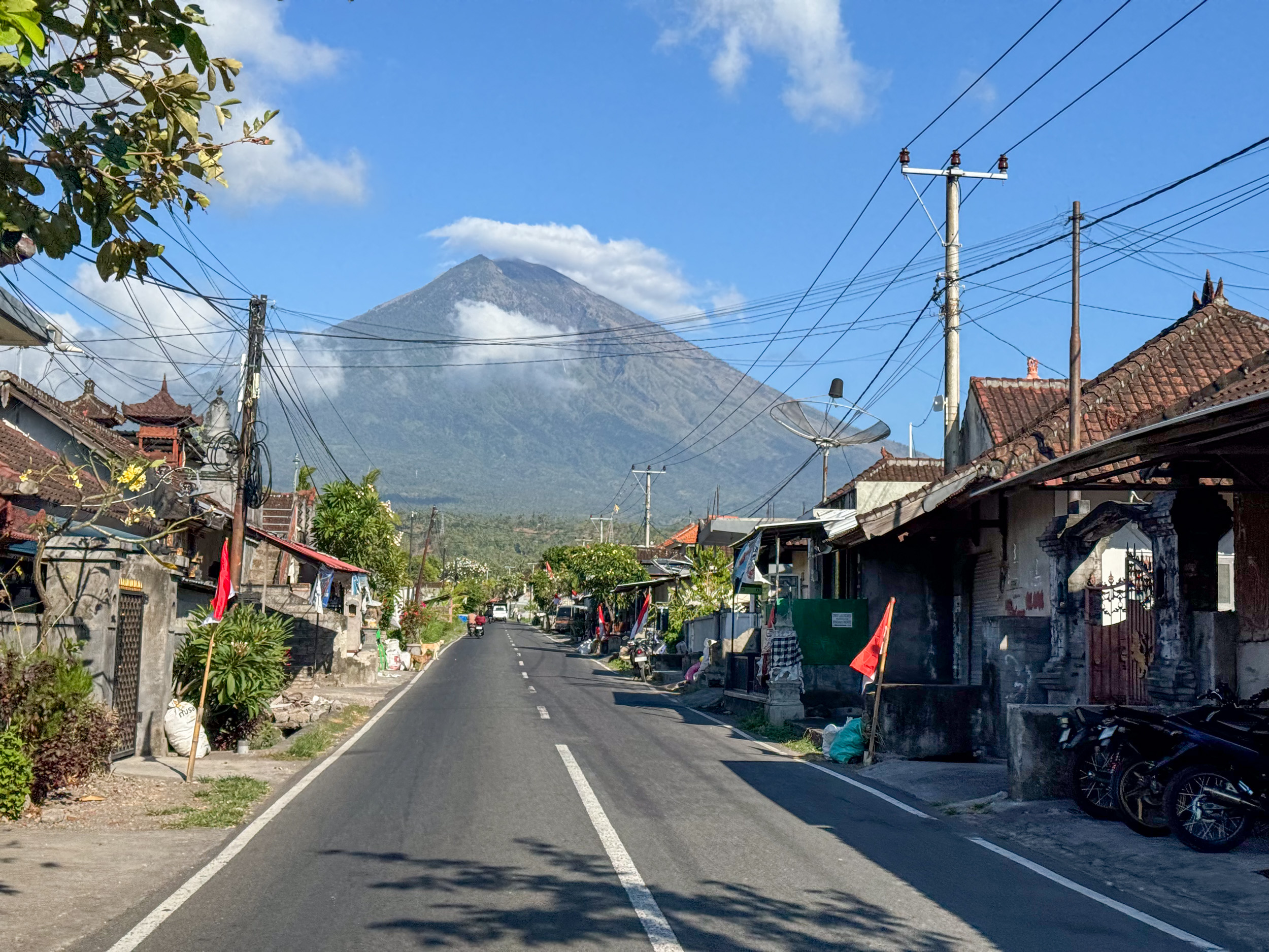 Etant donné que l’on était arrivé trop tard la veille pour aller à Tirta Gangga, on y retourne ce matin. On part d’abord louer un scooter pour avoir notre liberté puis on est prêt pour partir. La route traverse Amed, le village est vraiment sans prétention, très agréable et le volcan Agung domine l’horizon.