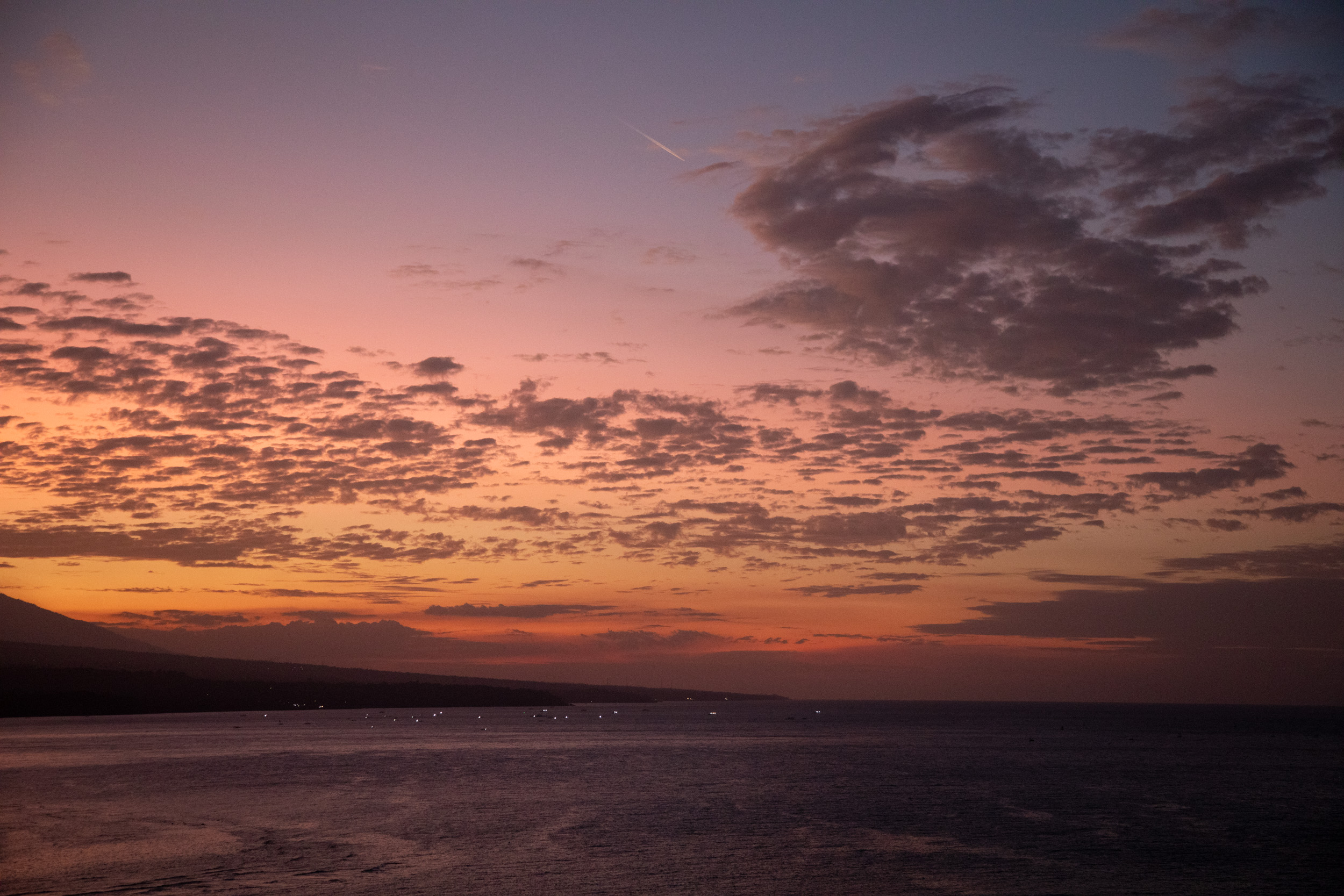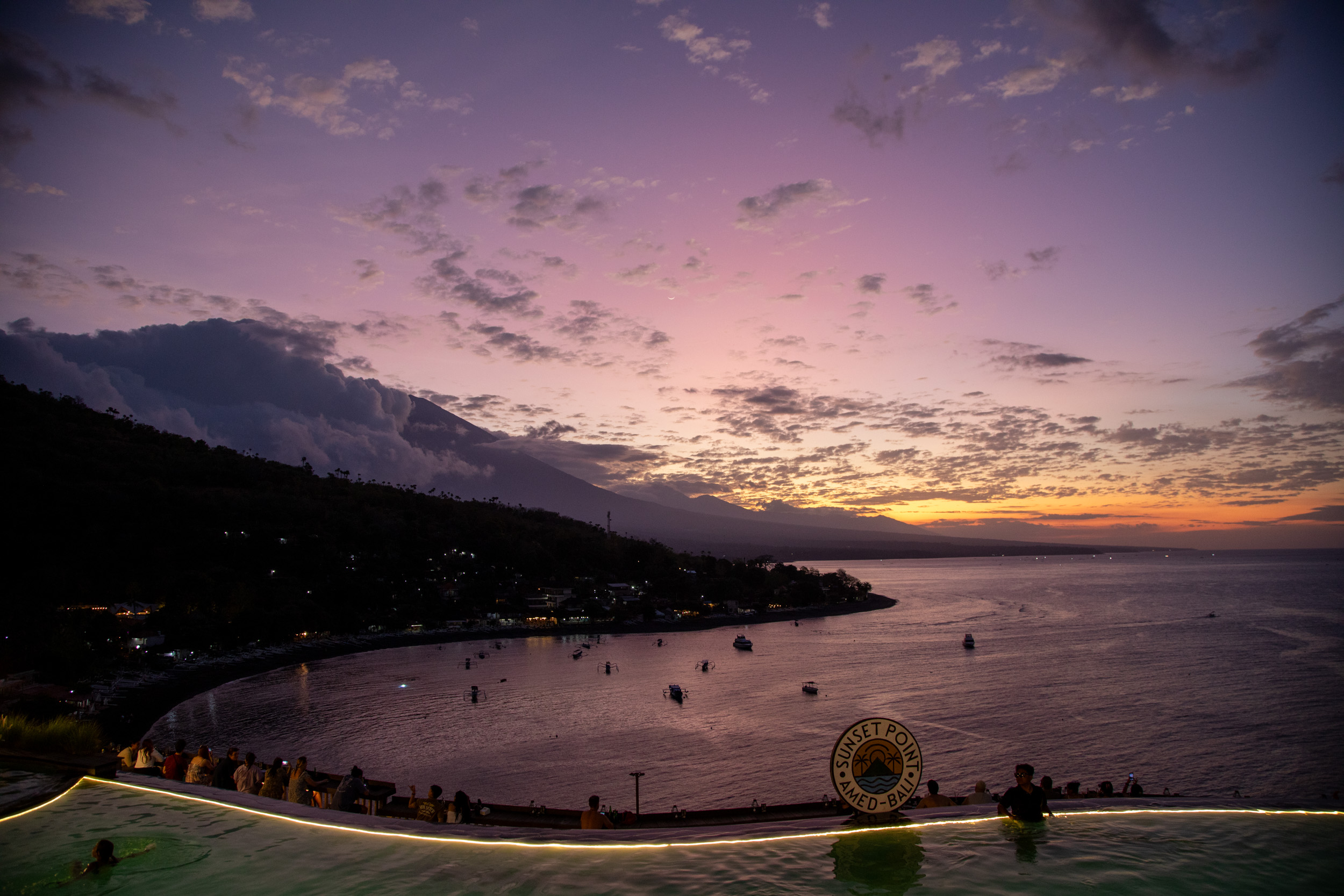 En fin de journée, on se change et on rejoint le fameux Sunset Point, le meilleur endroit pour voir le coucher de soleil de tout l’Est de Bali, et peut être bien de tout Bali même. Ce bar longe a une piscine qui donne sur la baie de Pantai Jemeluk, avec en toile de fond le volcan Agung et le soleil qui vient se coucher en face de nous. Quel endroit fantastique. On retrouve ici l’atmosphère très Bali que l’on avait à Ubud, un mix entre local et tourisme, bien fait, en équilibre, où on se sent bien.