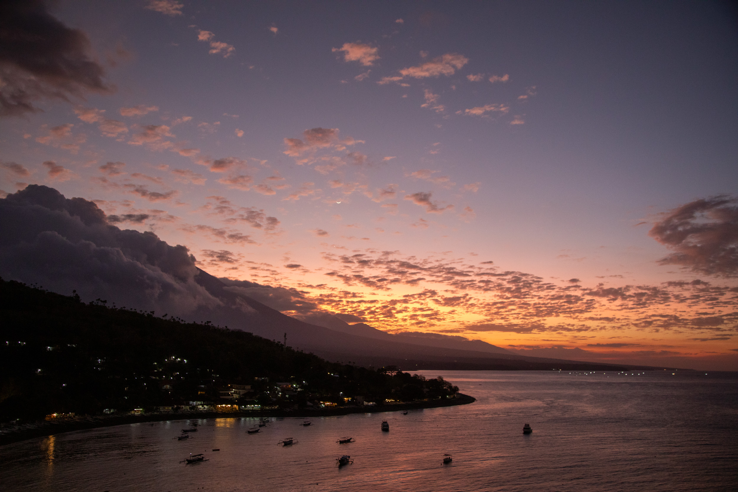 On arrive finalement de nuit à Amed, notre modeste hotel est face à la mer dans une immense chambre avec une terrasse, probablement un de nos meilleurs logements du séjour. Le lendemain matin, on se lève avec le soleil, on a le droit à un lever de soleil face à nous et sur la baie de Pantai Jemeluk.