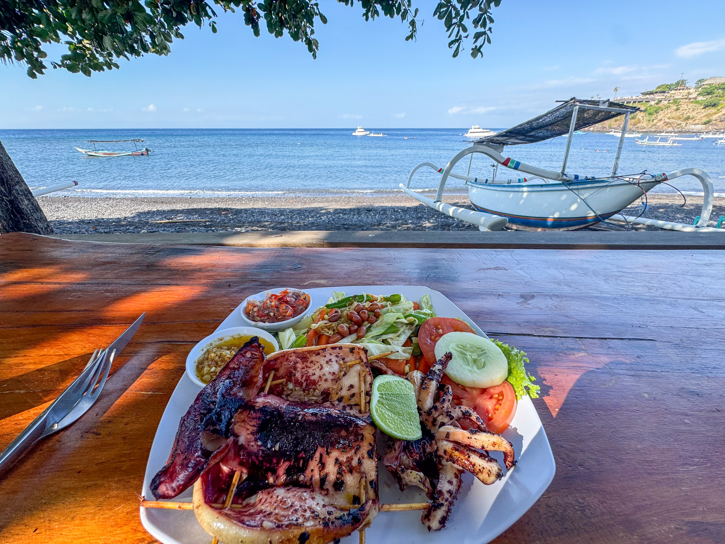 On a vraiment adoré Amed. On s’est dit que l’on pourrait rester une semaine dans notre hotel avec la chambre qui a la terrasse face à la mer, aller nager avec les poissons tous les jours. Manger des fruits de mer. Partir en scooter sur les plages les plus éloignées. Découvrir les différents cafés. C’est vraiment un complément parfait à Ubud. Il y a la même atmosphère facile, agréable, confortable, même si c’est bien sur un peu plus rustique. Amed a été un coup de coeur.