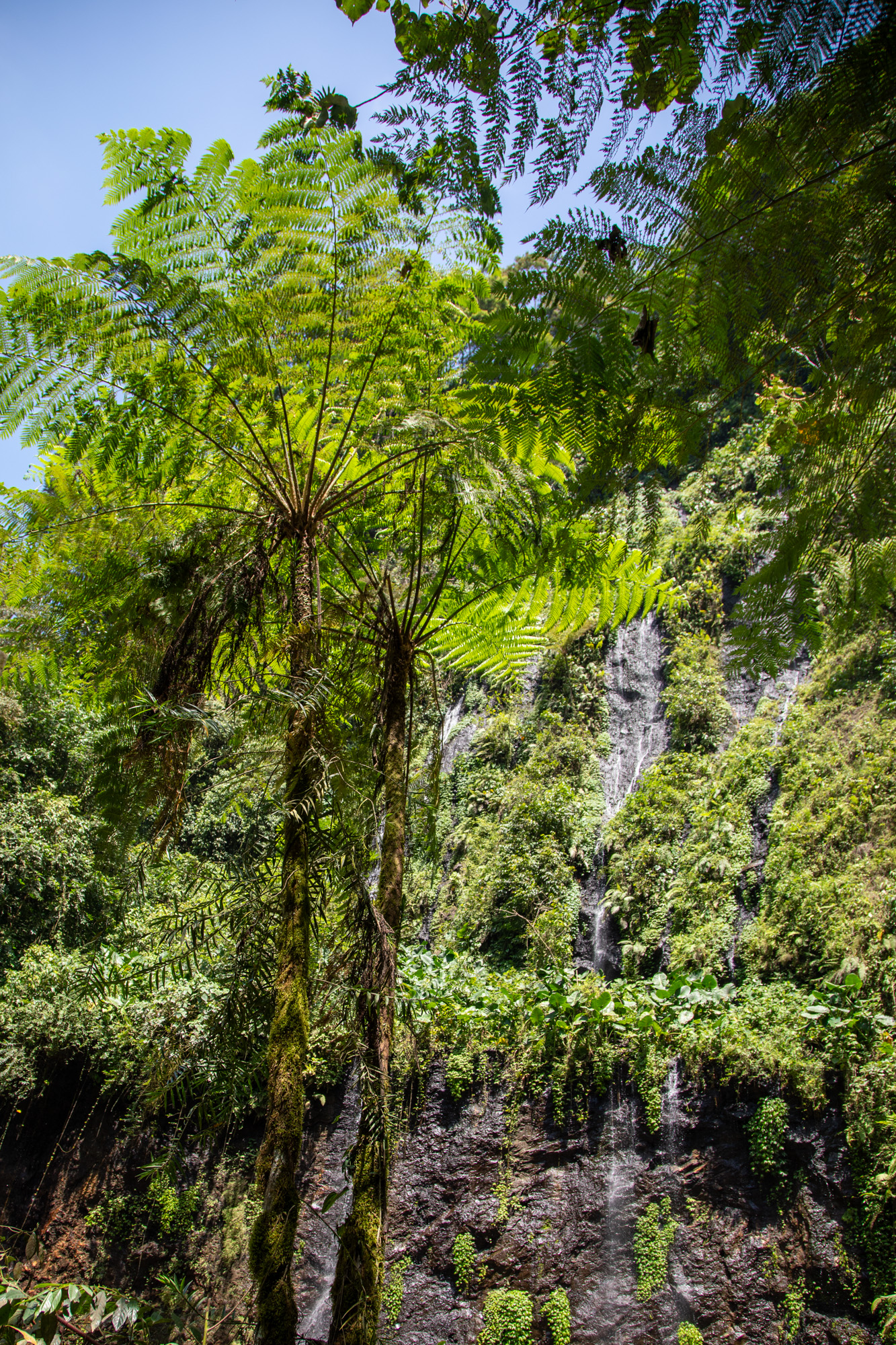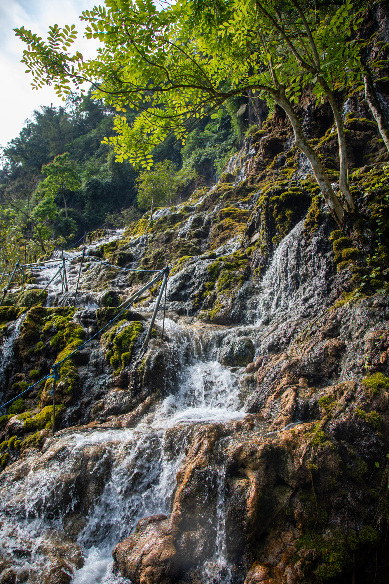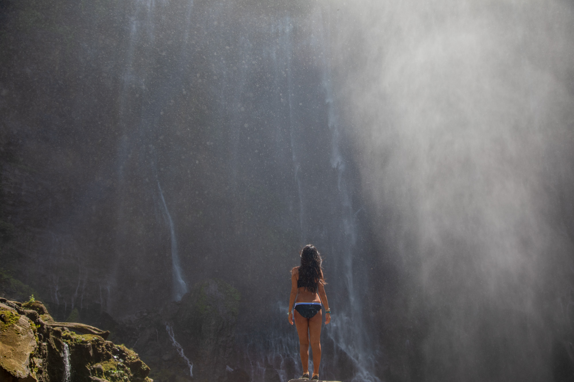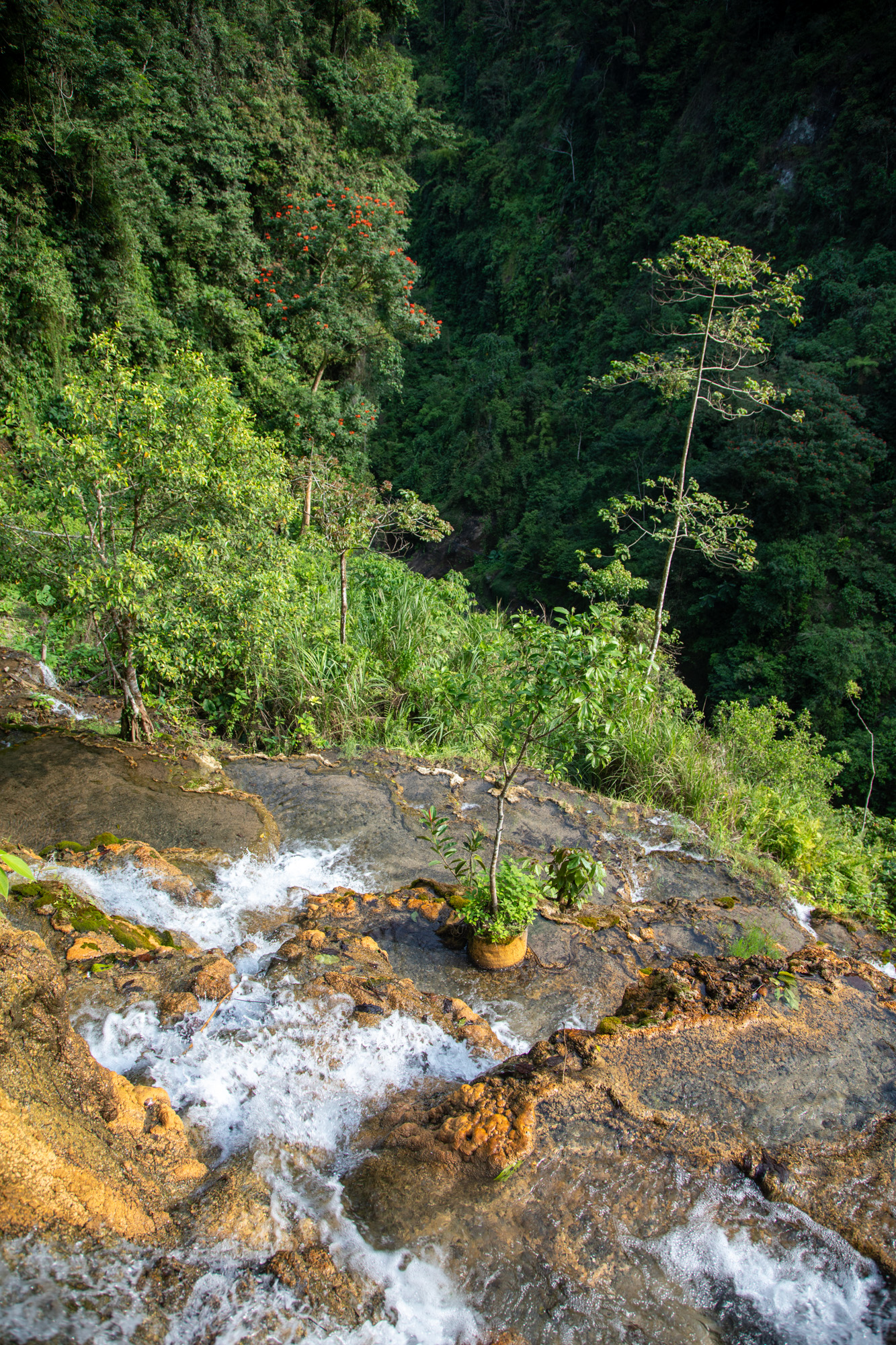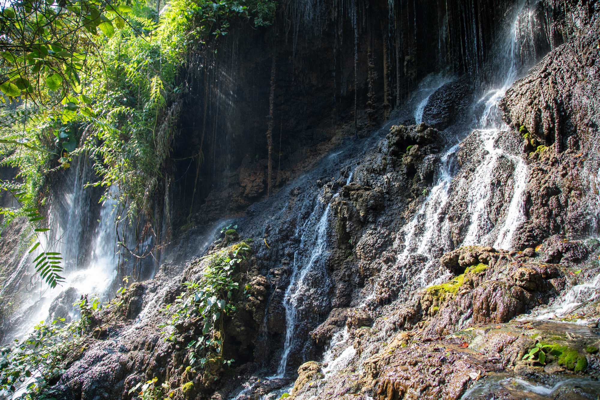 La descente jusqu’au pied de la cascade est épique. On marche dans l’eau qui dévale, le chemin traverse des petites chutes d’eau, il faut absolument louer des chaussures en caoutchouc pour éviter de se faire mal. Il y a de jolis fougères qui arborent le chemin.