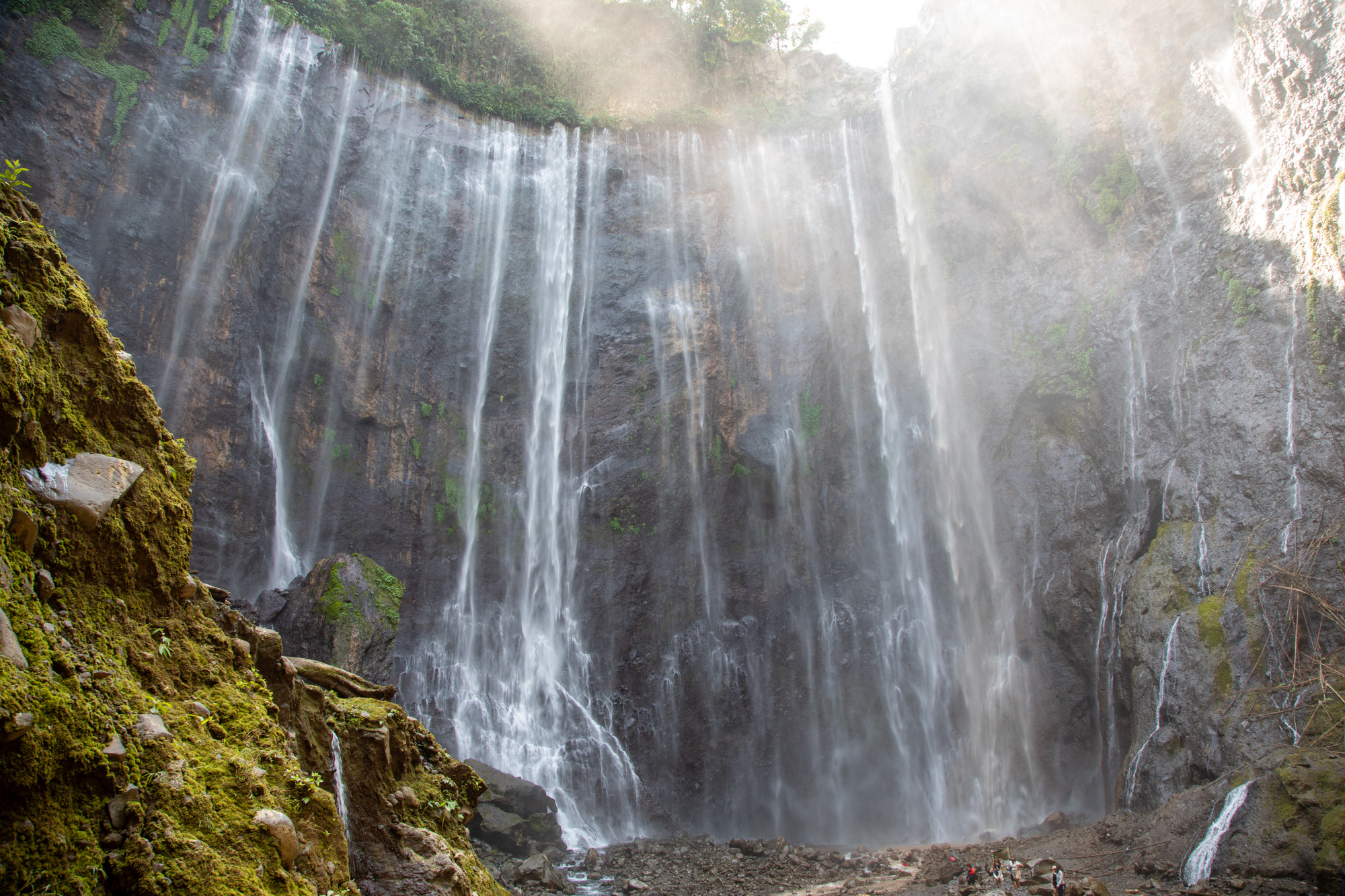 On a vraiment aimé ce petit séjour citadin à Malang. Déjà, cela faisait du bien de dormir dans un bon lit et de manger un bon petit déjeuner diversifié. On a aussi pu trouver une laundry pour tenter de récupérer les couleurs originales de nos vêtements et chaussures après notre journée à Bromo. On reste donc deux jours dans cette ville à l’atmosphère très provinciale, entourée de volcans calmes ou actifs dont notamment le volcan Semeru que l’on voit cracher un nuage de fumée de manière régulière depuis la chambre d’hôtel. Il y a pas mal d’activités à faire autour de Malang, c’est une base intéressante, on décide de réserver un taxi auprès d’une agence à côté de l’hôtel pour nous amener aux cascades de Sewu, à 60 kilomètres ou deux heures de la ville. Le taxi vient nous chercher de bonne heure, et on embarque pour un trajet magnifique dans une région rurale, il y a des plantations, des villages, sous l’ombrage permanent du volcan Semuru. Cette zone a été développée il y a peu pour le tourisme, les cascades de Sewu font partie des trois joyaux de l’Est de Java incontournables, avec le volcan Bromo et le volcan Ijen. Mais il existe d’autres trésors à découvrir, d’autres cascades très belles, et des vues sur le volcan Semuru depuis les villages alentours. On se dit que si on a le temps, on pourra y faire après la visite de la cascade. On arrive en fin de matinée sur le site et un guide vient nous trouver pour nous amener aux chutes qui se trouvent au fond d’une crevasse. On arrive d’abord à un panorama d’où on domine les cascades d’en haut, on est arrivé un peu tard et les nuages recouvrent déjà le sommet du volcan qui est pourtant juste dans l’axe derrière la cascade.