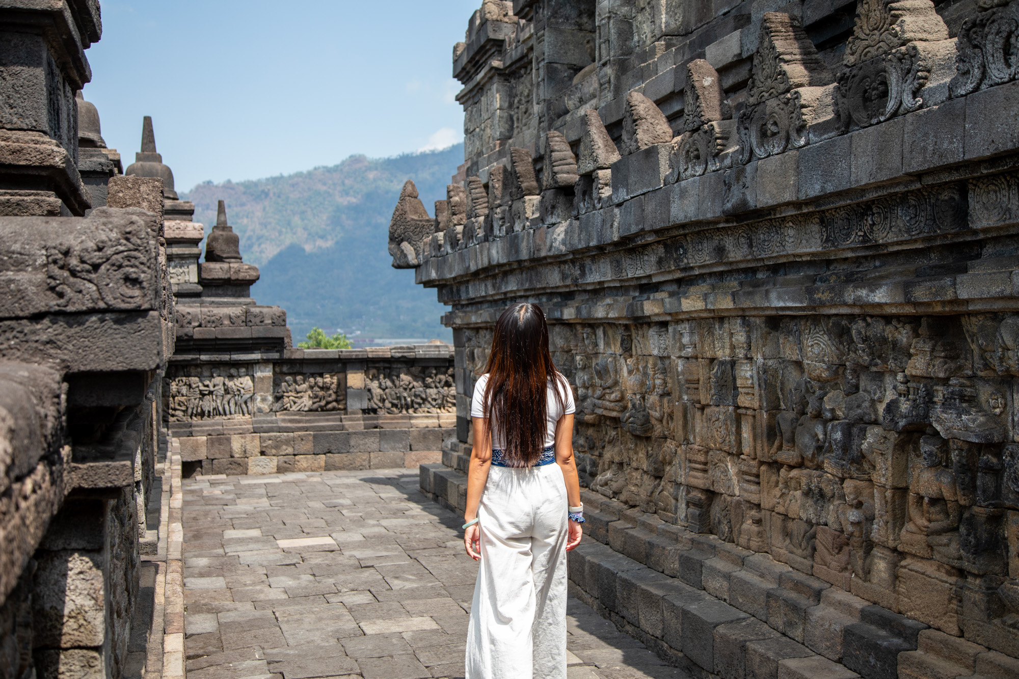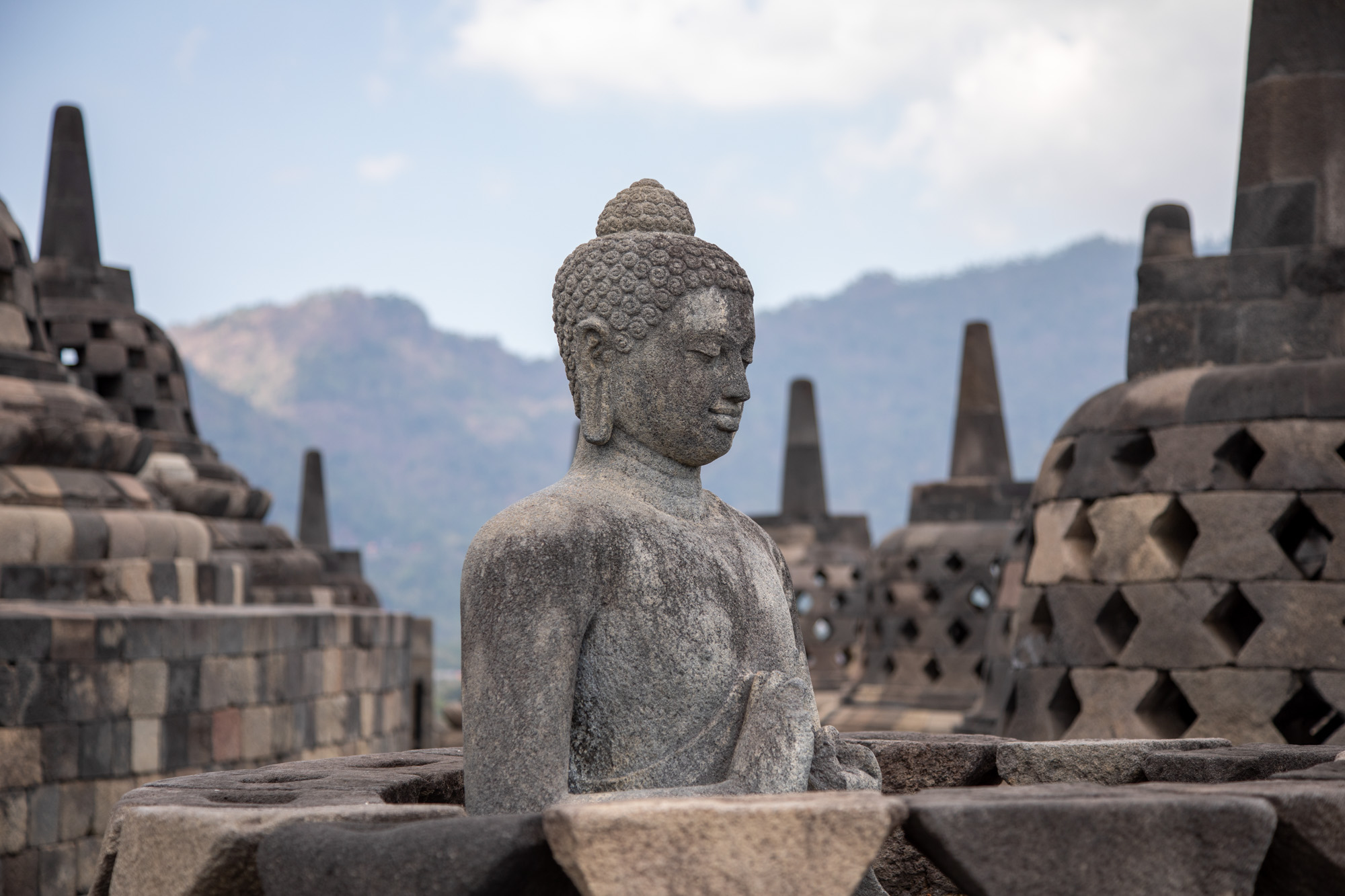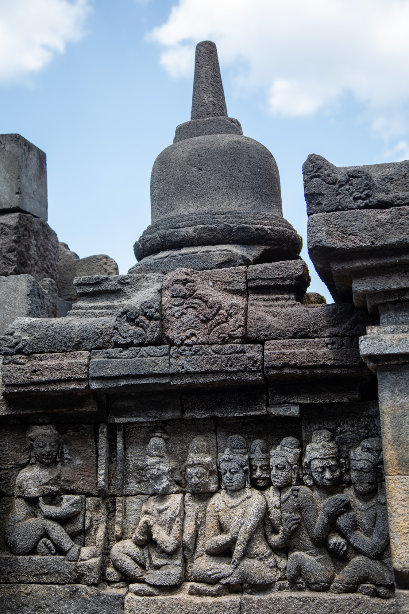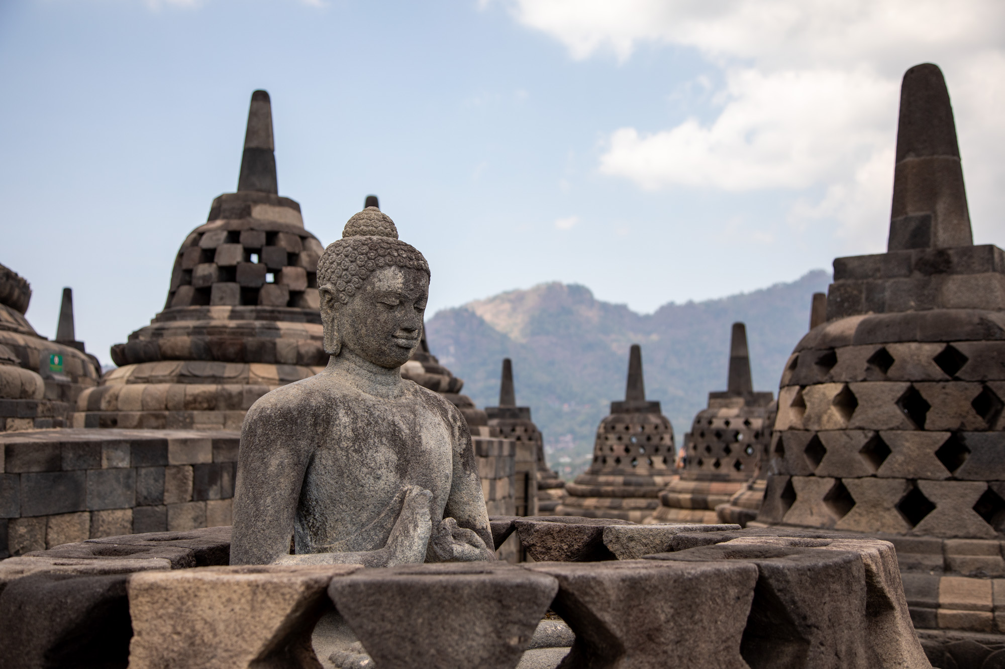 Avec notre bolide, on part de bon matin en direction du temple de Borobudur. Ce temple est le plus grand temple bouddhique d’Asie. Il a été édifié à l’époque ou la ville de Yogyakarta était le centre politique de Java et où les différentes religions coexistaient dans le même espace, il y avait donc aussi des bouddhistes, on en veut pour preuve ce temple aux dimensions assez phénoménales. Pour rejoindre Borobudur, qui se trouve dans la province de Central Java, il nous faut rouler sur la voie rapide pendant une heure trente. La circulation est dense mais on arrive quand même à s’en sortir. On arrive tôt au guichet, une heure plus tôt que l’heure inscrite sur notre ticket que l’on doit réserver en avance. Les billets de début de matinée sont les plus prisés, car il fait moins chaud et aussi parce que l’on peut bénéficier d’une belle lumière. Depuis le COVID, ce n’est plus possible de visiter le temple au lever du soleil. C’était sûrement le meilleur choix, il fallait pour cela passer par l’accueil du l’hôtel attenant et acheter un ticket spécial auprès d’eux. On avait donc réserver notre billet quelques semaines en avance, mais c’était déjà un peu tard. On a quand même obtenir un ticket, certains n’en ont même pas la possibilité, mais pour le créneau de 11h. On se présente donc au guichet vers 9h45 et on demande si on peut changer de créneau. Ils nous demandent d’inscrire notre nom sur une liste d’attente pour voir si il y a des désistements. On a de la chance, ils nous appellent tout comme un autre couple qui venait d’arriver avec nous et on est maintenant assigné au groupe de 10h. Génial, j’adore la façon très fluide de fonctionner en Asie, il y a toujours moyen de tenter de négocier, on n’est jamais à l’abri que ça marche. Et en plus, peut être que le créneau que l’on a automatiquement libéré pour la visite de 11h servira à quelqu’un d’autre… Pour entrer sur le site de Borobudur, qui est protégé par l’UNESCO, il y a des règles strictes qui ont été mises en place pour éviter que le site soit abimé par les touristes. Tout d’abord, il faut échanger nos chaussures pour des tongs, ensuite on doit suivre un guide qui nous fait un tour obligatoire d’une heure, on entre par une porte et on sort par une autre. C’est donc un circuit très balisé en théorie. Tous les visiteurs du créneau de 10h sont invités à s’asseoir à l’ombre sur des chaises pour écouter les consignes, puis un guide est assigné par groupe de 10 personnes environ. On tombe sur un guide assez spécial, son niveau d’anglais est très faible et il ne semble pas très passionné par son métier. Rien à voir avec jeunes qui nous ont servi de guide privé jusqu’à maintenant en Indonésie qui étaient vraiment à fond. Le guide nous amène devant le temple et on a une vue complète du site, le temple est très large, il ressemble à une montagne.
