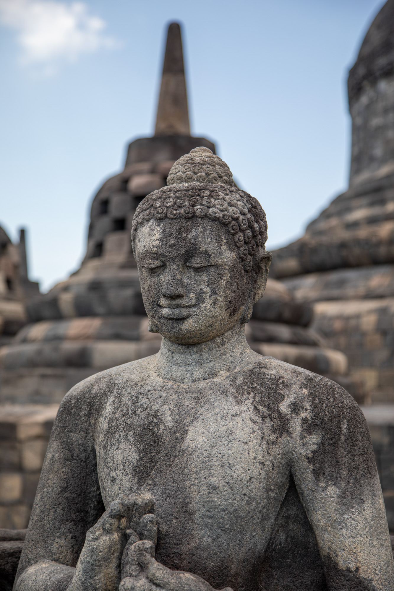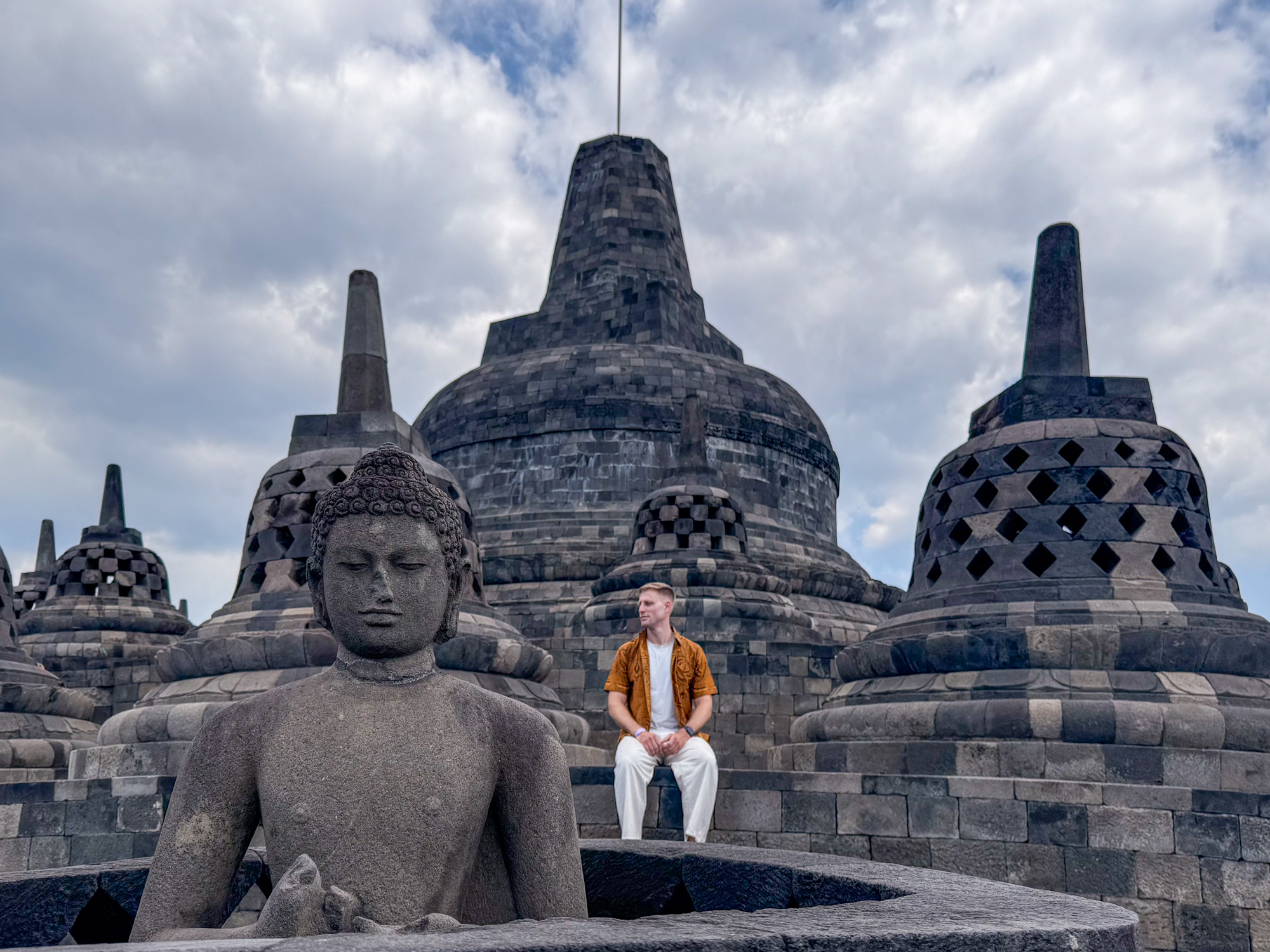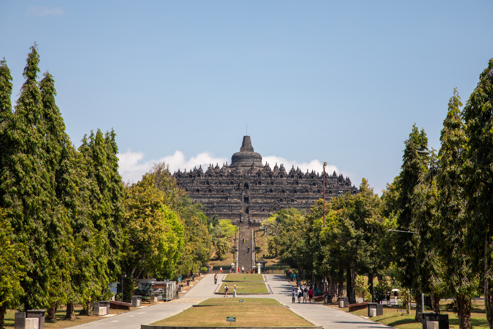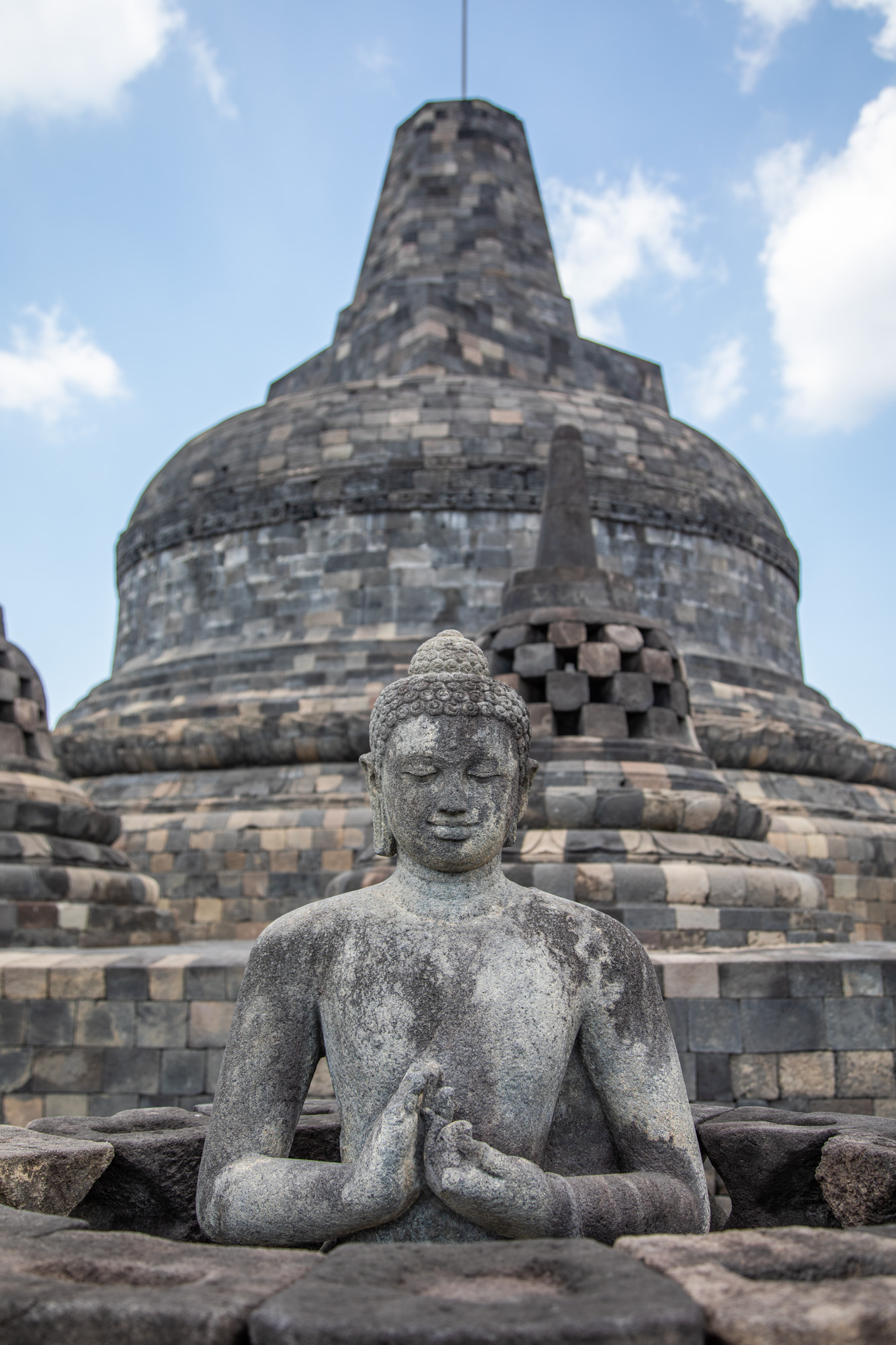 Avec notre bolide, on part de bon matin en direction du temple de Borobudur. Ce temple est le plus grand temple bouddhique d’Asie. Il a été édifié à l’époque ou la ville de Yogyakarta était le centre politique de Java et où les différentes religions coexistaient dans le même espace, il y avait donc aussi des bouddhistes, on en veut pour preuve ce temple aux dimensions assez phénoménales. Pour rejoindre Borobudur, qui se trouve dans la province de Central Java, il nous faut rouler sur la voie rapide pendant une heure trente. La circulation est dense mais on arrive quand même à s’en sortir. On arrive tôt au guichet, une heure plus tôt que l’heure inscrite sur notre ticket que l’on doit réserver en avance. Les billets de début de matinée sont les plus prisés, car il fait moins chaud et aussi parce que l’on peut bénéficier d’une belle lumière. Depuis le COVID, ce n’est plus possible de visiter le temple au lever du soleil. C’était sûrement le meilleur choix, il fallait pour cela passer par l’accueil du l’hôtel attenant et acheter un ticket spécial auprès d’eux. On avait donc réserver notre billet quelques semaines en avance, mais c’était déjà un peu tard. On a quand même obtenir un ticket, certains n’en ont même pas la possibilité, mais pour le créneau de 11h. On se présente donc au guichet vers 9h45 et on demande si on peut changer de créneau. Ils nous demandent d’inscrire notre nom sur une liste d’attente pour voir si il y a des désistements. On a de la chance, ils nous appellent tout comme un autre couple qui venait d’arriver avec nous et on est maintenant assigné au groupe de 10h. Génial, j’adore la façon très fluide de fonctionner en Asie, il y a toujours moyen de tenter de négocier, on n’est jamais à l’abri que ça marche. Et en plus, peut être que le créneau que l’on a automatiquement libéré pour la visite de 11h servira à quelqu’un d’autre… Pour entrer sur le site de Borobudur, qui est protégé par l’UNESCO, il y a des règles strictes qui ont été mises en place pour éviter que le site soit abimé par les touristes. Tout d’abord, il faut échanger nos chaussures pour des tongs, ensuite on doit suivre un guide qui nous fait un tour obligatoire d’une heure, on entre par une porte et on sort par une autre. C’est donc un circuit très balisé en théorie. Tous les visiteurs du créneau de 10h sont invités à s’asseoir à l’ombre sur des chaises pour écouter les consignes, puis un guide est assigné par groupe de 10 personnes environ. On tombe sur un guide assez spécial, son niveau d’anglais est très faible et il ne semble pas très passionné par son métier. Rien à voir avec jeunes qui nous ont servi de guide privé jusqu’à maintenant en Indonésie qui étaient vraiment à fond. Le guide nous amène devant le temple et on a une vue complète du site, le temple est très large, il ressemble à une montagne.