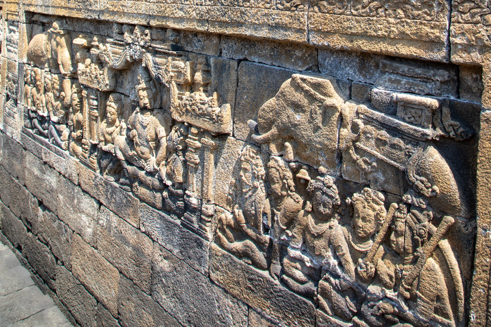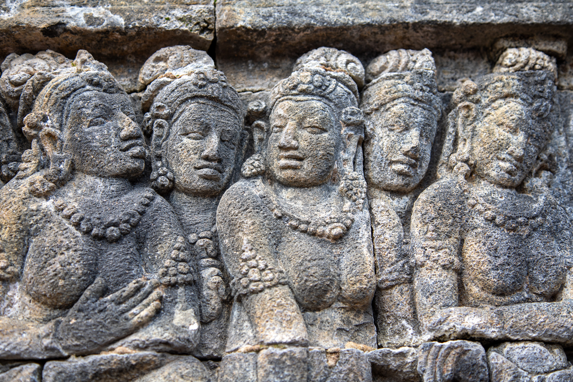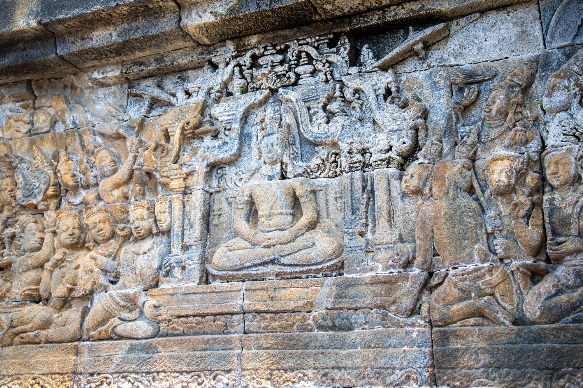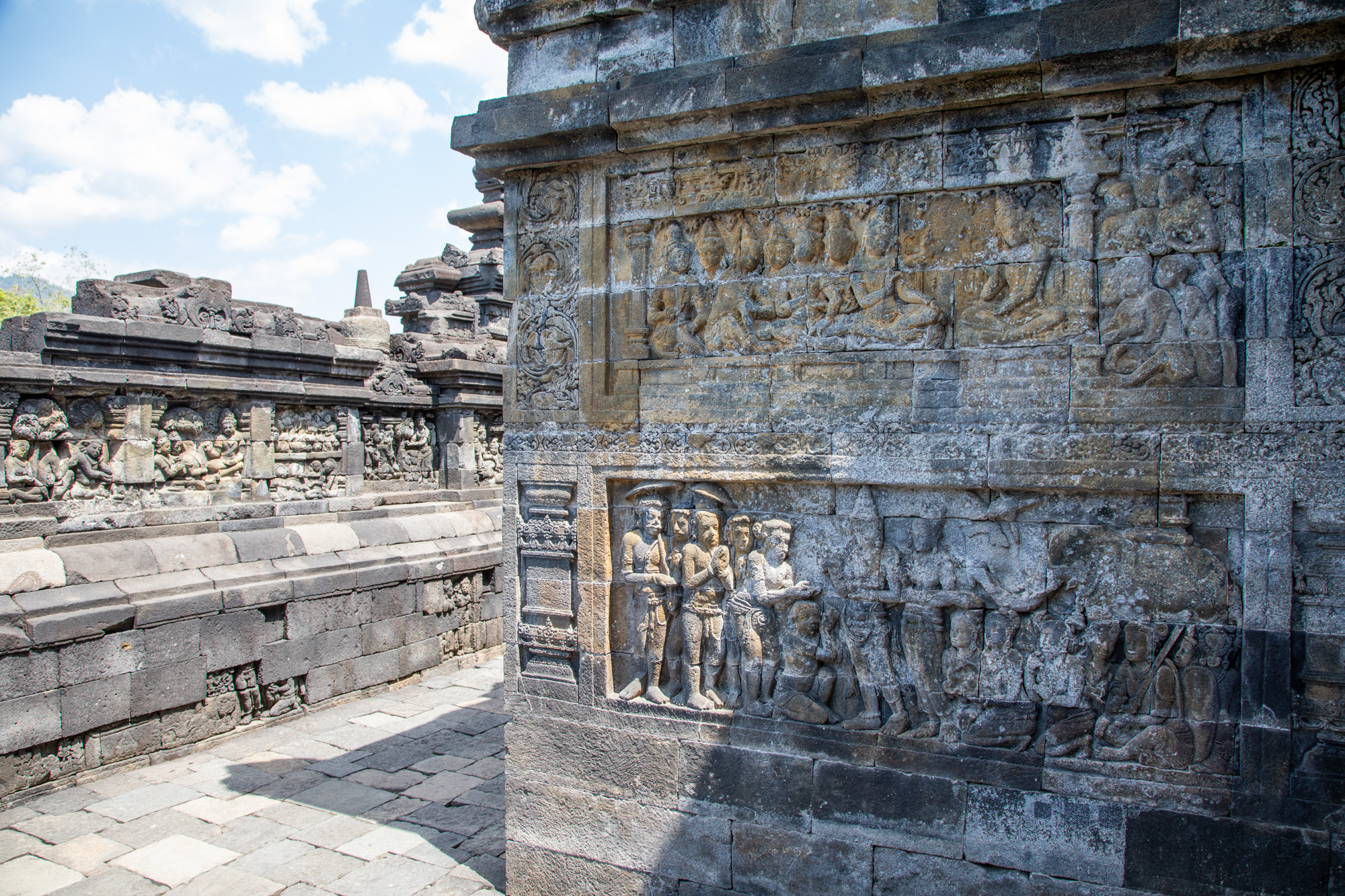 Avec notre bolide, on part de bon matin en direction du temple de Borobudur. Ce temple est le plus grand temple bouddhique d’Asie. Il a été édifié à l’époque ou la ville de Yogyakarta était le centre politique de Java et où les différentes religions coexistaient dans le même espace, il y avait donc aussi des bouddhistes, on en veut pour preuve ce temple aux dimensions assez phénoménales. Pour rejoindre Borobudur, qui se trouve dans la province de Central Java, il nous faut rouler sur la voie rapide pendant une heure trente. La circulation est dense mais on arrive quand même à s’en sortir. On arrive tôt au guichet, une heure plus tôt que l’heure inscrite sur notre ticket que l’on doit réserver en avance. Les billets de début de matinée sont les plus prisés, car il fait moins chaud et aussi parce que l’on peut bénéficier d’une belle lumière. Depuis le COVID, ce n’est plus possible de visiter le temple au lever du soleil. C’était sûrement le meilleur choix, il fallait pour cela passer par l’accueil du l’hôtel attenant et acheter un ticket spécial auprès d’eux. On avait donc réserver notre billet quelques semaines en avance, mais c’était déjà un peu tard. On a quand même obtenir un ticket, certains n’en ont même pas la possibilité, mais pour le créneau de 11h. On se présente donc au guichet vers 9h45 et on demande si on peut changer de créneau. Ils nous demandent d’inscrire notre nom sur une liste d’attente pour voir si il y a des désistements. On a de la chance, ils nous appellent tout comme un autre couple qui venait d’arriver avec nous et on est maintenant assigné au groupe de 10h. Génial, j’adore la façon très fluide de fonctionner en Asie, il y a toujours moyen de tenter de négocier, on n’est jamais à l’abri que ça marche. Et en plus, peut être que le créneau que l’on a automatiquement libéré pour la visite de 11h servira à quelqu’un d’autre… Pour entrer sur le site de Borobudur, qui est protégé par l’UNESCO, il y a des règles strictes qui ont été mises en place pour éviter que le site soit abimé par les touristes. Tout d’abord, il faut échanger nos chaussures pour des tongs, ensuite on doit suivre un guide qui nous fait un tour obligatoire d’une heure, on entre par une porte et on sort par une autre. C’est donc un circuit très balisé en théorie. Tous les visiteurs du créneau de 10h sont invités à s’asseoir à l’ombre sur des chaises pour écouter les consignes, puis un guide est assigné par groupe de 10 personnes environ. On tombe sur un guide assez spécial, son niveau d’anglais est très faible et il ne semble pas très passionné par son métier. Rien à voir avec jeunes qui nous ont servi de guide privé jusqu’à maintenant en Indonésie qui étaient vraiment à fond. Le guide nous amène devant le temple et on a une vue complète du site, le temple est très large, il ressemble à une montagne.