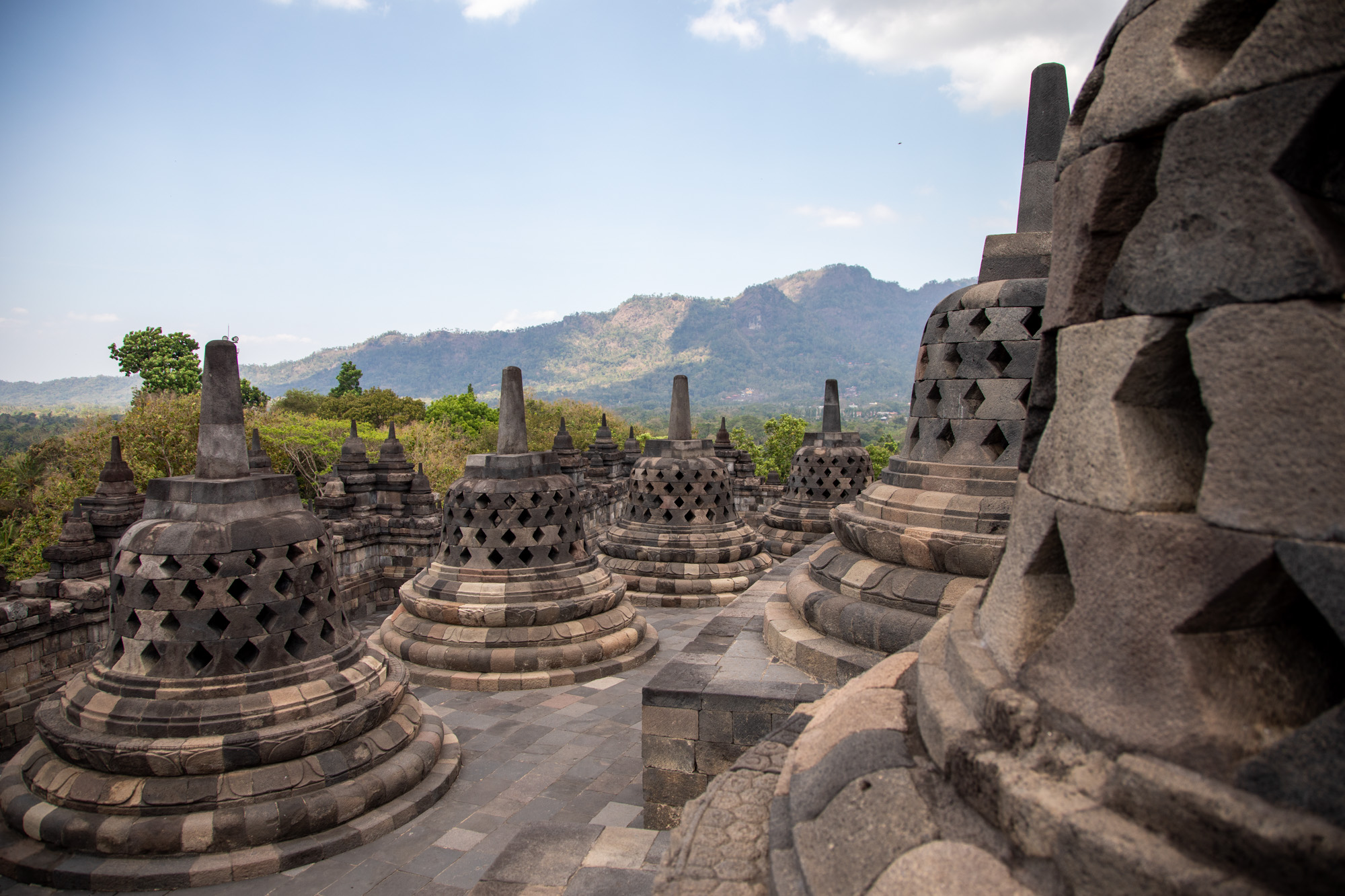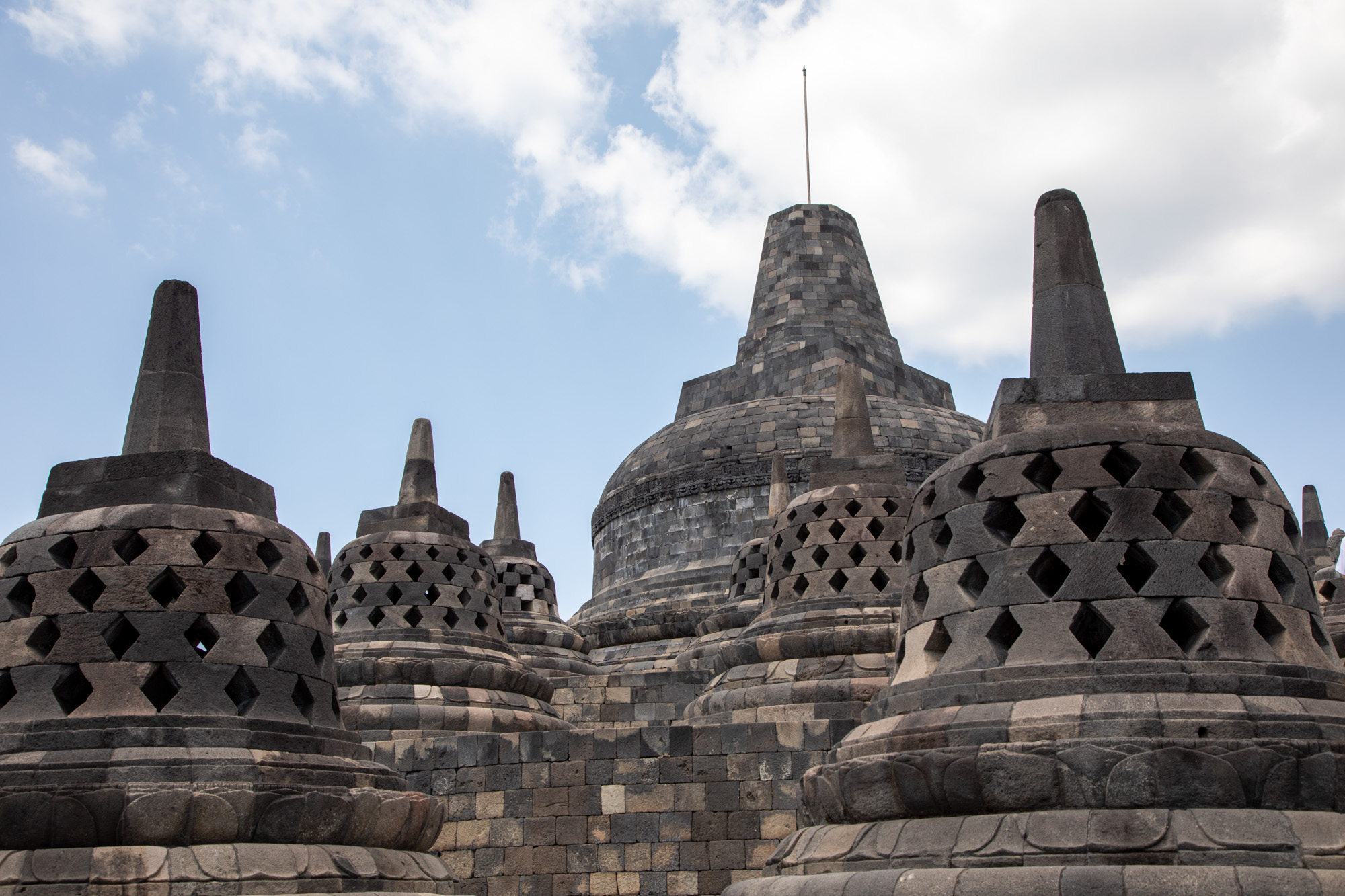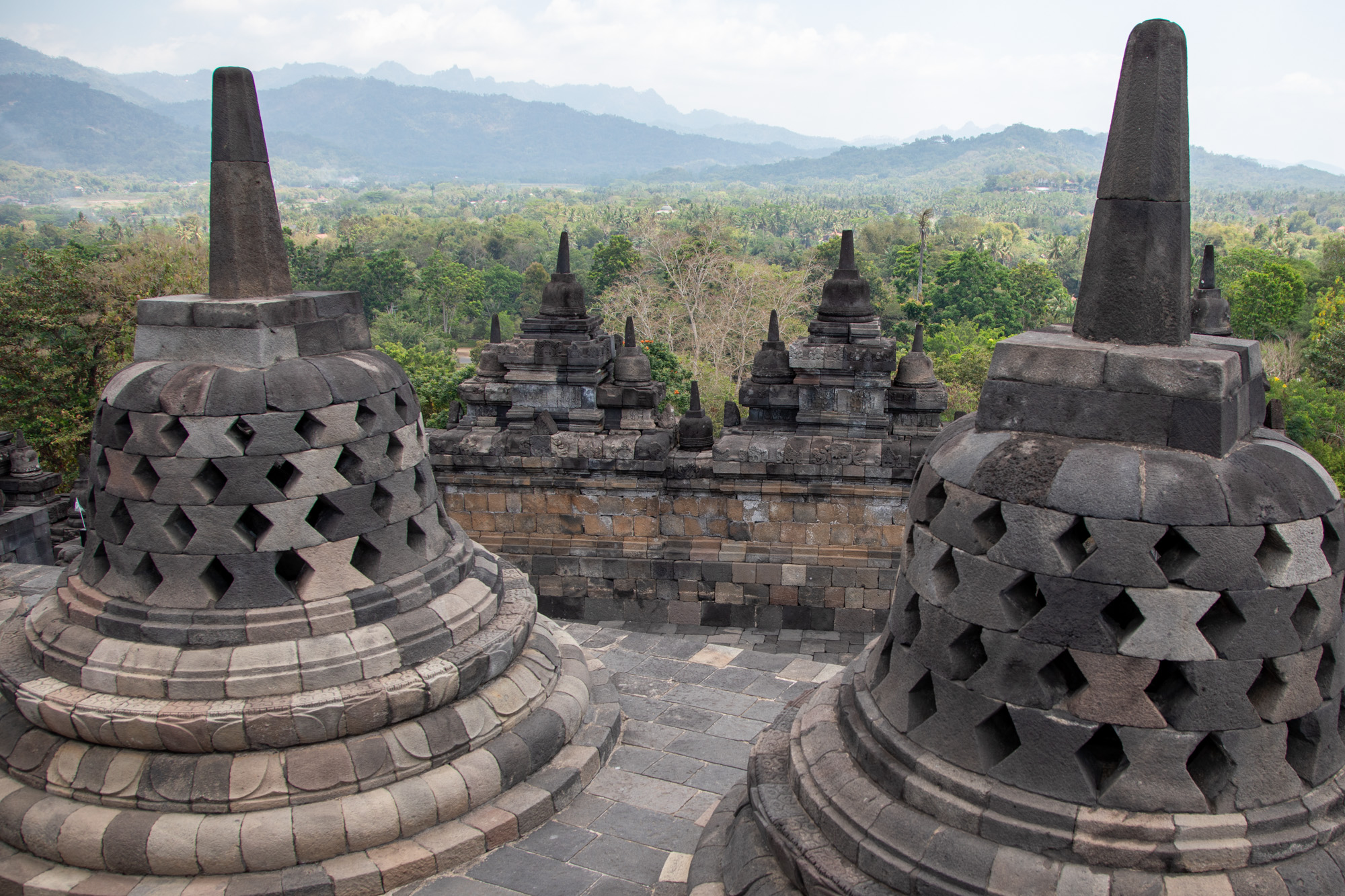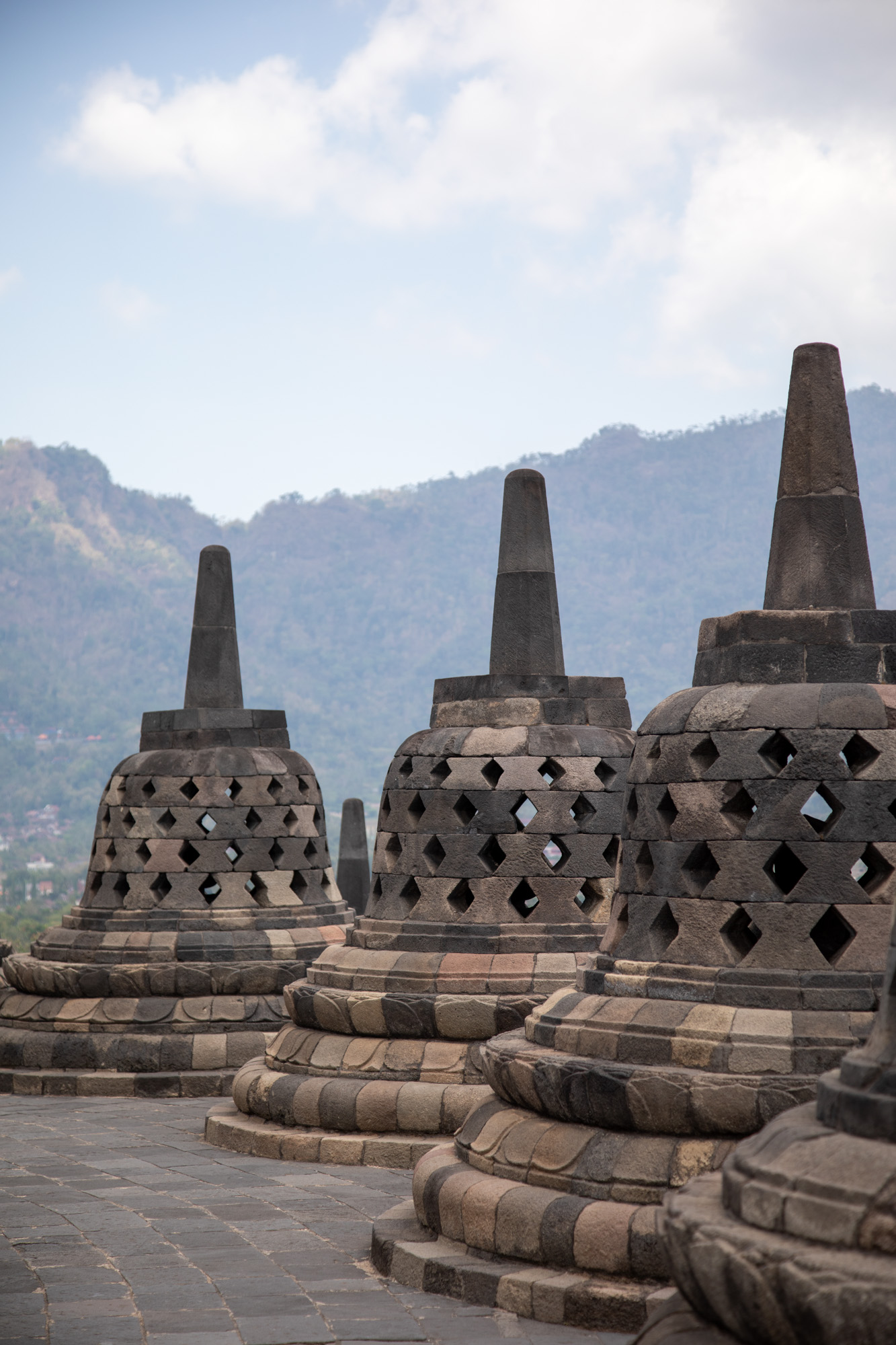 Ces stupas qui ont été édifiées tout en haut de cette immense structure sont vraiment caractéristiques du temple de Borobudur.