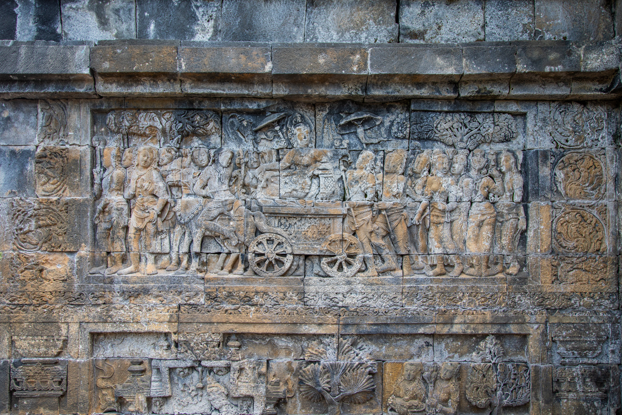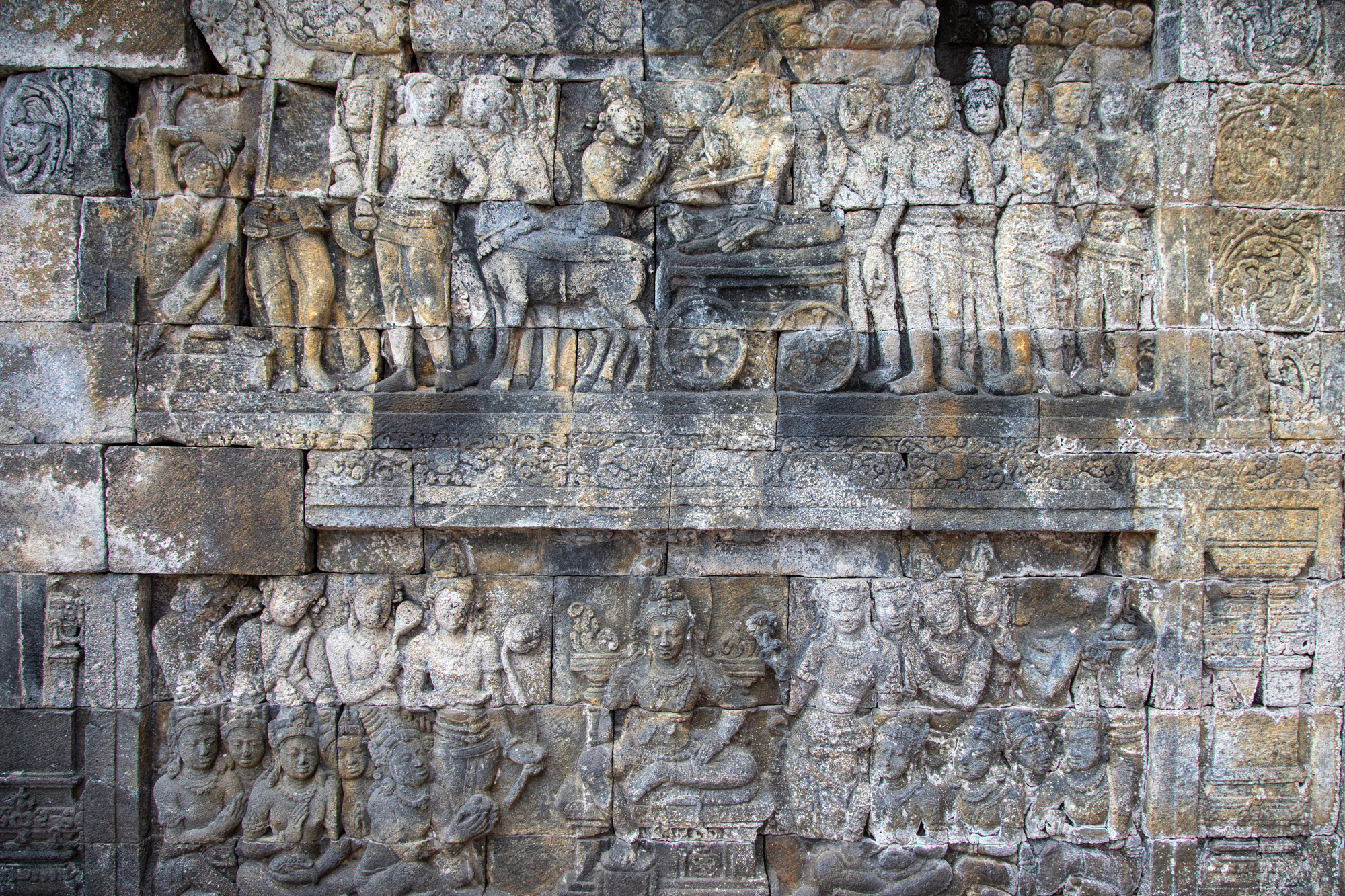 Le détail des fresques est époustouflant. On circule autour des différents niveaux du temple, les différents tableaux présentent la vie de Bouddha que le guide nous explique avec un anglais plus qu'aléatoire.