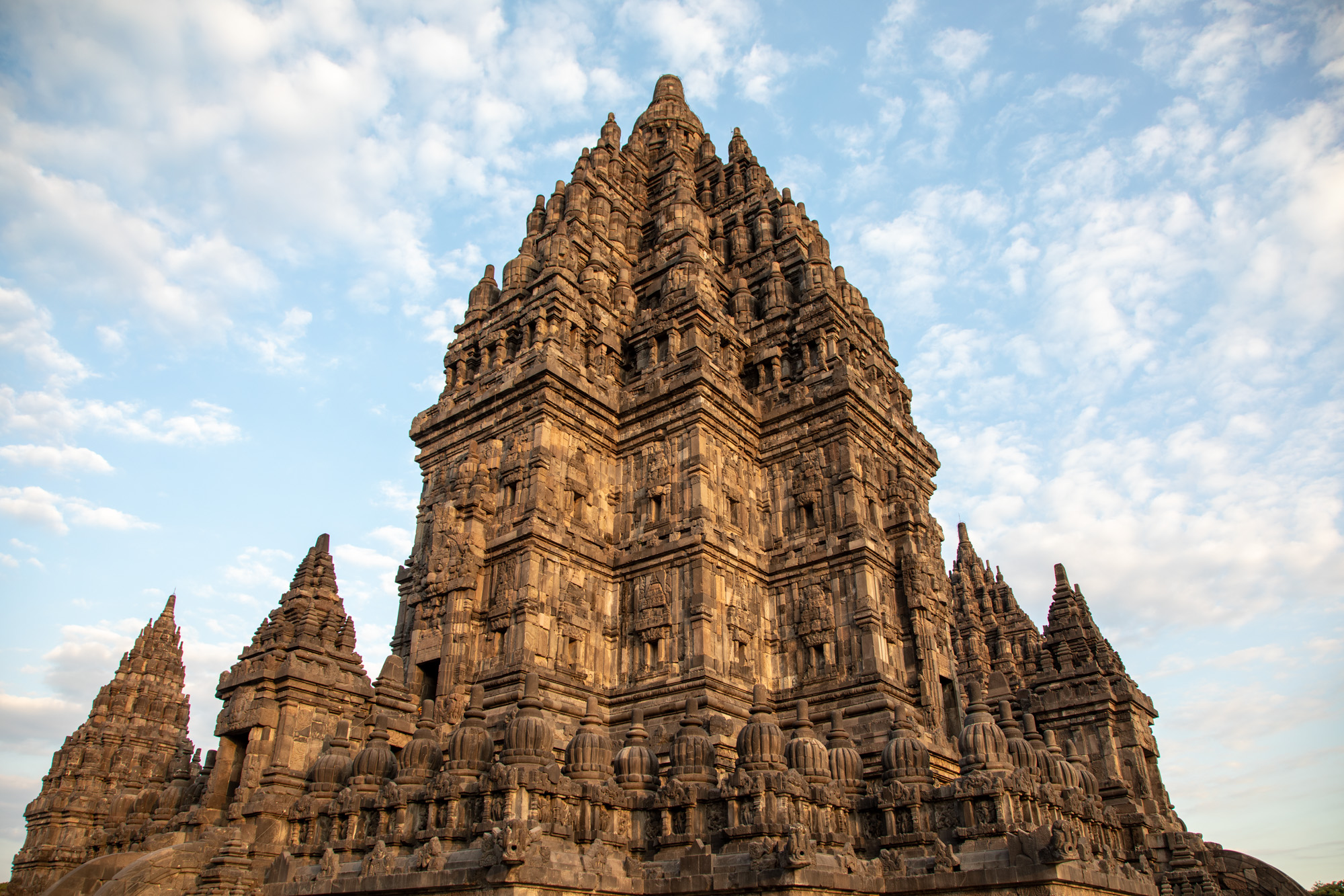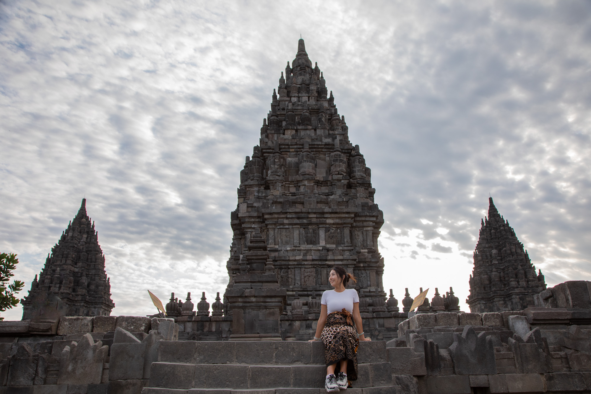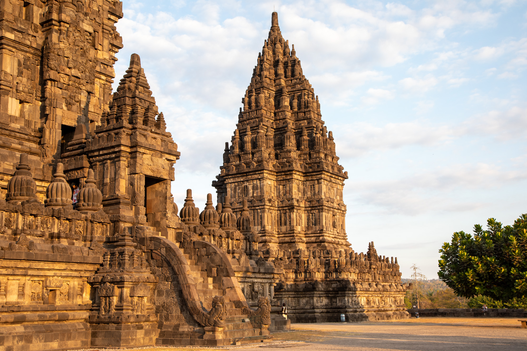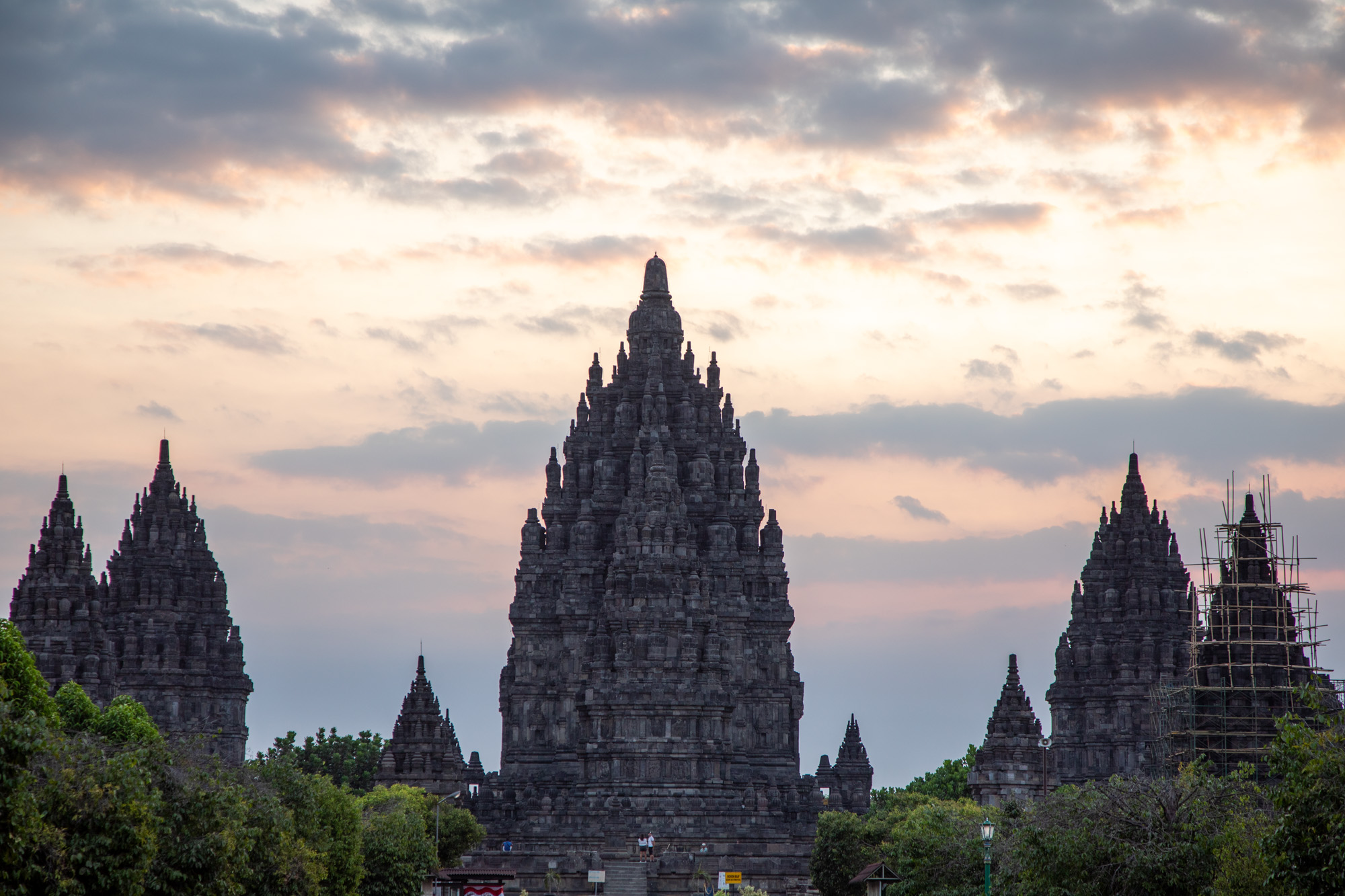 On a aussi visité le temple de Prambanan qui se trouve de l’autre côté de la ville de Yogyakarta. Moins éloigné du centre ville, on peut le rejoindre en une quarantaine de minutes par le périphérique, ce temple hindou est parmi les plus grands d’Indonésie aussi. On retrouve encore une fois cette thématique de Yogyakarta et ses monuments emblématiques qui ont été édifié durant l’age d’or du royaume hindou de Java, avant la colonisation par les musulmans. Ce temple est très différent de Borobudur, dans sa géométrie déjà. Parce que Borobudur était plus horizontal que vertical, Prambanan à l’inverse est tout en verticalité.