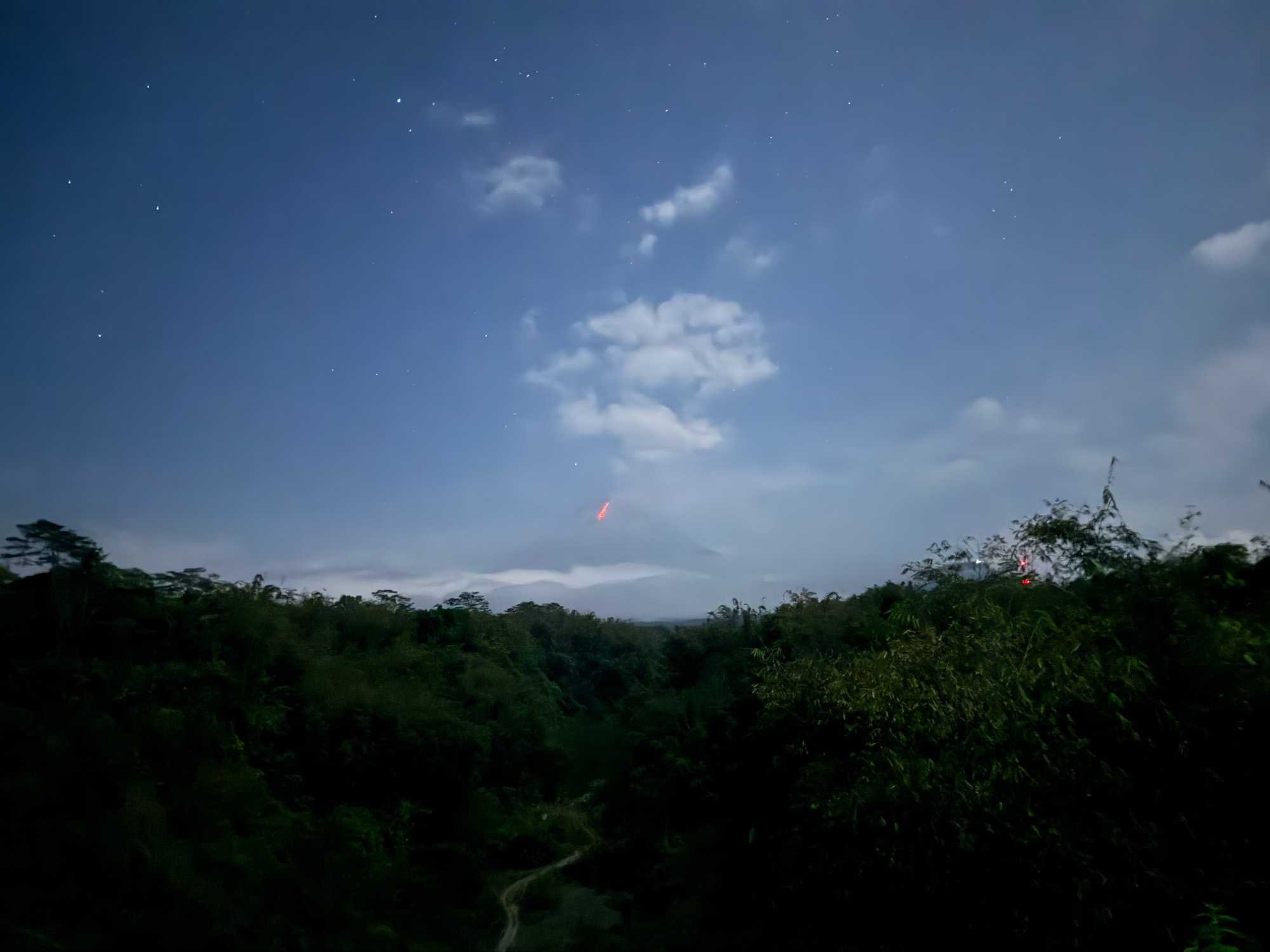 Quasiment toutes les nuits, le volcan Merapi crache de la lave. C’est un des volcans les plus actifs du monde. Il est d’ailleurs sous constante surveillance du fait de sa proximité avec la ville de Yogyakarta et de son aéroport international. On peut s’approcher du volcan et trouver un endroit pour voir la lave couler le long des pentes du volcan. Pour cela il faut rouler jusqu’aux villages les plus proches. Plus on monte, l’air se refroidi, ce changement de température est vraiment impressionnant. On arrive à un café qui donne droit sur le volcan. Il y a déjà deux personnes qui sont installés avec trépied et appareil photo en pause longue. On s’asseoit à côté, on n’est pas aussi équipé. On arrive à apercevoir la lave être expulser du cratère et dévaler la montagne. Malheureusement, les nuages arrivent et bouchent la vue. Il fait froid, et on décide de rentrer tranquillement à Yogyakarta.