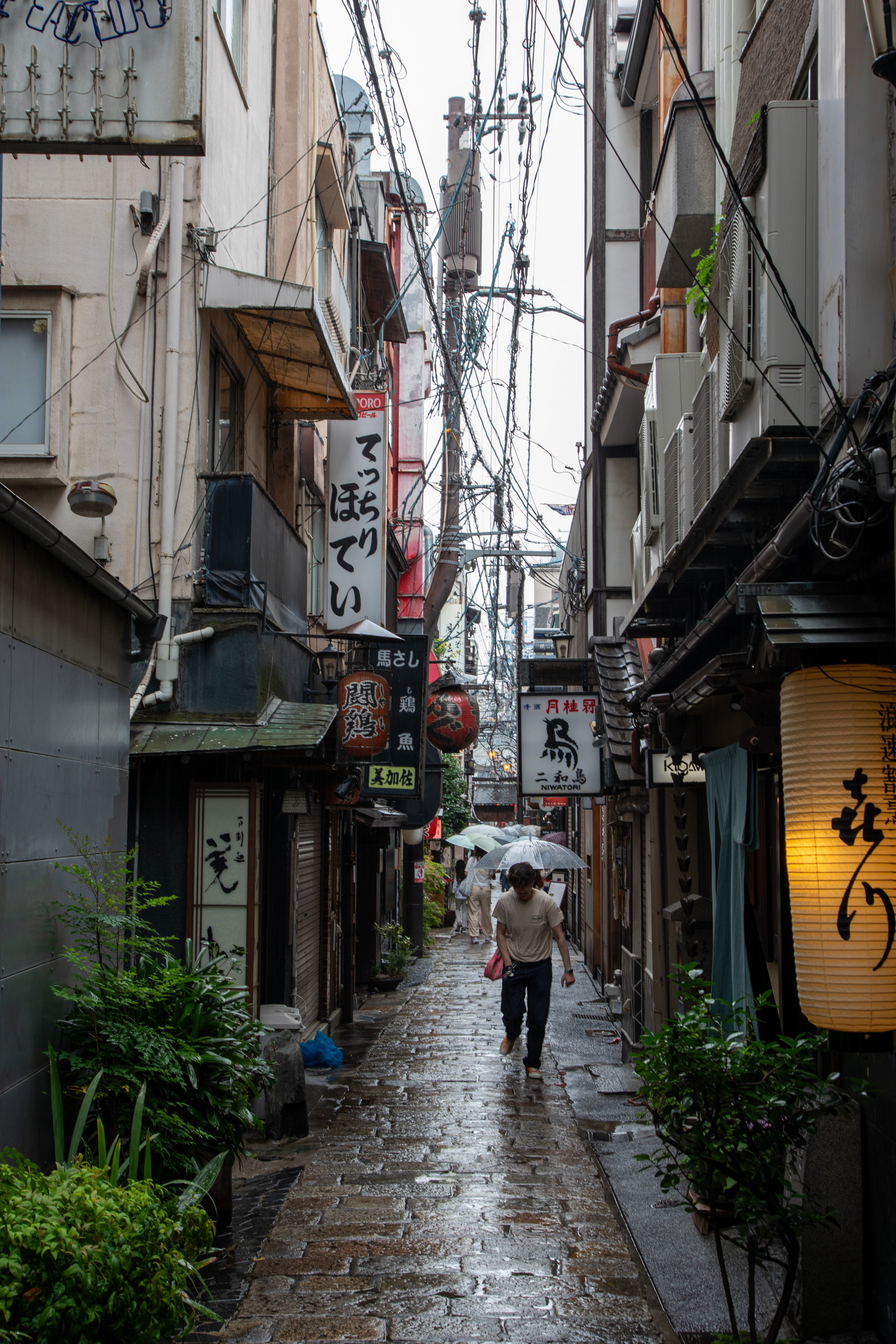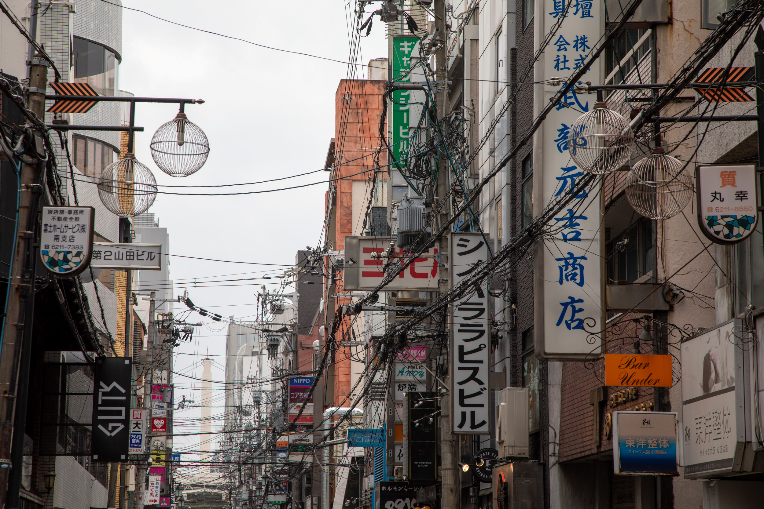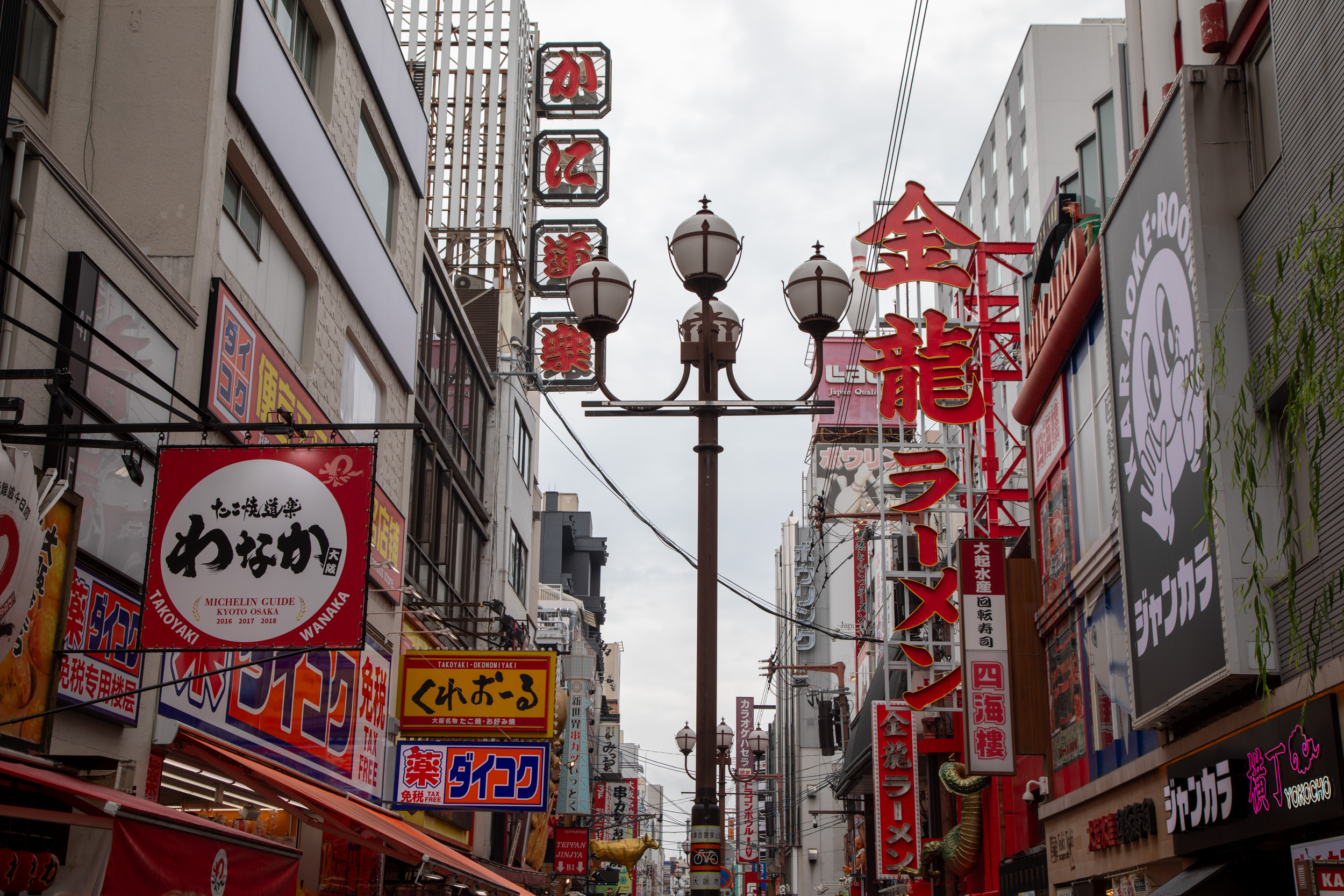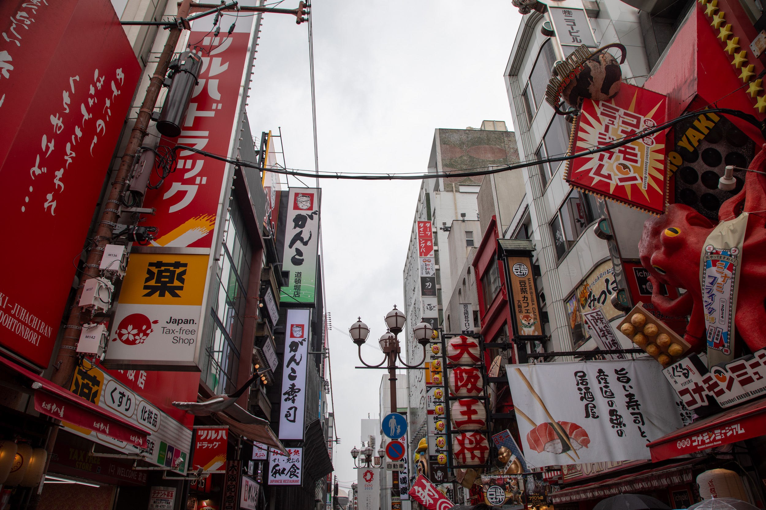 Changement de décor avec l’arrivée à la station de métro de GCGCGCG au coeur du quartier commerçant de Dontobori. Le quartier est en quelque sorte le cliché dans notre imaginaire de la ville japonaise, avec ces rues étroites, les poteaux des fils électriques, les panneaux des enseignes en japonais accrochés au mur au dessus de la rue.