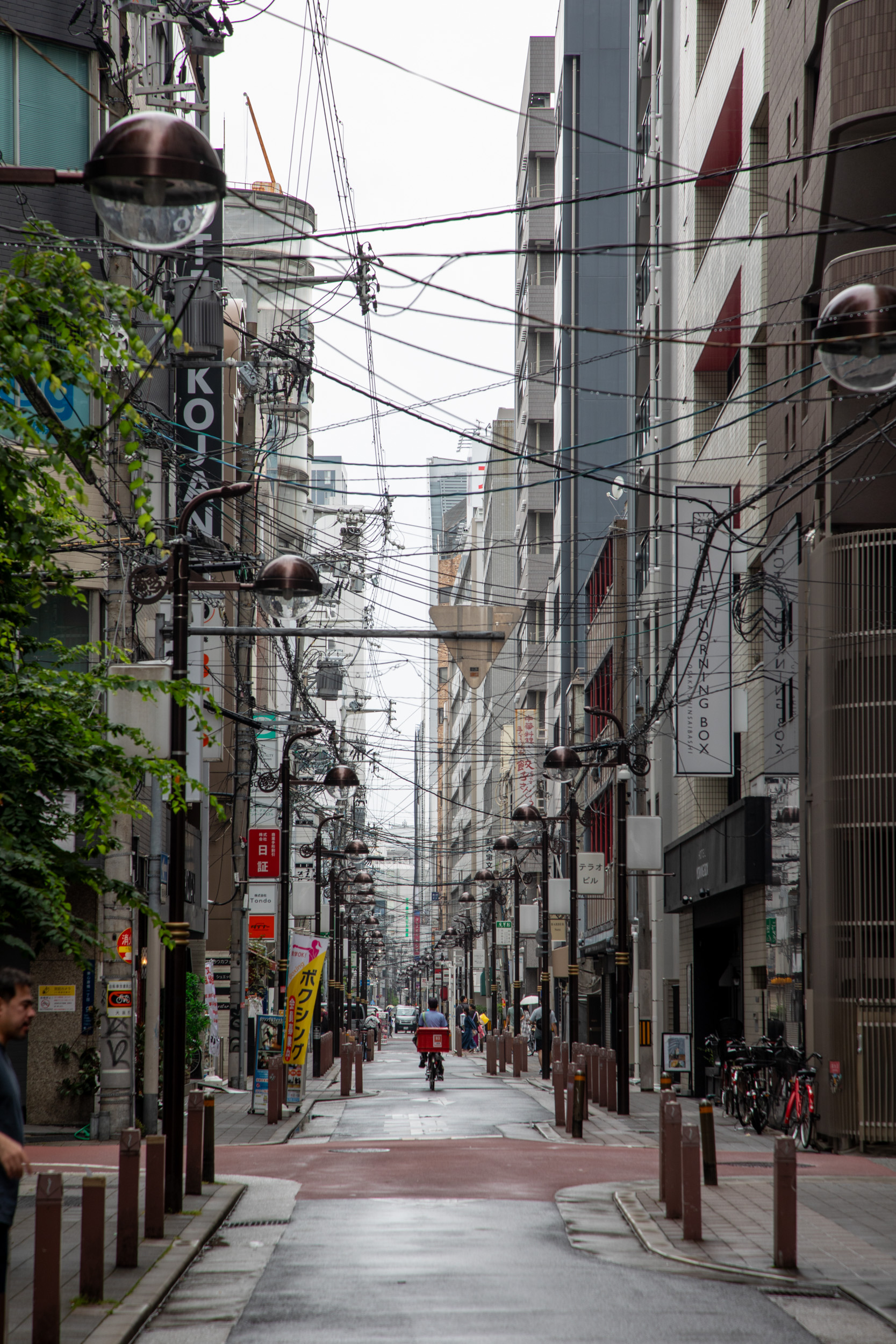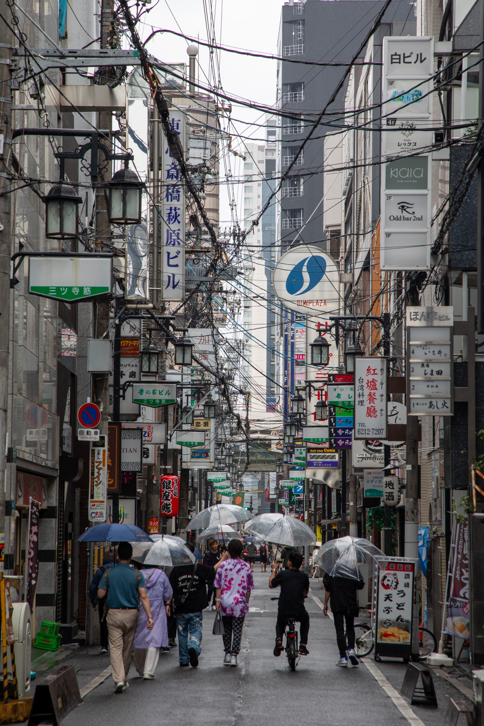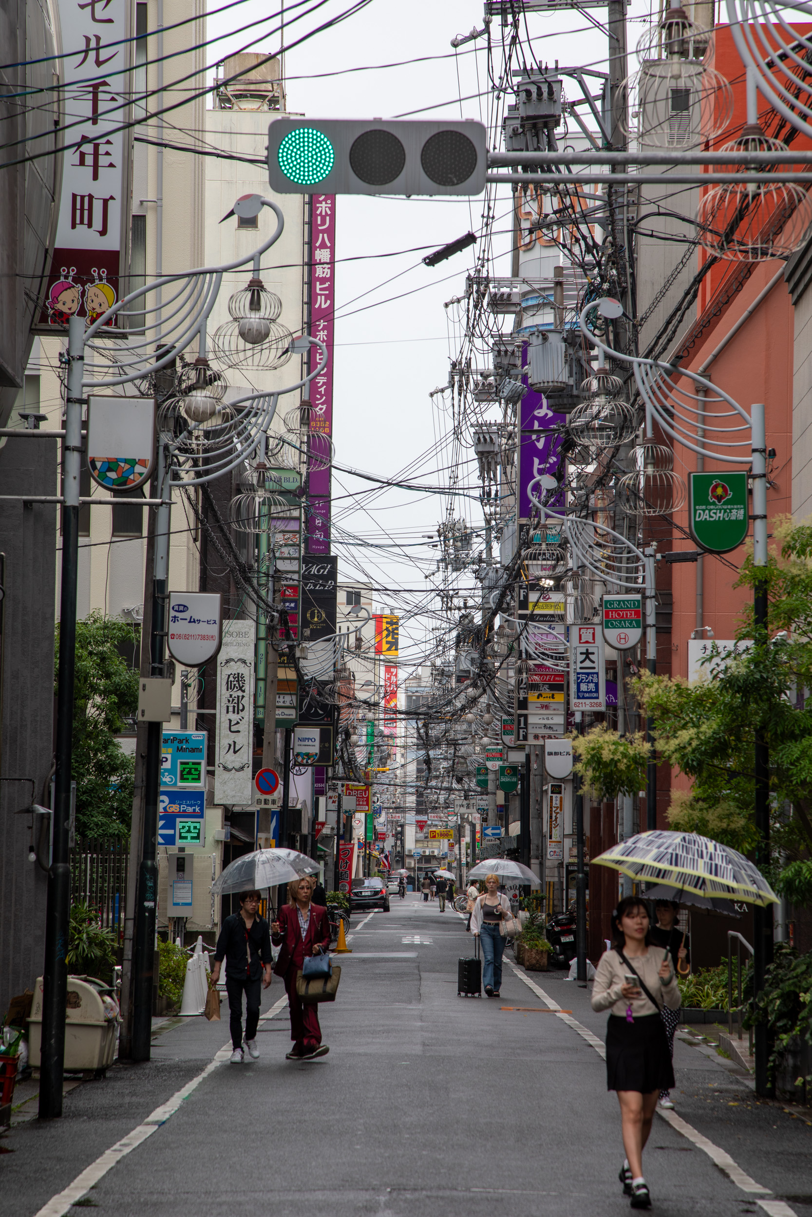 Changement de décor avec l’arrivée à la station de métro de GCGCGCG au coeur du quartier commerçant de Dontobori. Le quartier est en quelque sorte le cliché dans notre imaginaire de la ville japonaise, avec ces rues étroites, les poteaux des fils électriques, les panneaux des enseignes en japonais accrochés au mur au dessus de la rue.
