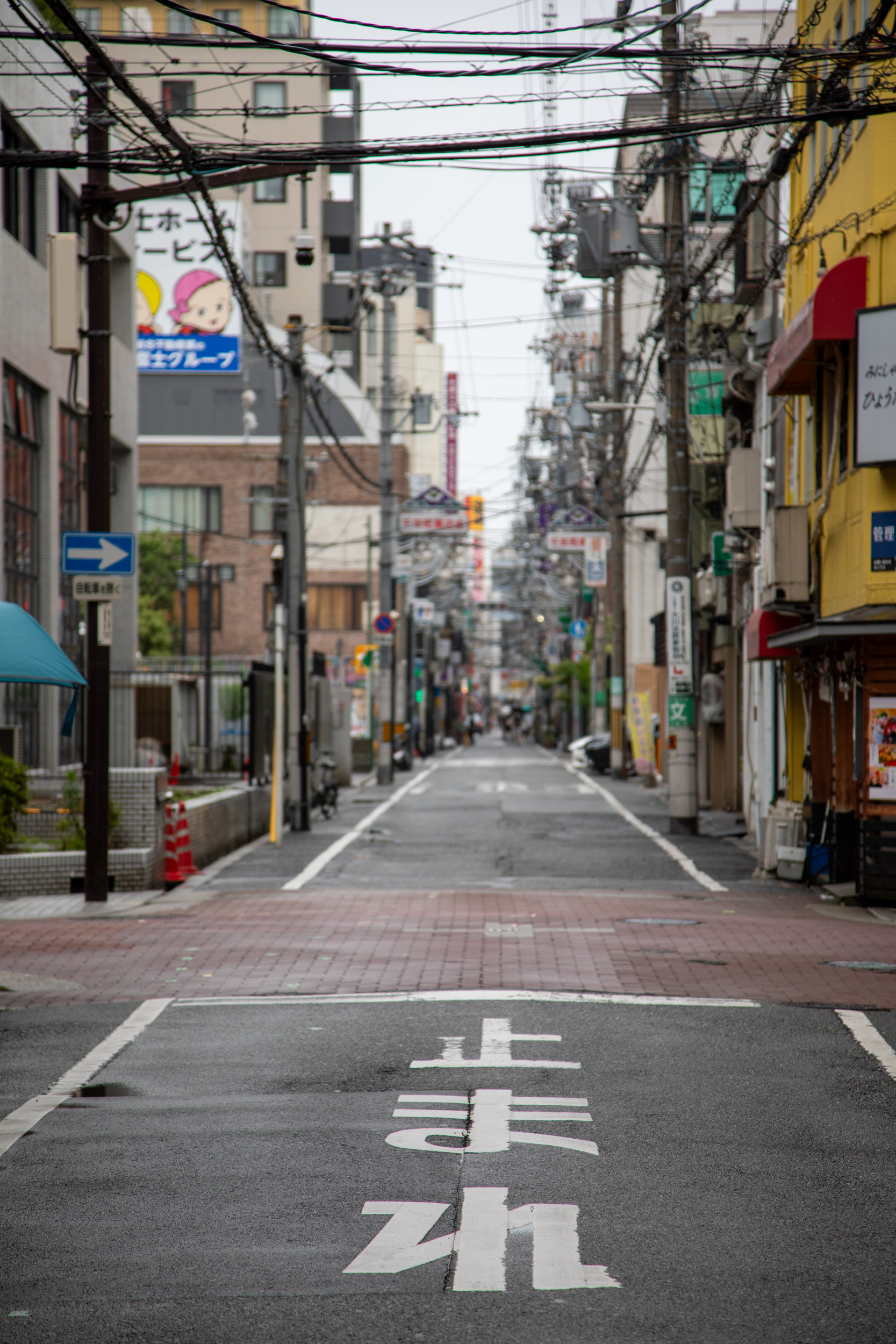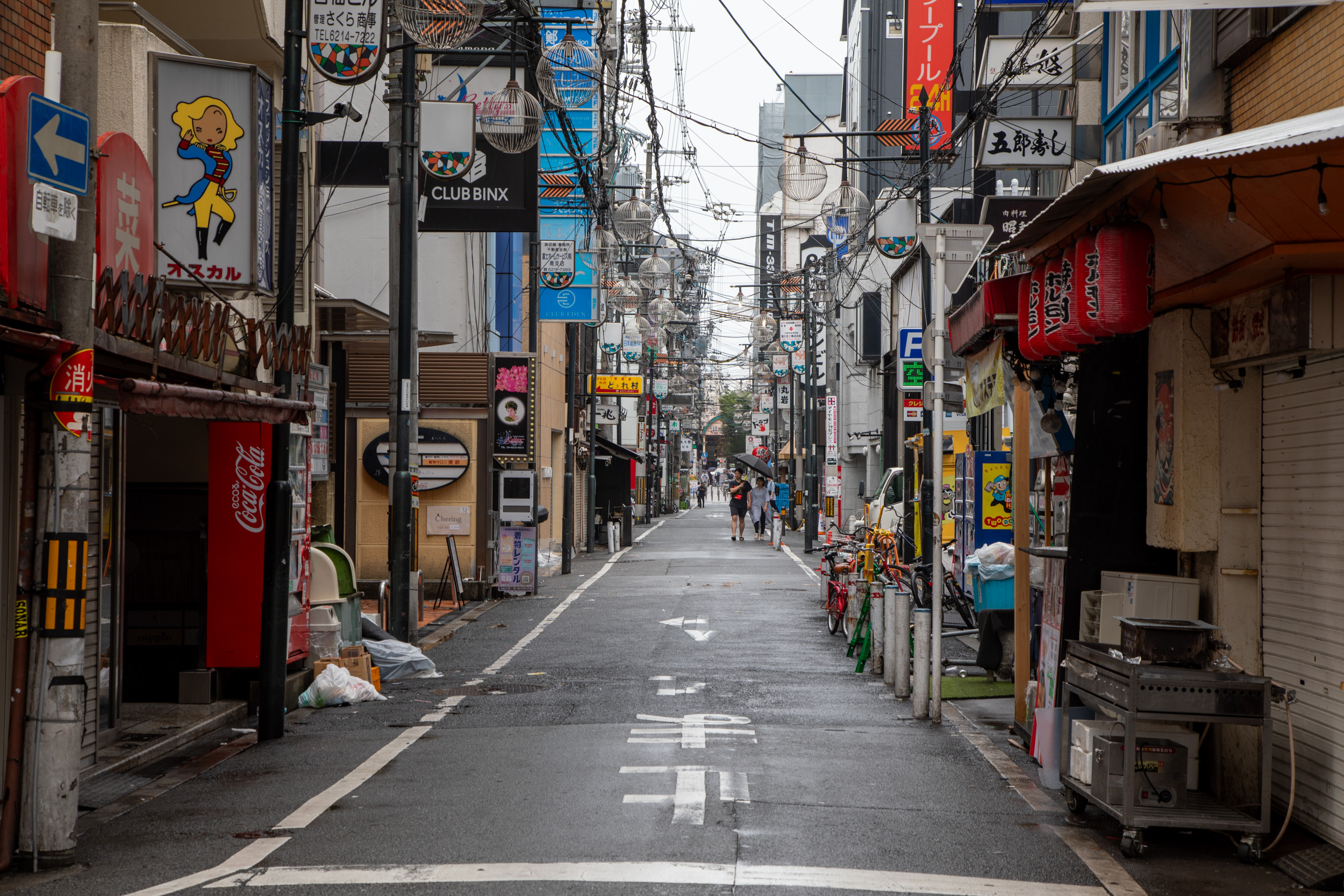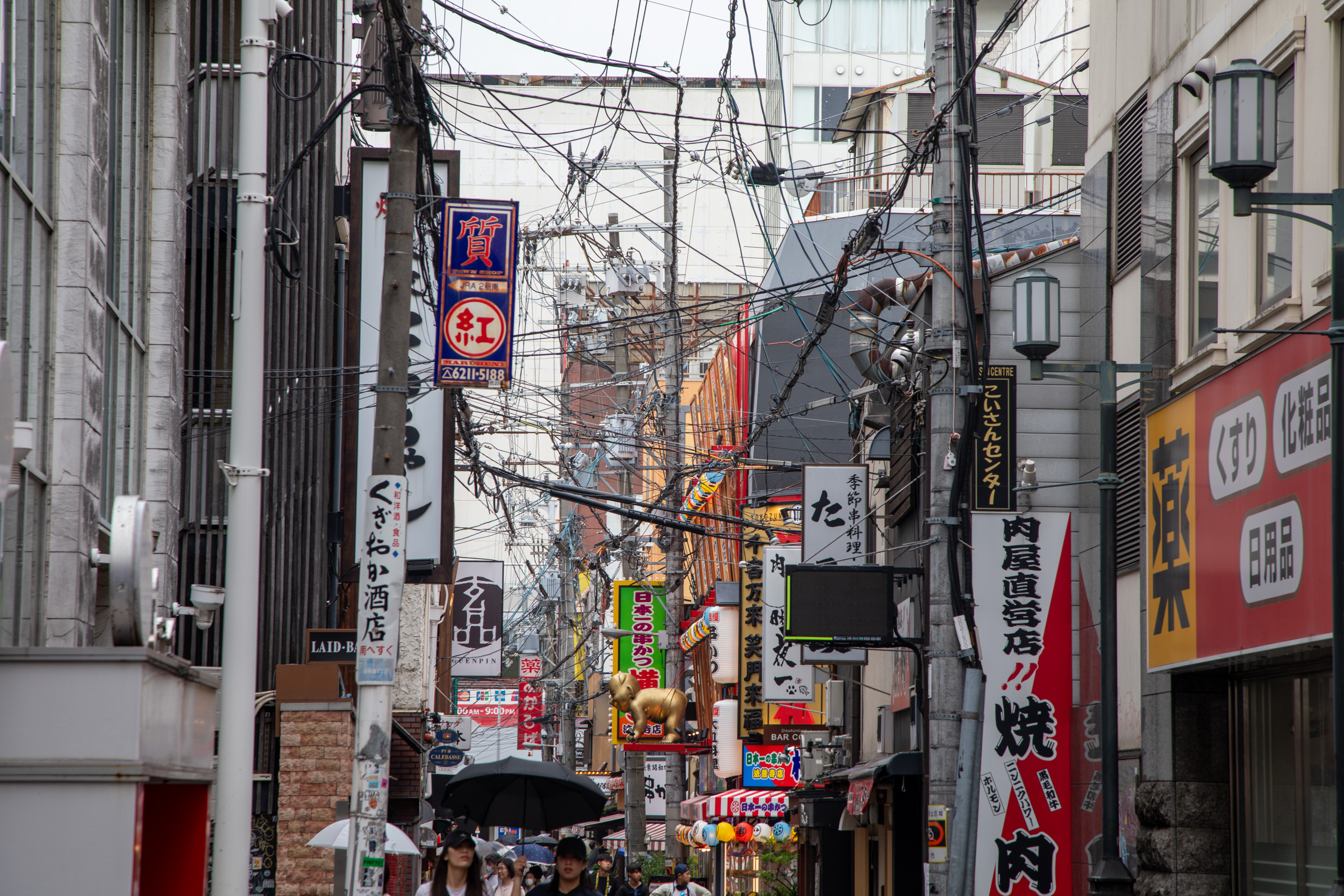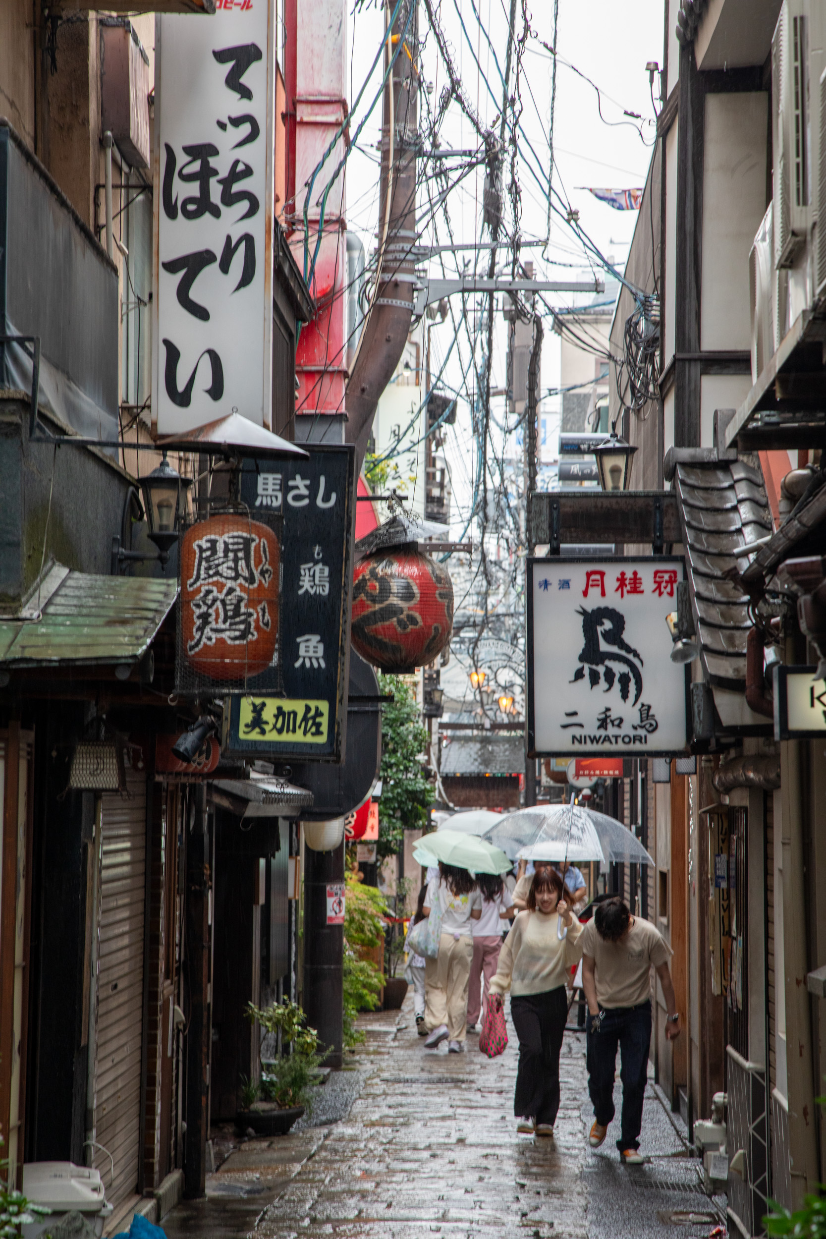 Changement de décor avec l’arrivée à la station de métro de GCGCGCG au coeur du quartier commerçant de Dontobori. Le quartier est en quelque sorte le cliché dans notre imaginaire de la ville japonaise, avec ces rues étroites, les poteaux des fils électriques, les panneaux des enseignes en japonais accrochés au mur au dessus de la rue.