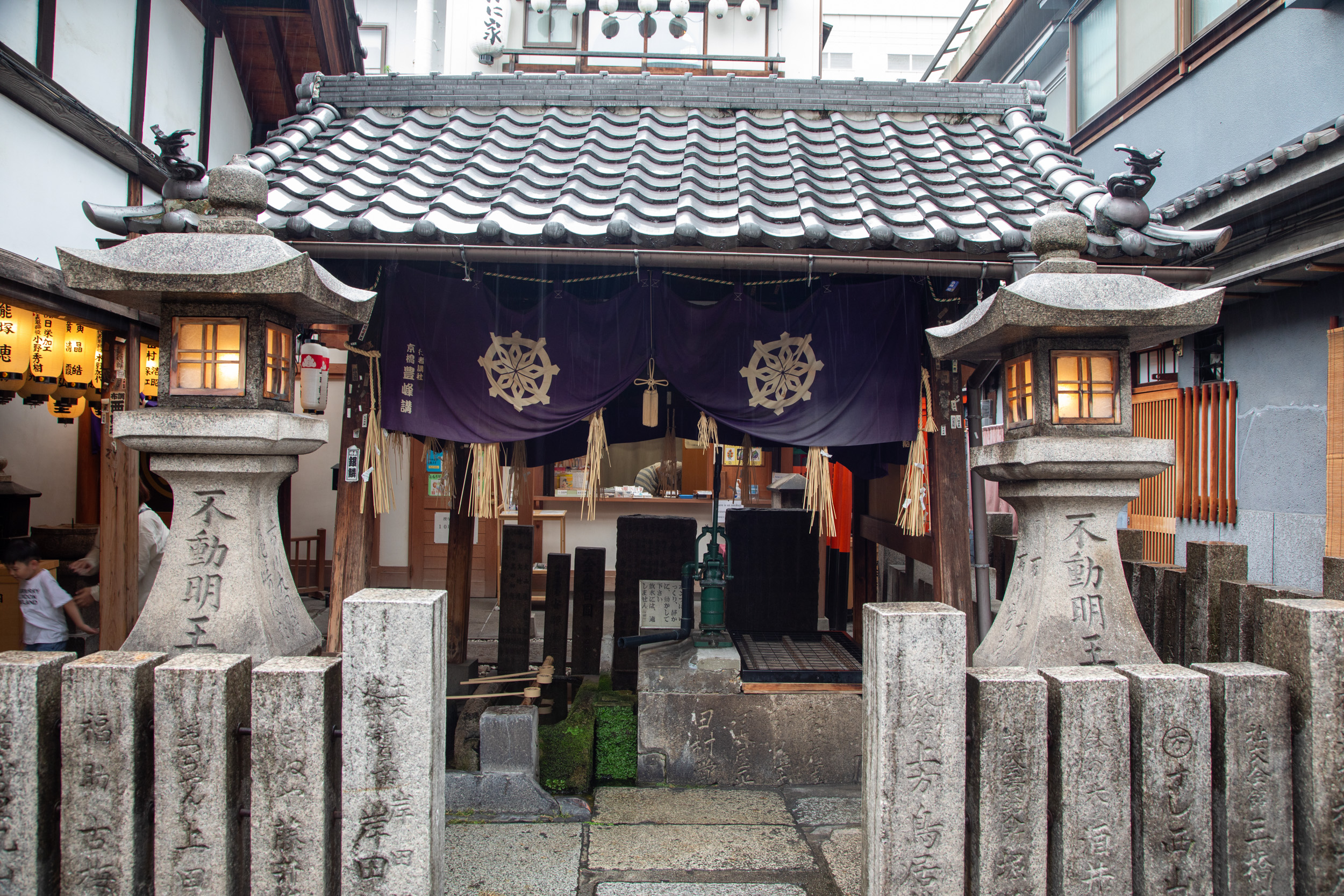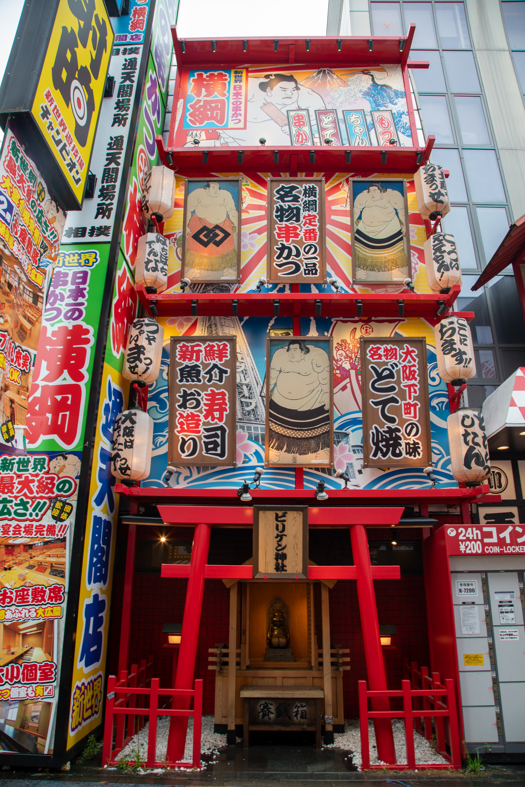 On continue de parcourir le quartier de Dontobori qui recèle de coins photogéniques, comme la ruelle de JSDJSJS qui cache un petit temple au milieu des immeubles.