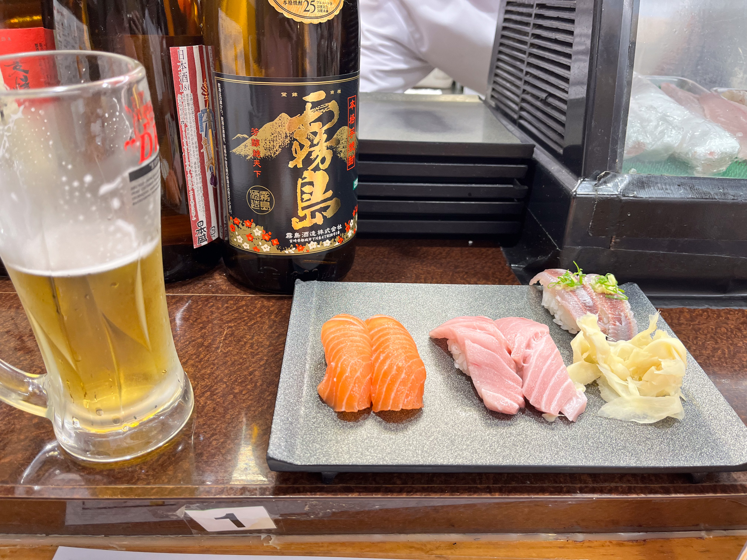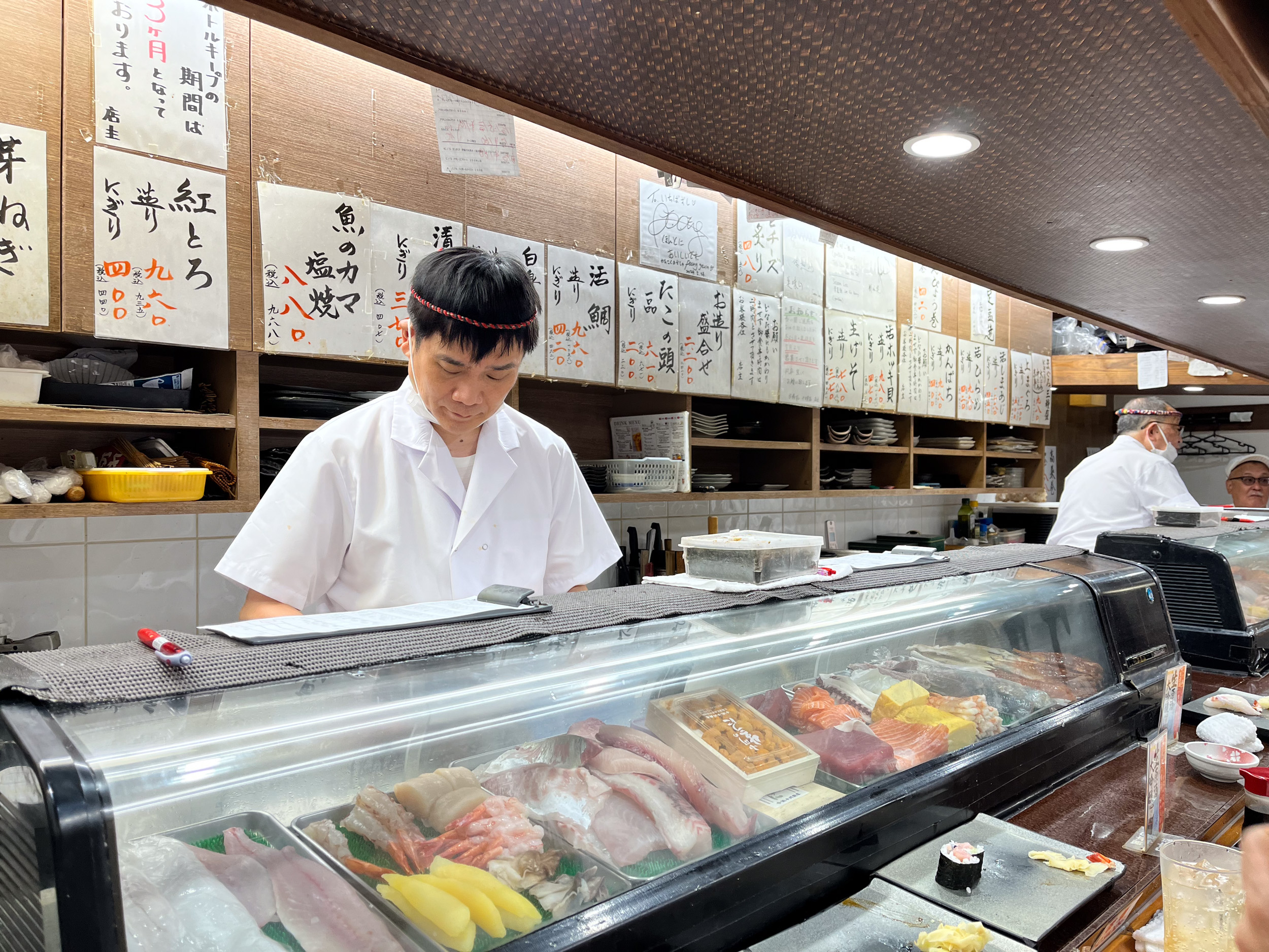 On s’installe dans un restaurant de sushi dans une des ruelles en retrait, pas d’affiche géante à l’entrée ou d’enseigne lumineuse, le restaurant ne paye pas de mine, on est installé au comptoir et on commande directement au cuisiner qui est debout en face de nous de l’autre coté du comptoir où les morceaux de poissons sont conservés au frais. Encore une fois lors de ce séjour au Japon, c’est un régal, et le prix des plats est vraiment abordable, ce qui change vraiment de ce que je pensais du cout du voyage au Japon. Les restaurants sont vraiment pas très chers et toujours avec de très bonnes saveurs.