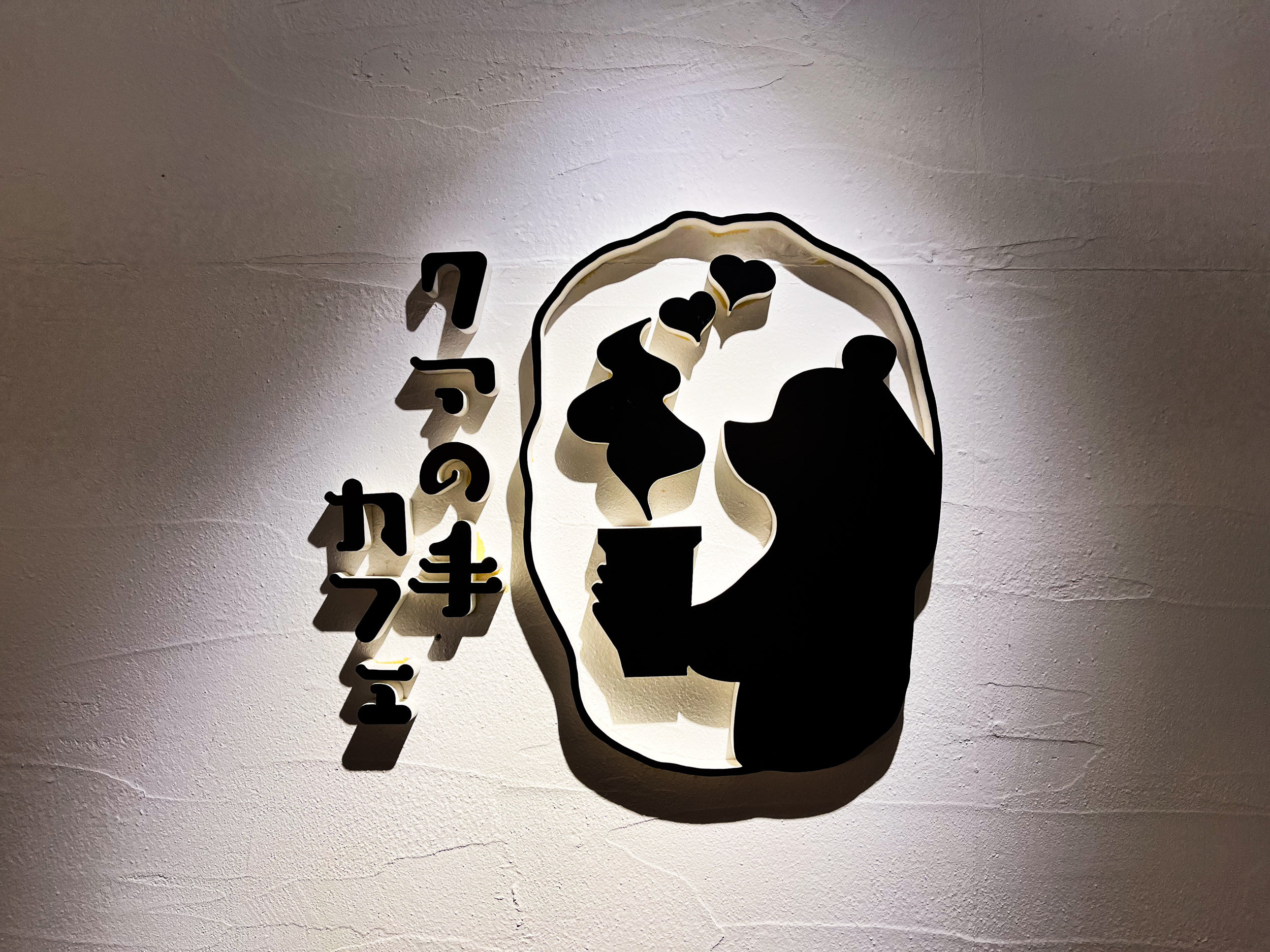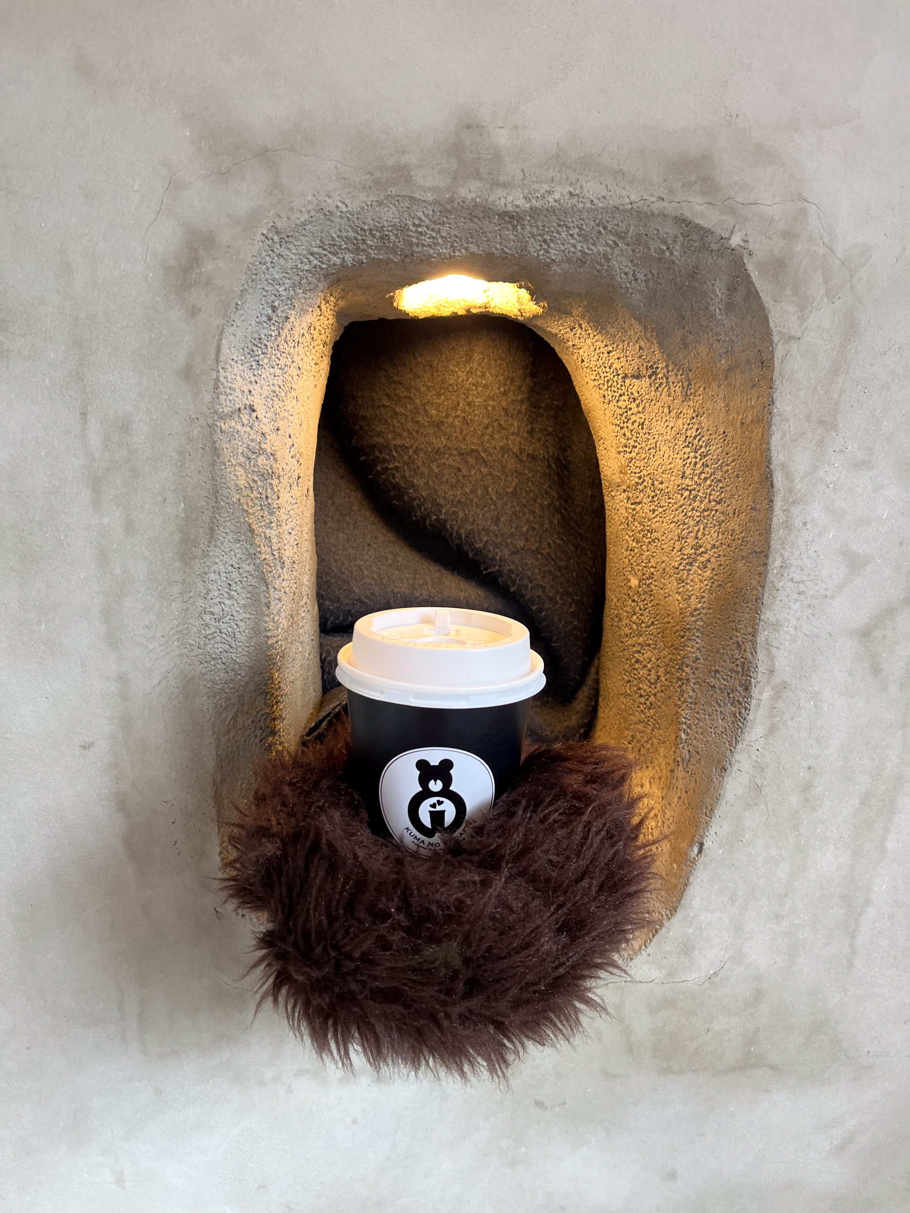 C’est un concept vraiment original, on passe la commande au travers d’un trou dans le mur, il y a un rideau on ne peut pas voir qui se trouve de l’autre côté, puis quelques minutes plus tard, une main toute velue qui ressemble à une patte d’ours nous tend le café par le trou dans le mur.