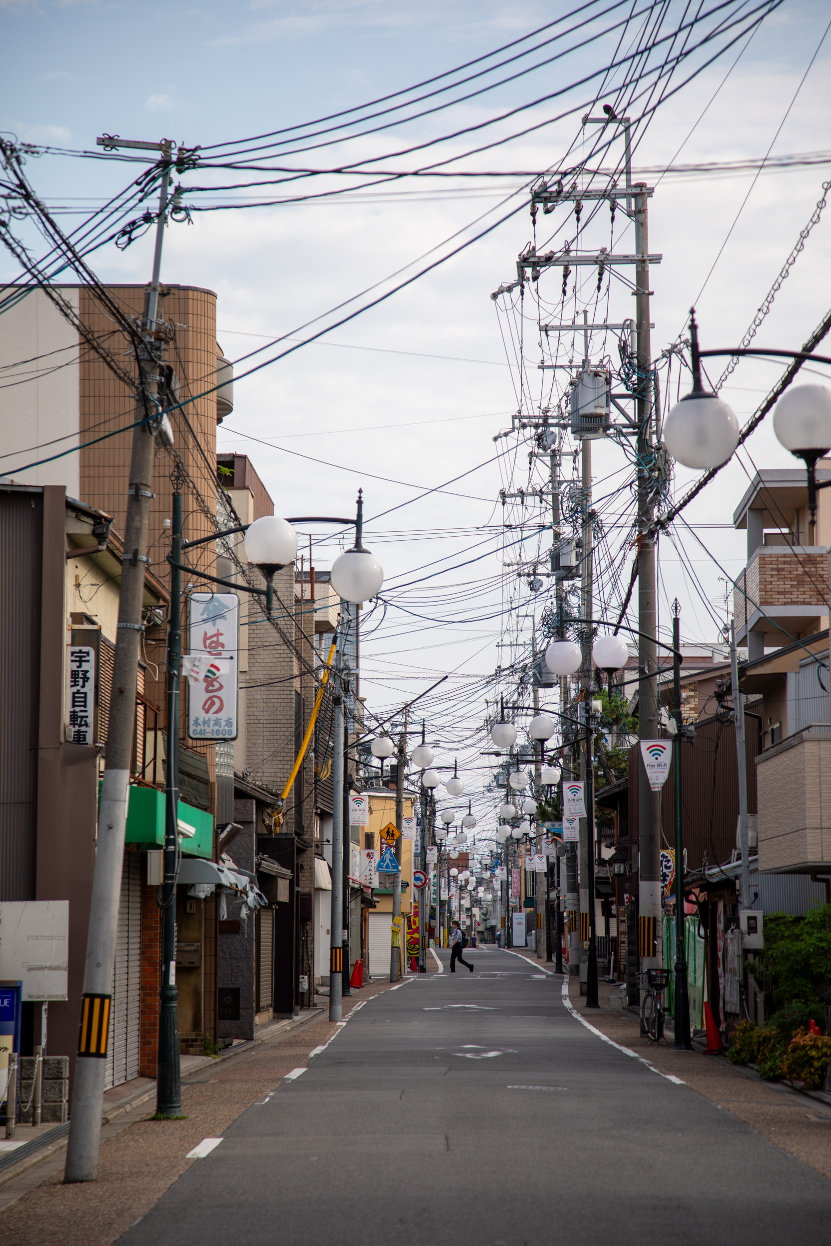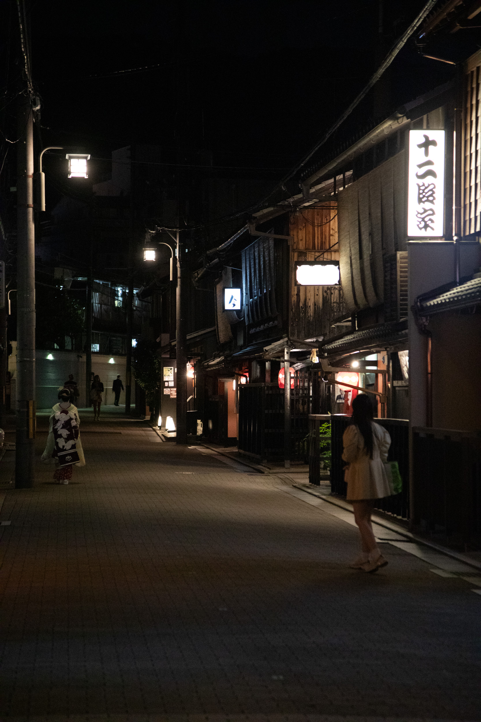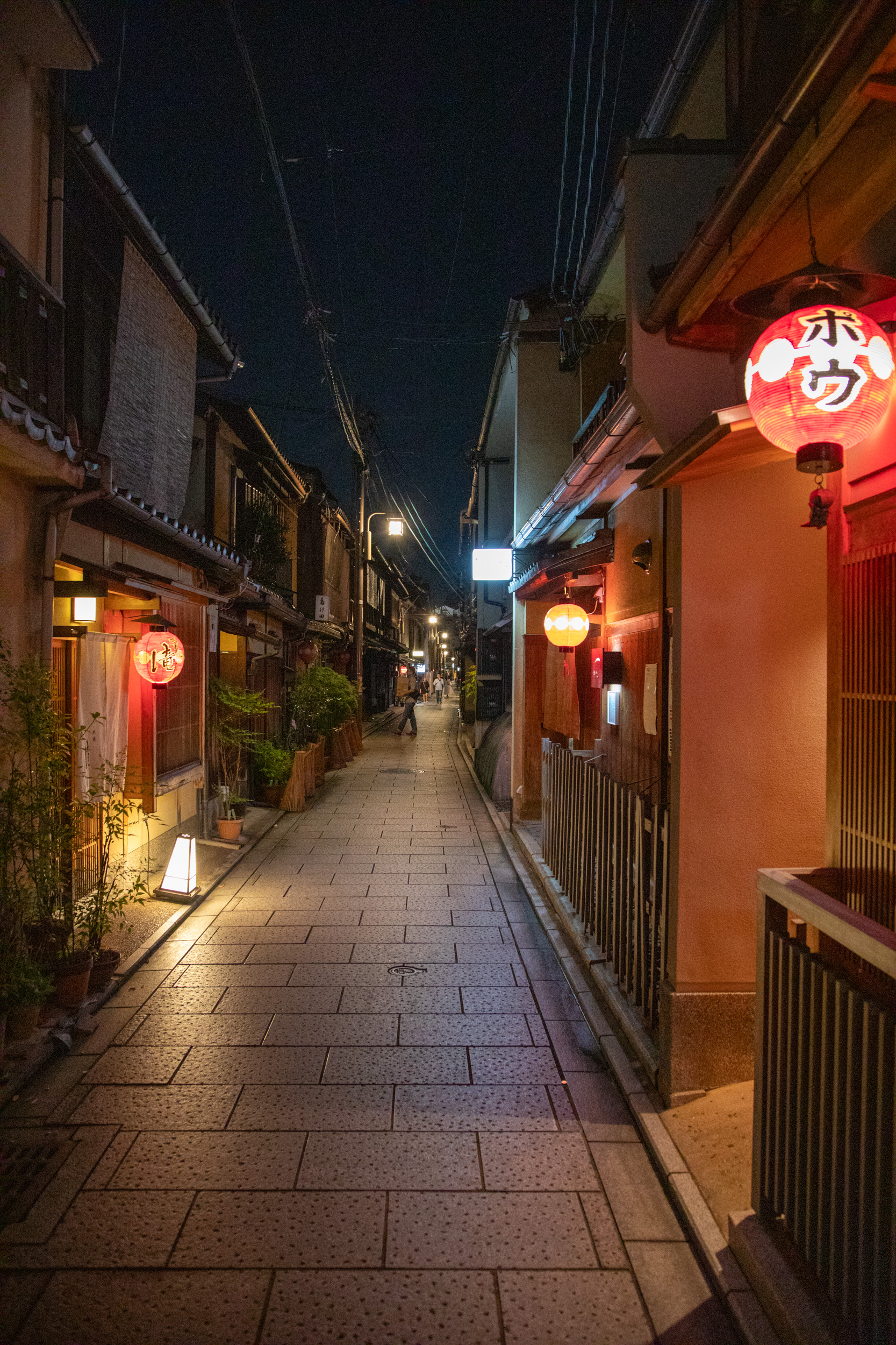 Après quelques 75 minutes très confortables, on arrive en début de soirée à Kyoto. Nous avons choisi un hôtel juste à côté de la gare car c’est le point névralgique pour circuler et bien plus simple. Il y a bien sûr de superbes hôtels traditionnels autour de Kyoto mais pour un séjour aussi court, on préfère jouer sur le côté pratique. Le choix de ce quartier est payant, on ne s’embête pas avec les bagages pour trouver un taxi, on arrive en quelques minutes de marche pour les déposer puis on repart directement. Il faut dire que notre temps est compté en plus la météo n’est pas des plus favorables à cette époque de l’année, on a une fenêtre de beau temps, on décide de rejoindre directement le quartier de Gion, fascinant de nuit. Les lumières éclairent faiblement les ruelles avec les maisons aux façades de bois. L’atmosphère est envoûtante, il fait nuit, peu de gens dans les rues, on se croirait être dans le Japon médiéval.