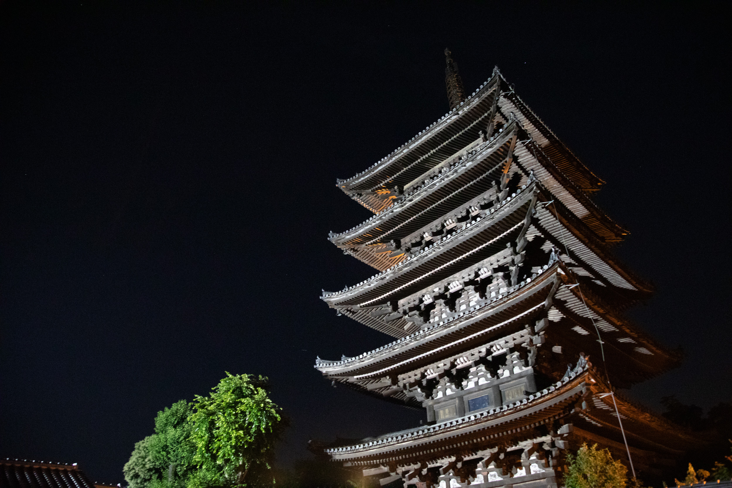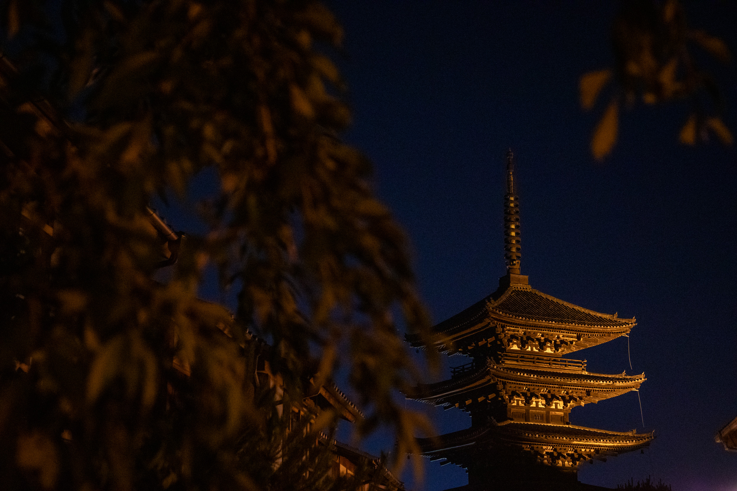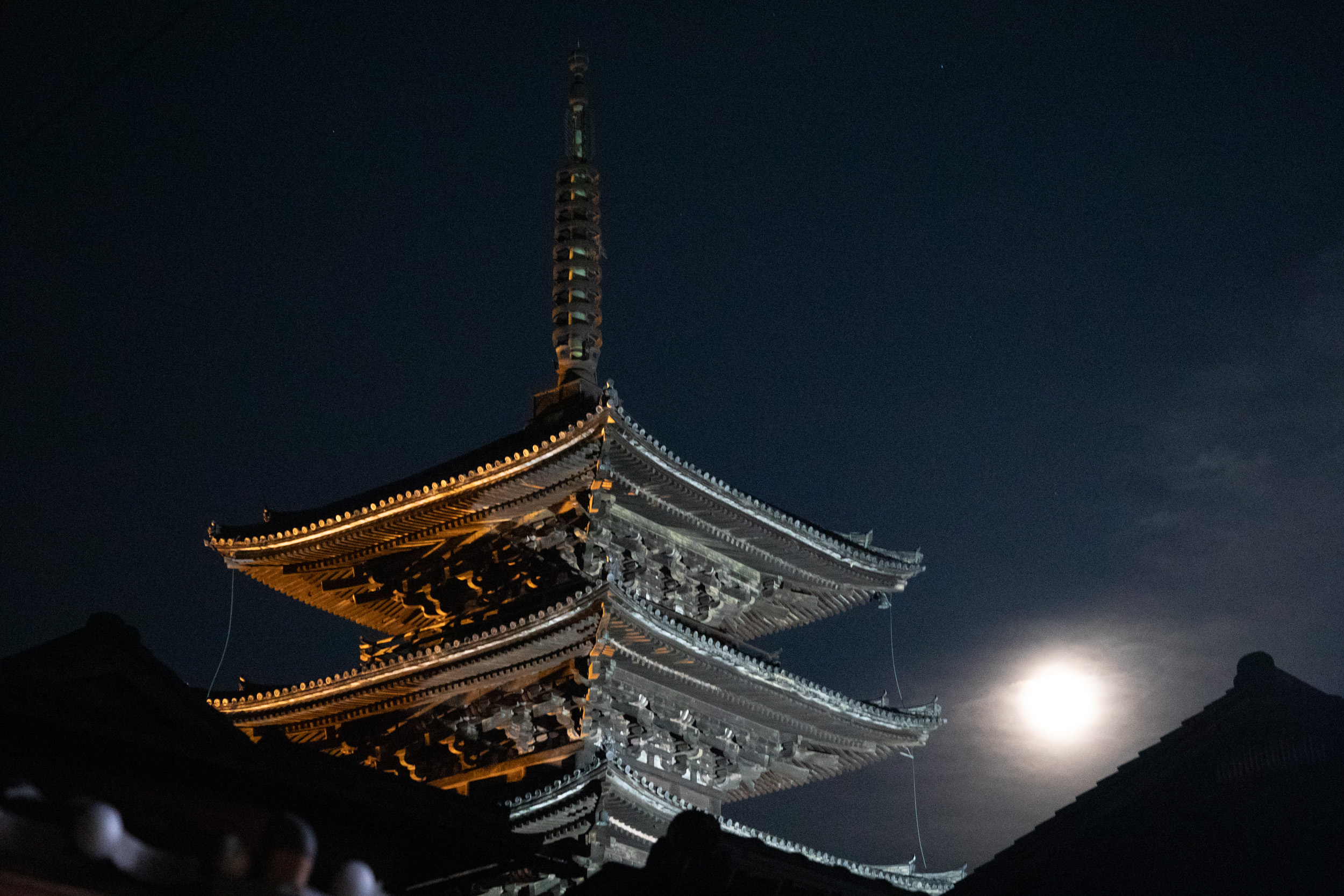Ce soir c’est le solstice d’été et la lune est énorme, elle se lève juste derrière la pagode de Yasaka.