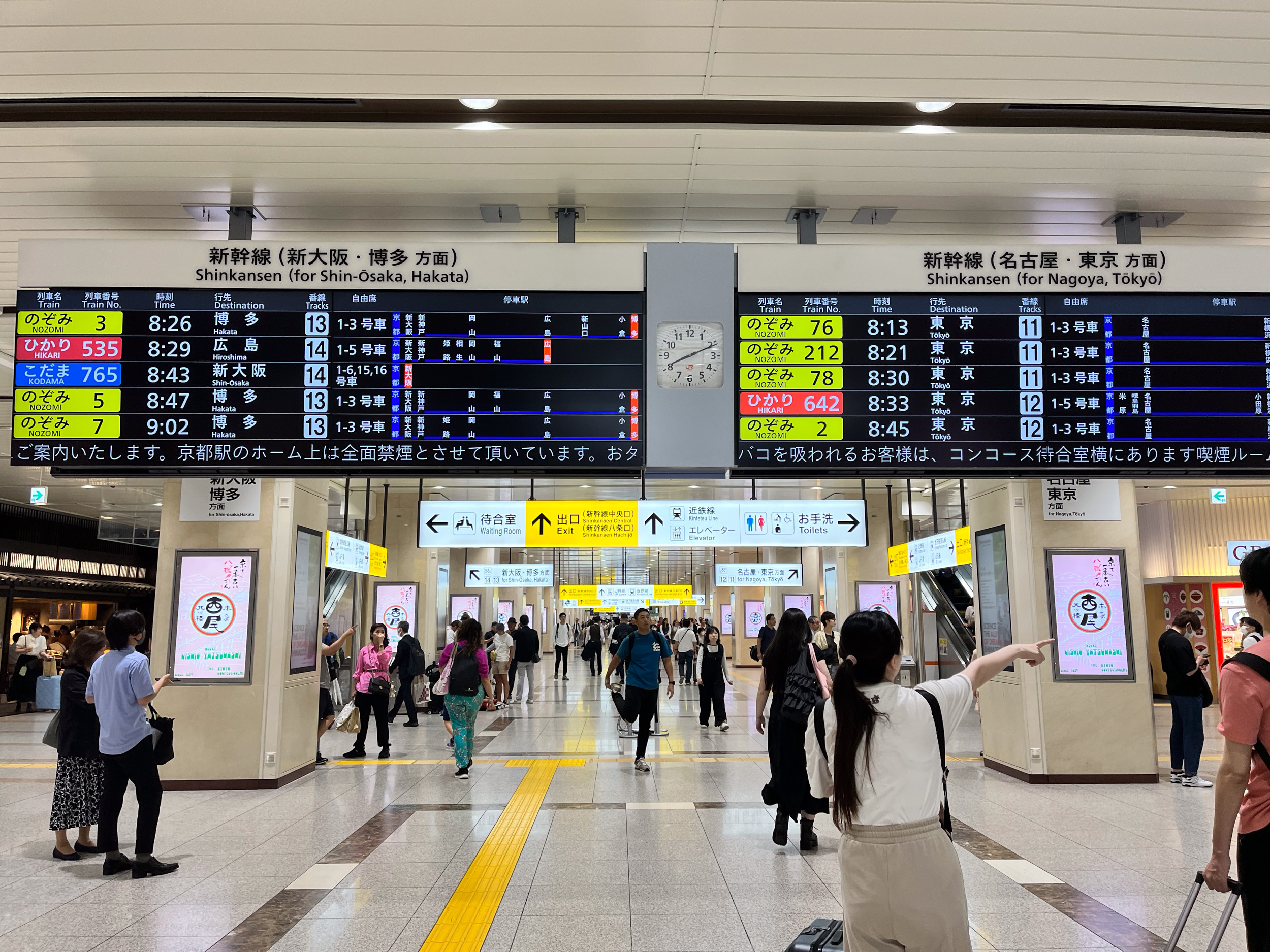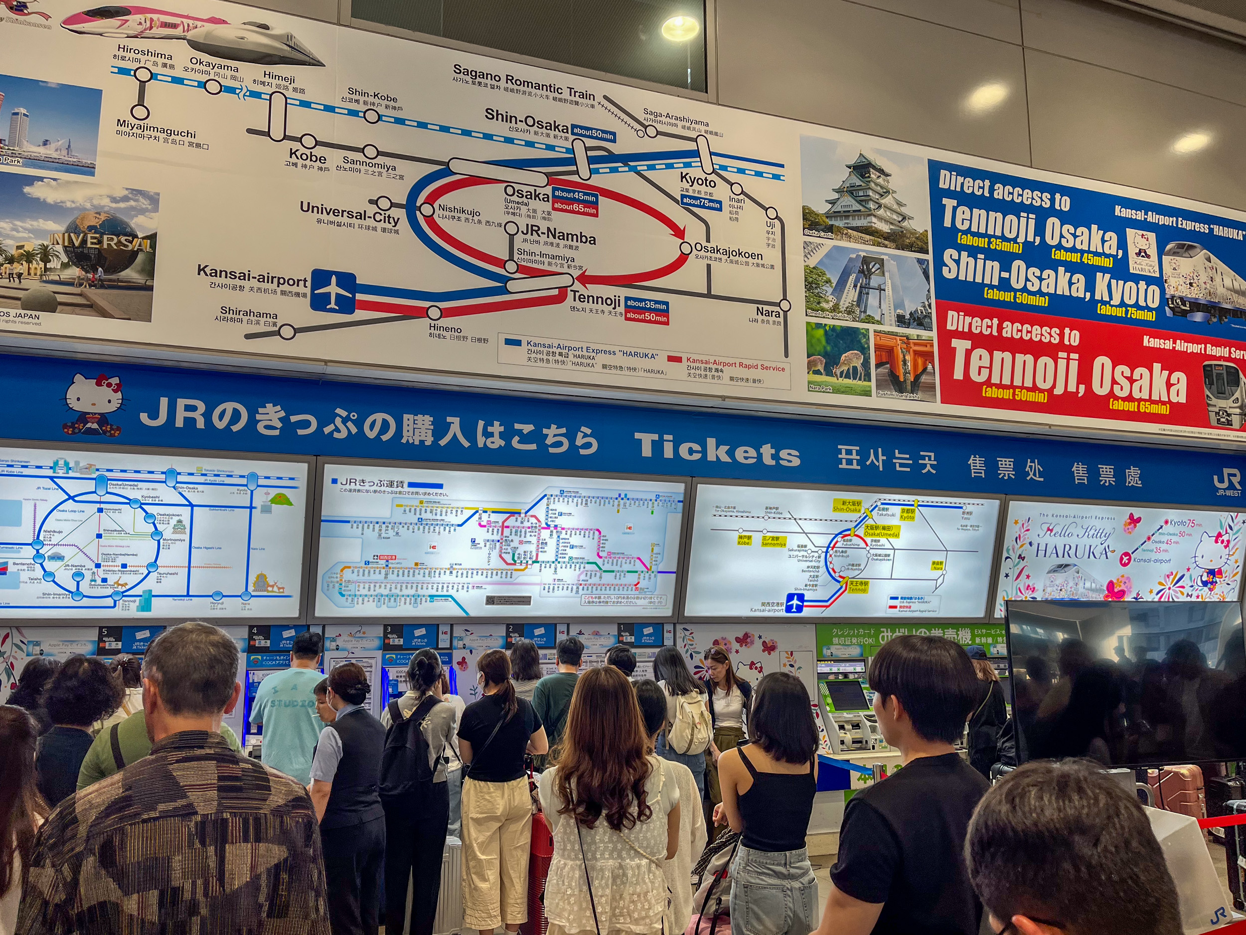 Pour rejoindre Kyoto depuis les airs il faut voler en direction de l’aéroport d’Osaka, l’aéroport de Kansai du nom de la région d’Osaka. L’arrivée se fait de manière très rapide et organisée comme on peut l’imaginer en arrivant au Japon. En sortant de l’aéroport plusieurs choix sont disponibles pour relier Kyoto depuis l’aéroport, distant environ d’une centaine de kilomètres seulement. Il y a le bus ou le train, alors que le premier se trouve juste en face du terminal international, il faut marcher quelques minutes de plus pour rejoindre la gare ferroviaire. C’est une gare typiquement japonaise, avec beaucoup de monde et différents guichets pour différents train, heureusement tout est sous-titré en anglais donc on trouve facilement.