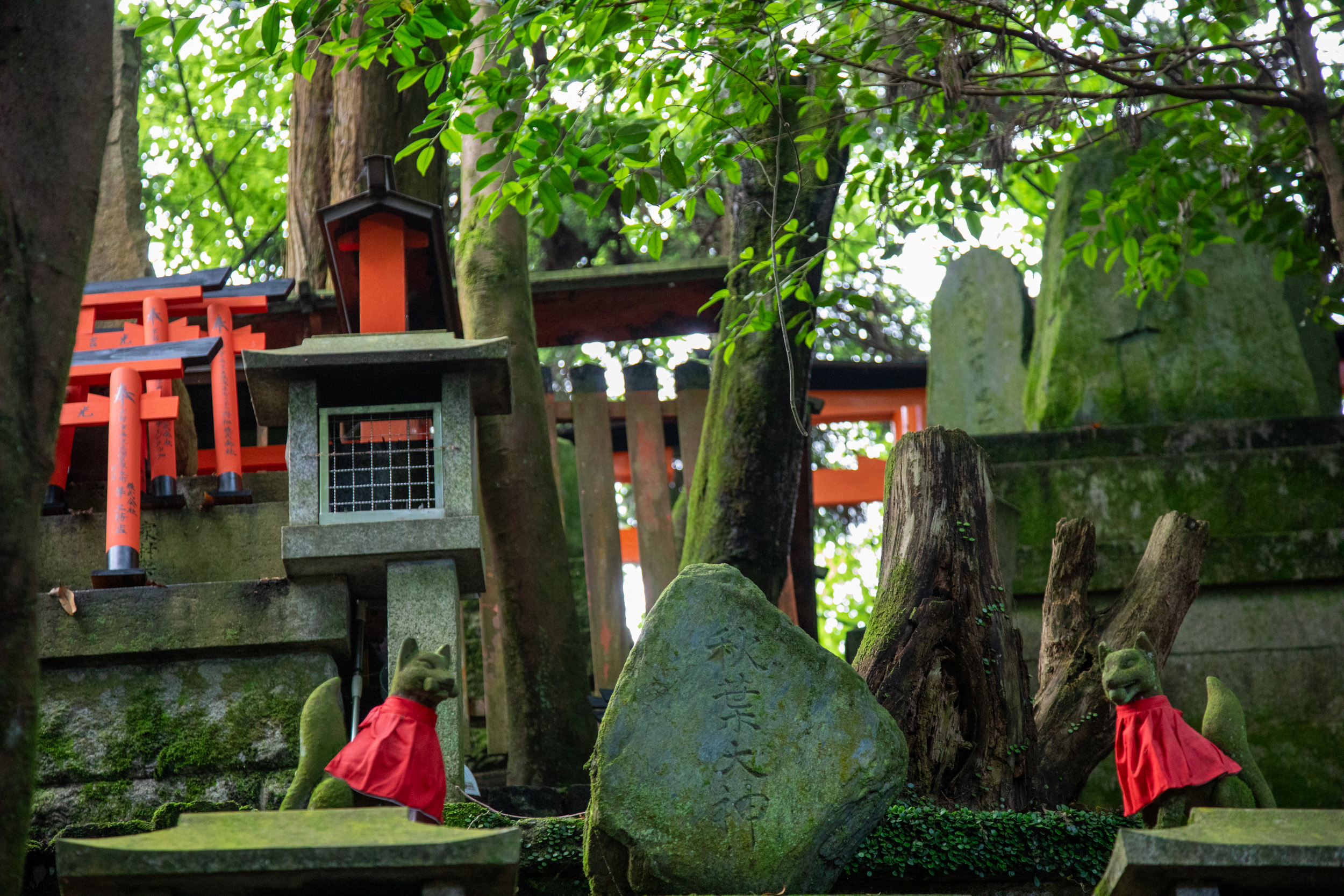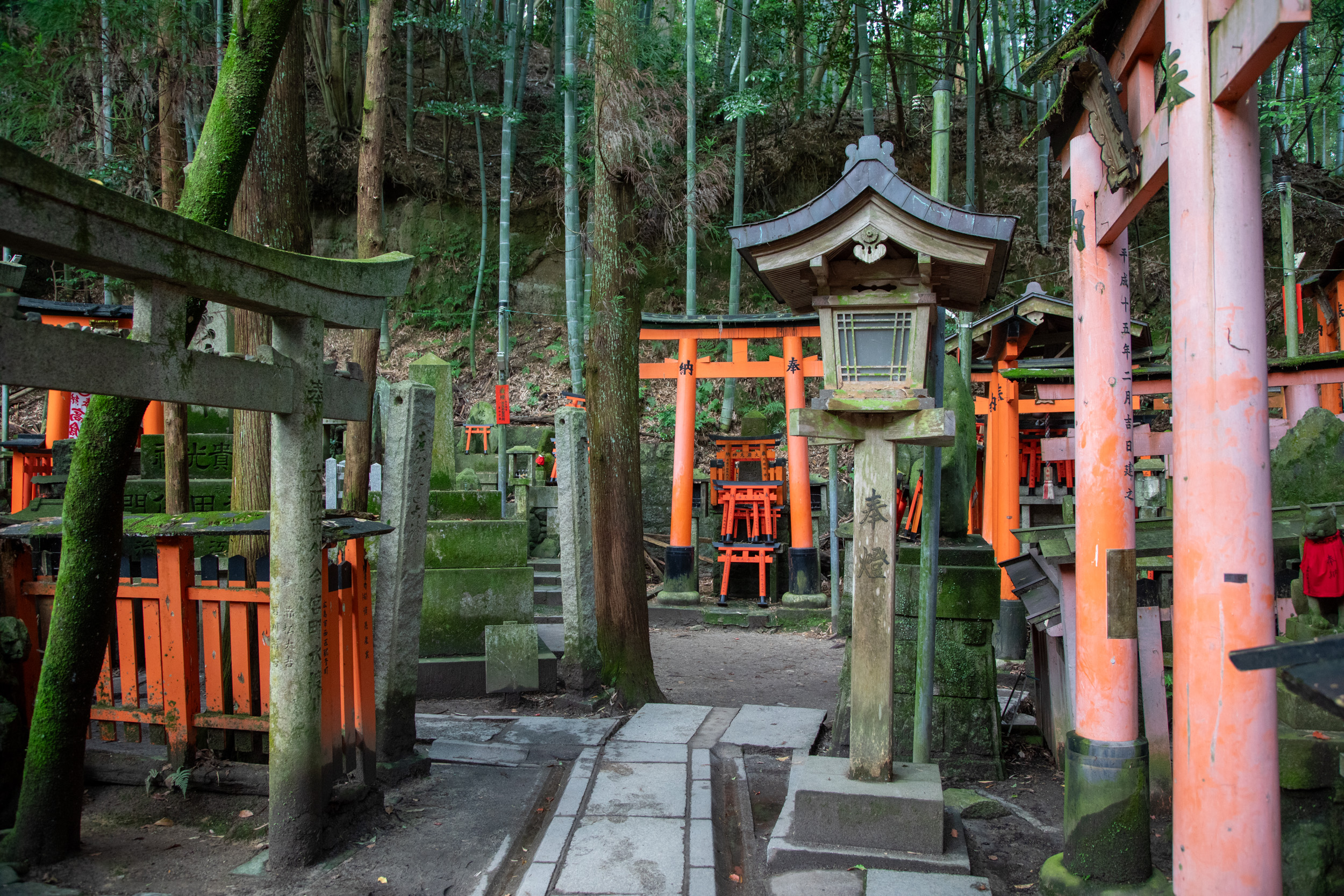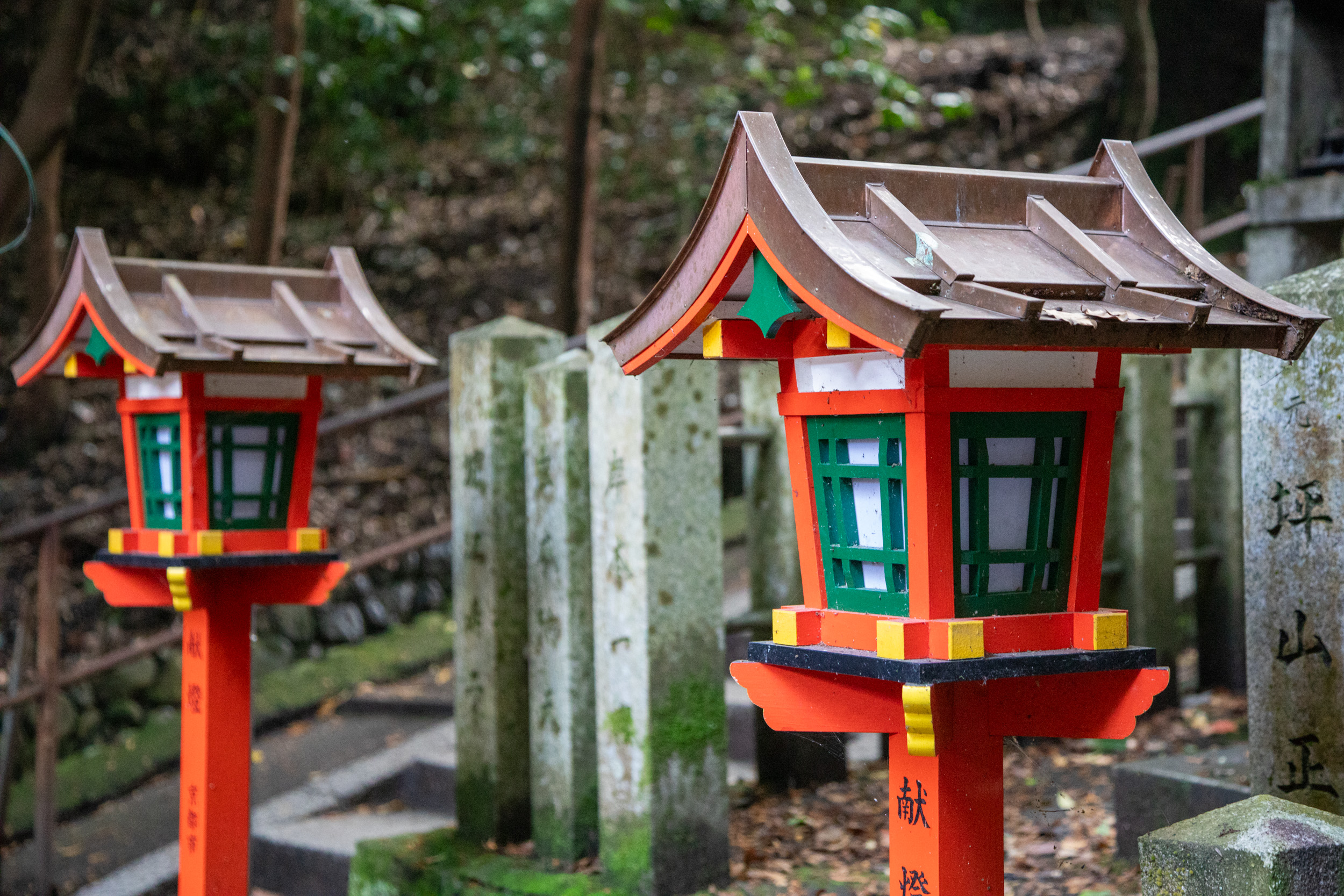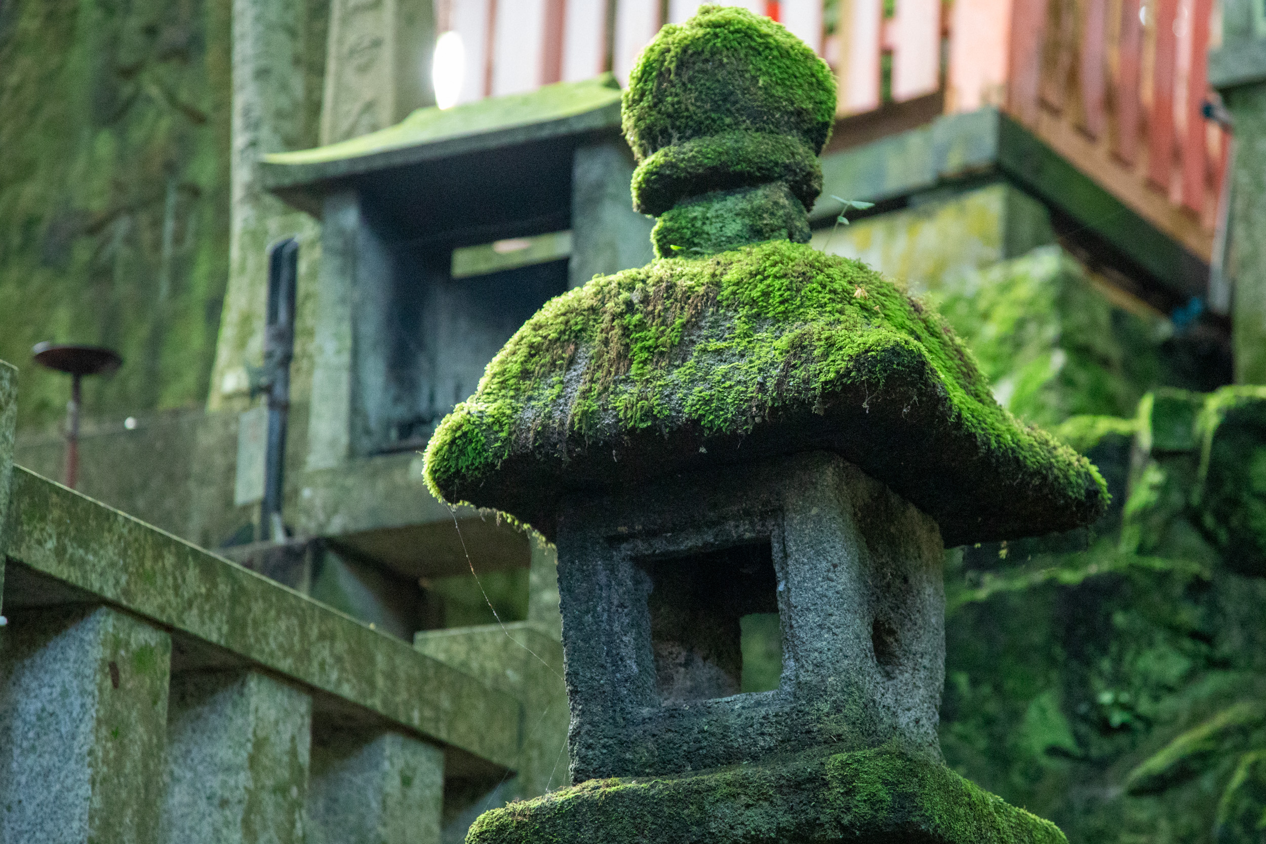 La mousse recouvre les lanternes de pierre