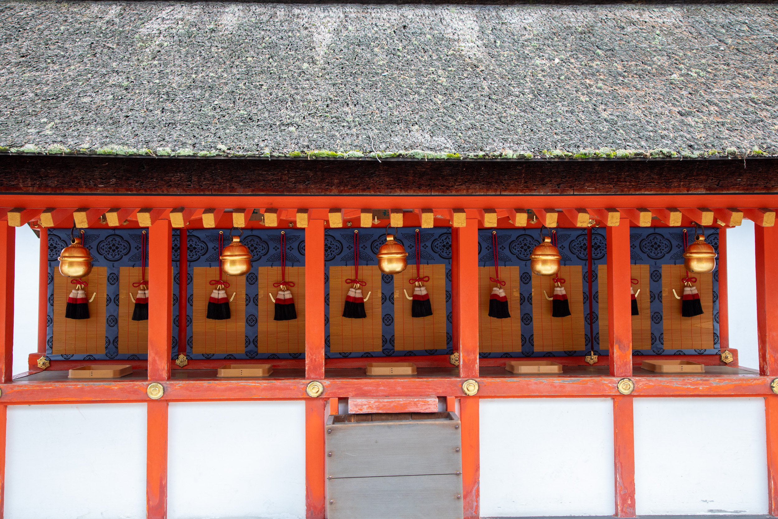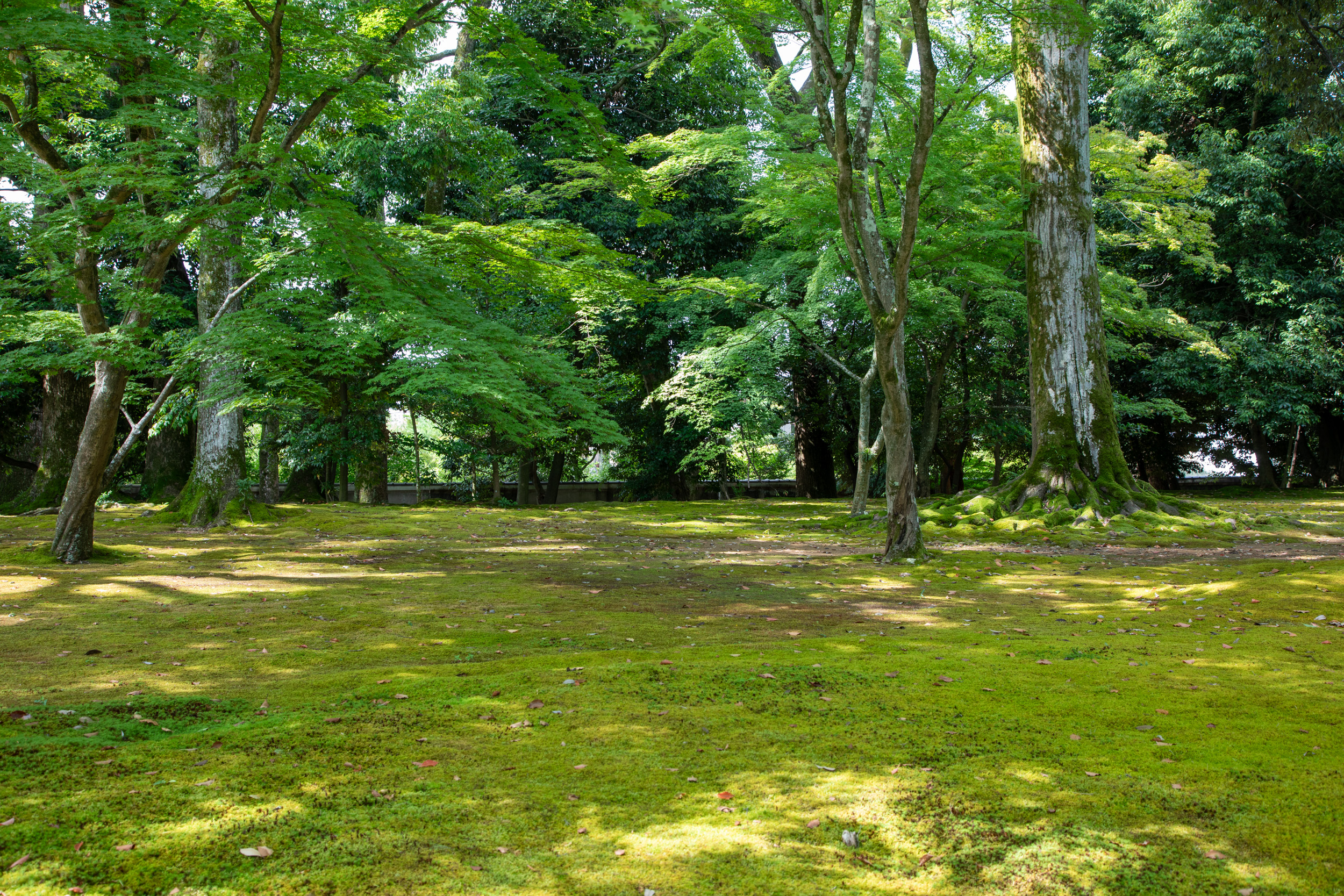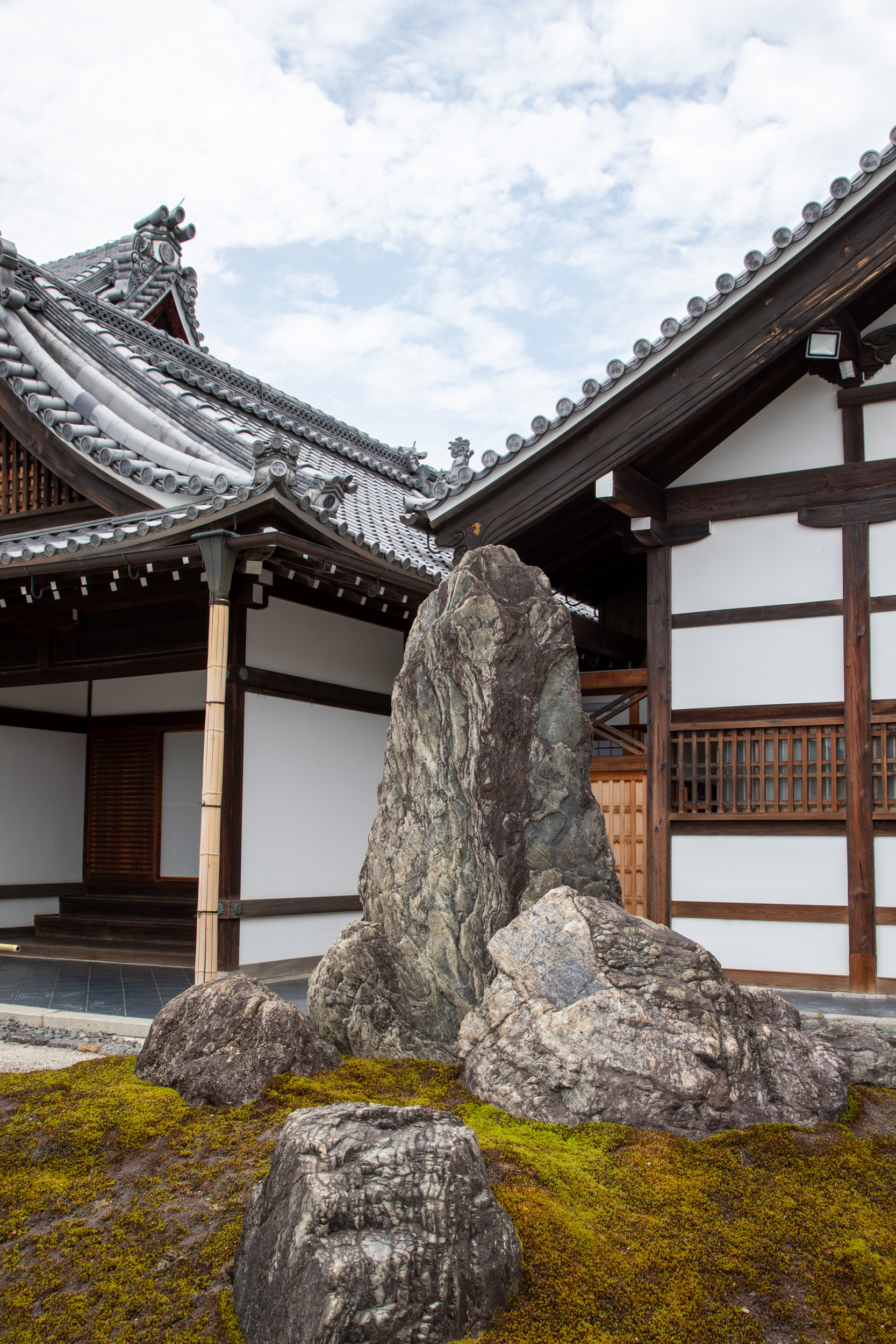 Pour éviter la foule et visiter avec plus de calme, on se rend une dizaine de minutes avant l’ouverture du temple à 9 heures devant les portes fermées. Il y a déjà une vingtaine de personnes qui nous précèdent. En attendant, on peut admirer le jardin attenant du temple avec la mousse qui recouvre le sol.