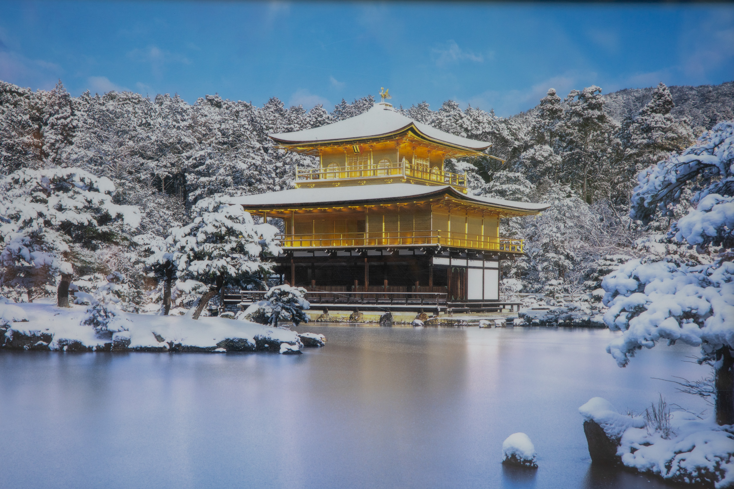Il y a une petite promenade autour des jardins magnifiques du temple d’or. Que ce soit au printemps ou en automne, les arbres doivent se parer de leurs plus belles couleurs, il y a beaucoup d’érables du Japon. Mais pour l’esthétique japonaise, l’image la plus recherchée du Kinkaju c’est étonnamment ni l’une ou l’autre saison, mais sous la neige, quand le blanc vient trancher avec l’or qui brille.