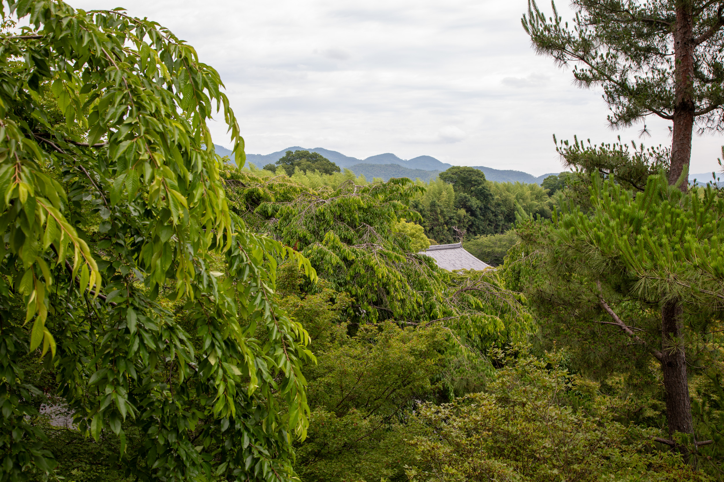 Le chemin monte ensuite pour donner un panorama sur les arbres et duquel on peut voir le toit de la pagode au travers la végétation.