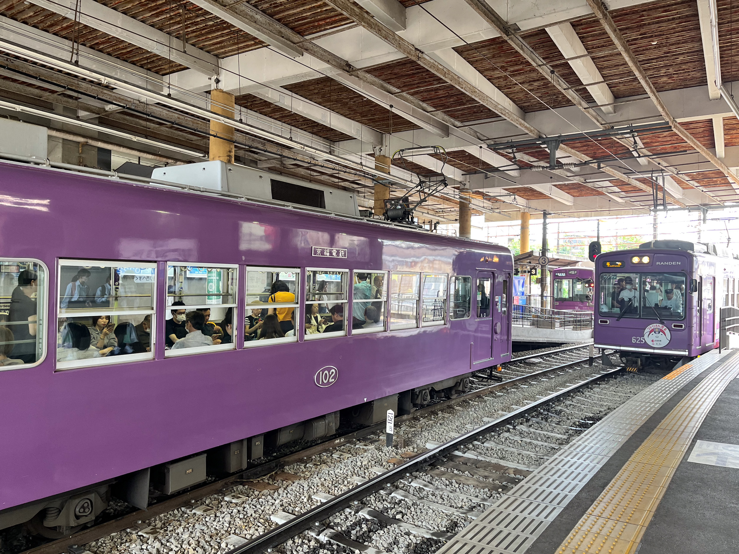 Après la découverte du temple d’or, on reste dans la partie nord de Kyoto et on rejoint le parc de Arashiyama et sa forêt de bambous. C’est en effet très logique comme suite d’itinéraire car la liaison est très pratique avec le seul tramway de Kyoto qui relie rapidement l’un à l’autre, il suffit de marcher une quinzaine de minutes jusqu’à la gare. En plus c’est un tramway qui mérite en soi le détour, plus que centenaire, avec son wagon unique de couleur violet, il se faufile au milieu des maisons d’un quartier résidentiel de Kyoto.