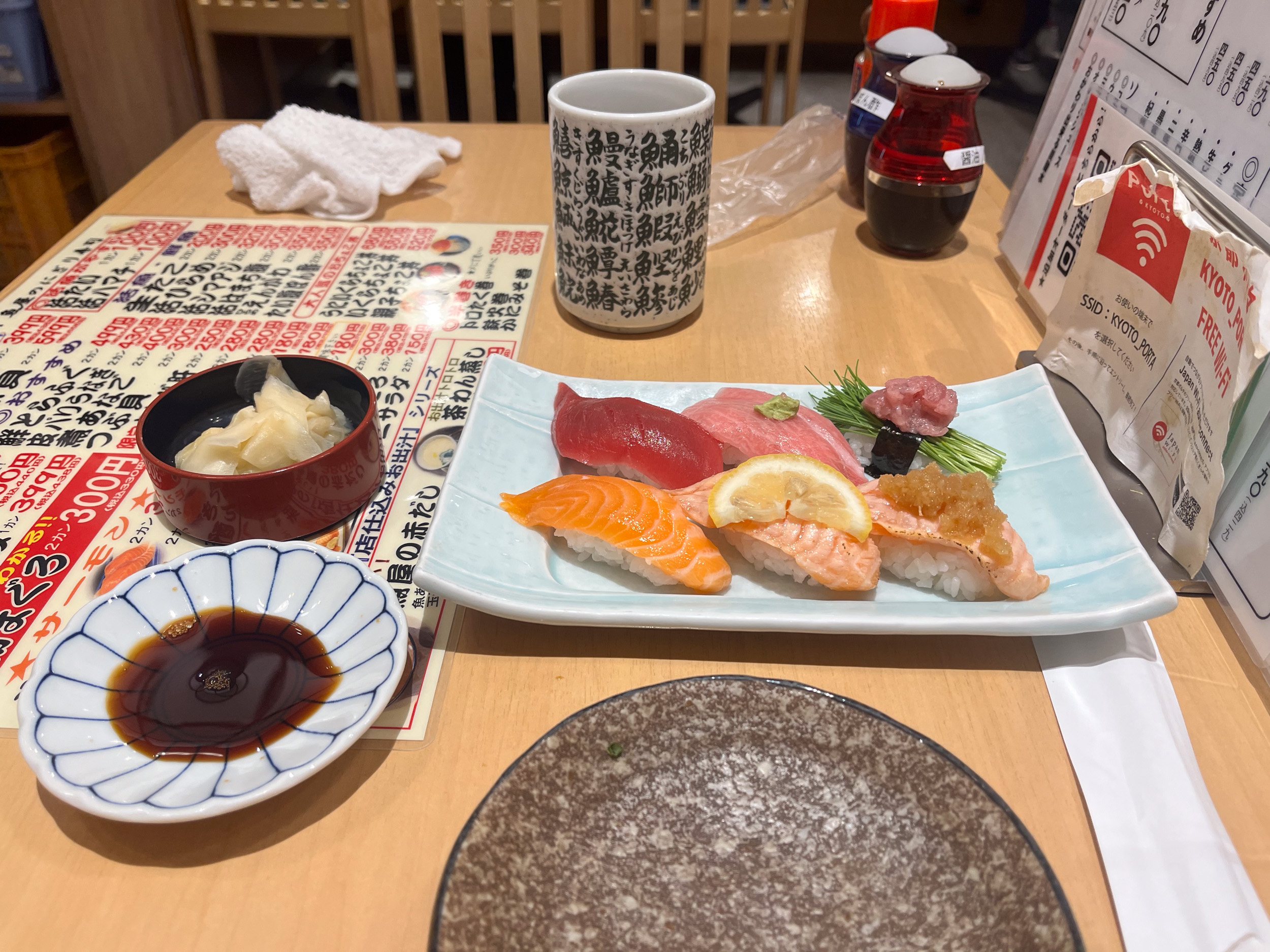 Je retourne au centre ville de Kyoto pour passer l’après midi vers le temple de Kiyomizu Dera, le dernier des sites touristiques les plus importants de Kyoto. Sur la route je m’arrête dans un restaurant qui sert des sushis, un restaurant sans prétention, car je ne veux pas chercher un restaurant recommandé par un guide car on est en week-end il y a beaucoup de monde et je risque de devoir faire plus d’une heure de queue. Finalement les sushis sont déjà excellents, je n’ose pas imaginer si je me rends dans un restaurant réputé !