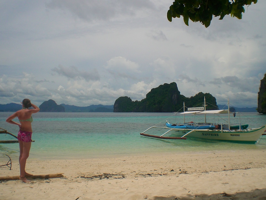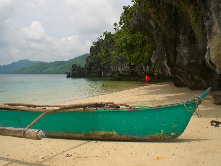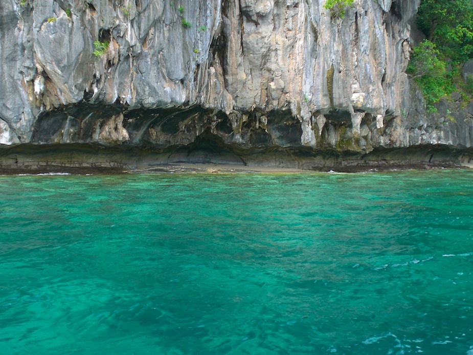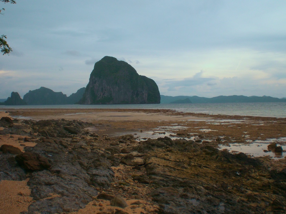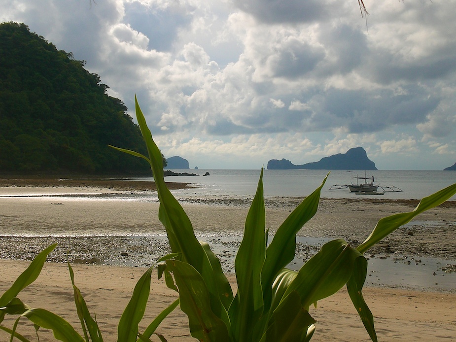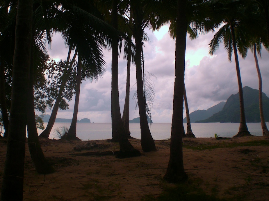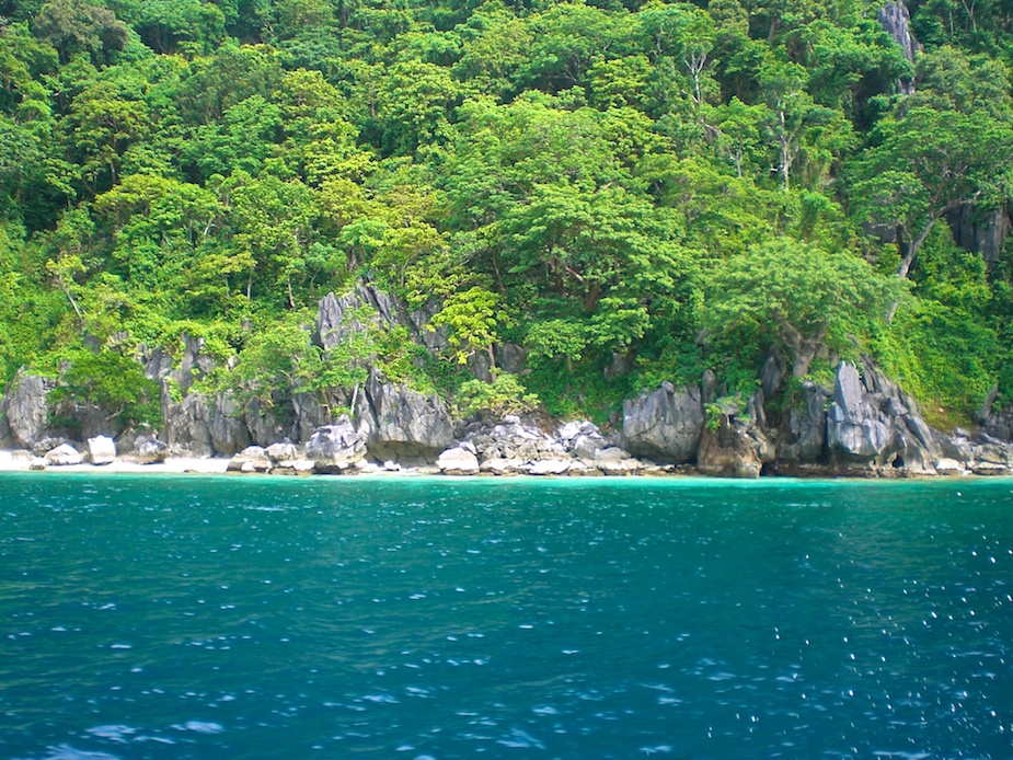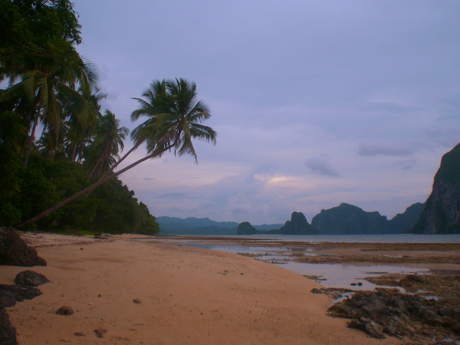 Lors de cette deuxième journée d'excursion, nous prenons un bateau pour les sites les plus emblématiques de la baie d'El Nido, des montagnes de karst et une mer bleue turquoise sont au programme mais aussi un repas sur la plage d'une île presque déserte. On est seulement dérangé par un très gros varan habitué d'obtenir les carasses de poulet que les visiteurs lui accorde.