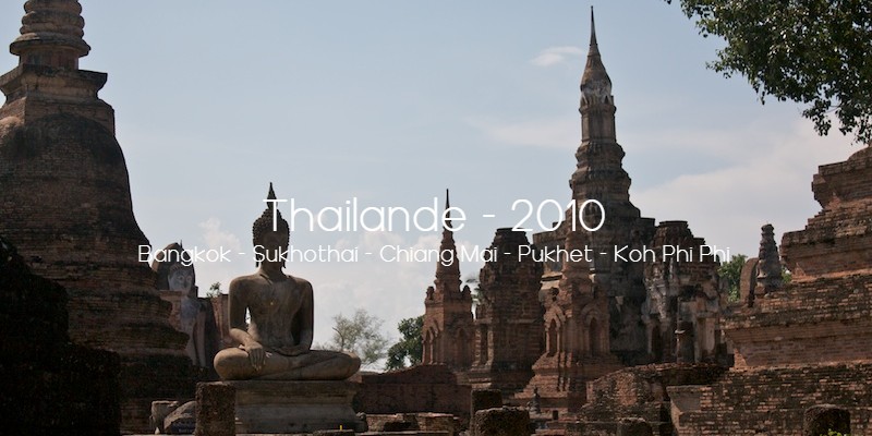 Sur un coup de tête on s'envole en Thailande pour passer un mois de Bangkok au Nord humide puis aux îles de la Mer d'Andaman. Malgré l'impréparation de ce voyage, nous serons vraiment conquis par les paysages de la Thailande et l'ambiance en général, surtout dans les régions du Nord du pays avec les ruines du royaume de Sukhotai que l'on visite en scooter, la nature luxuriante de la campagne autour de Chiang Mai. Les îles de la mer d'Andaman sont sans doute magnifiques, mais la saison des pluies ne leur rend pas le plus bel hommage.