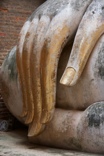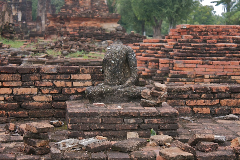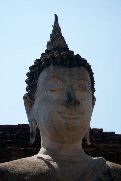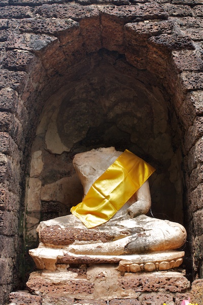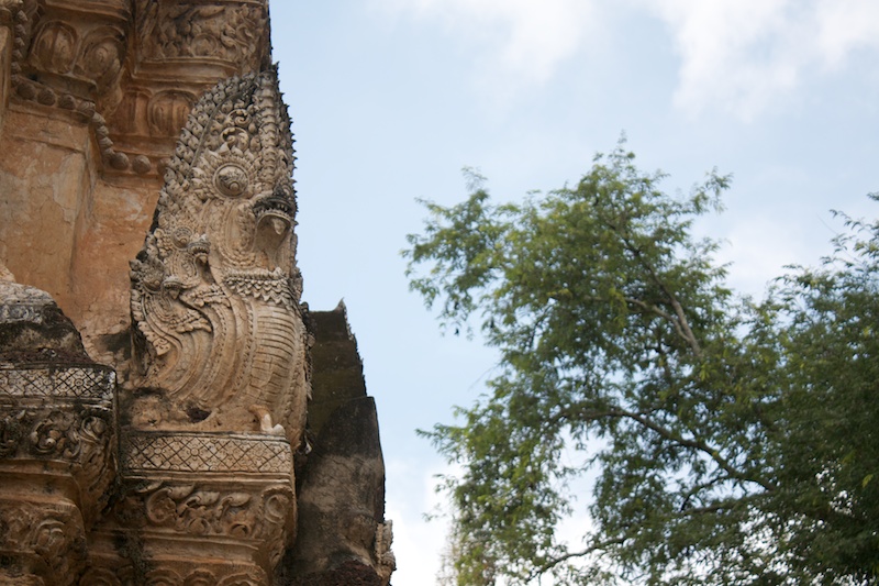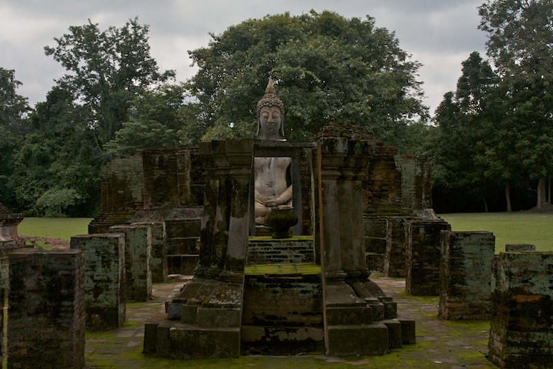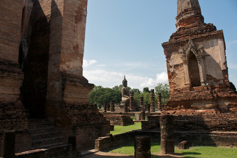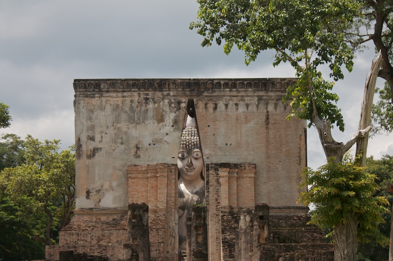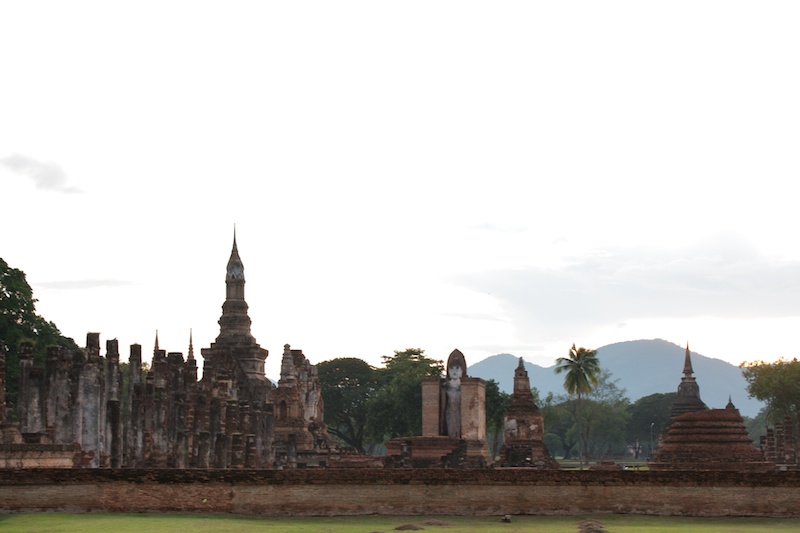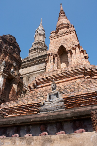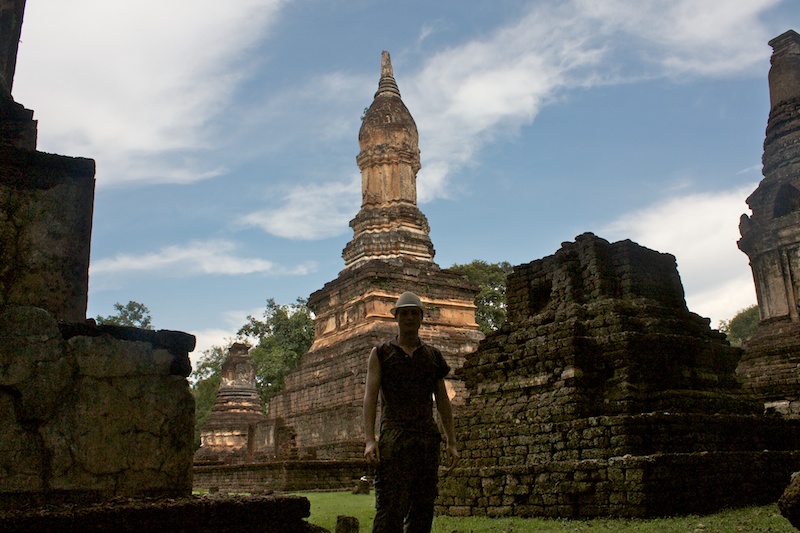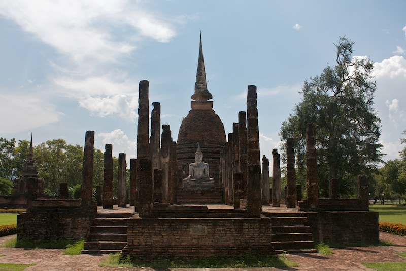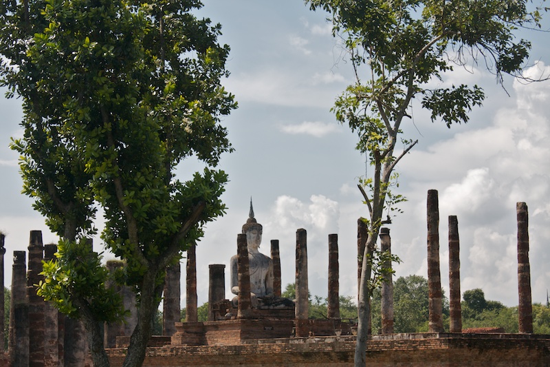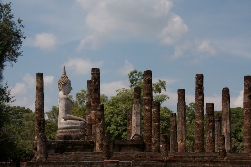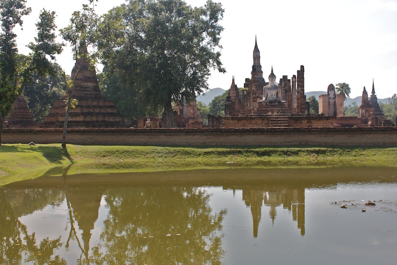 Sukhothai est connue comme la capitale du premier royaume Thaï. Il ne reste aujourd’hui que des vestiges qui témoignent de la grandeur et la puissance de Sukhothai. Ils se visitent le plus simplement en moto car ils sont éparpillés dans la jungle autour de la nouvelle ville de Sukhothai. Le site est époustouflant, les piliers, les chedi et les statues de bouddhas géantes se reflètent dans les eaux des lacs artificiels. Nous croisons de nombreux Thaï qui pique-niquent entre les ruines et nous invitent à partager le repas avec eux. Il fait chaud, extrêmement chaud. Avec les motos, nous pouvons découvrir les vestiges perdus dans les collines environnantes ainsi qu’au Nord de la ville. Moins visités, on a presque l’impression d’être des archéologues qui découvrent de nouveaux monuments perdus.