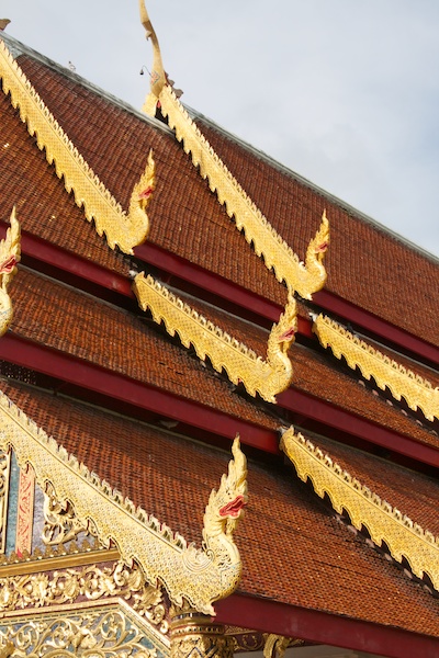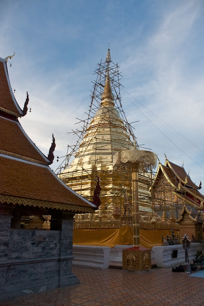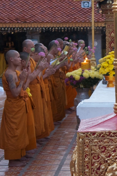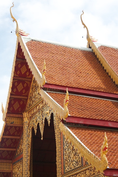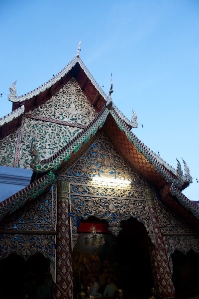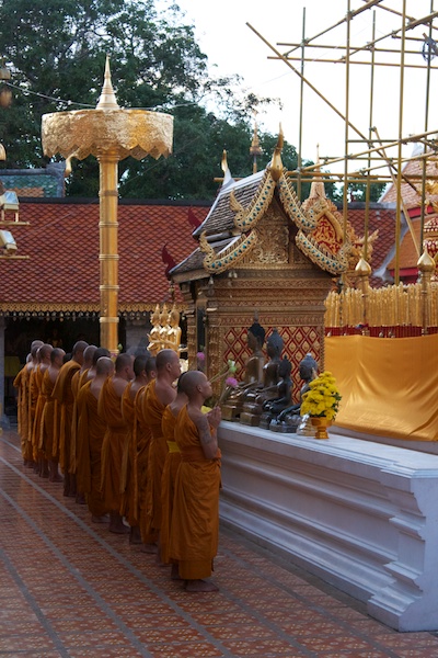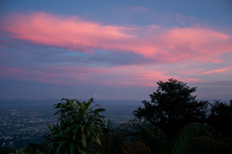 Le soir venu, un peu avant que le soleil ne se couche, nous nous rendons au Doi Suthep. Cette montagne qui surplombe Chiang Mai est visible depuis toute la ville dès que l’on lève la tête. Le coucher de soleil depuis le Doi Suthep et la vue sur la ville s’allumant remplit les yeux de couleurs. La ferveur des disciples du temples (de nombreux étrangers ont d’ailleurs pour l’occasion revêtu une toge blanche) dans la pénombre montante ajoute du mystique à la scène.