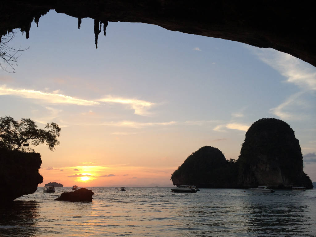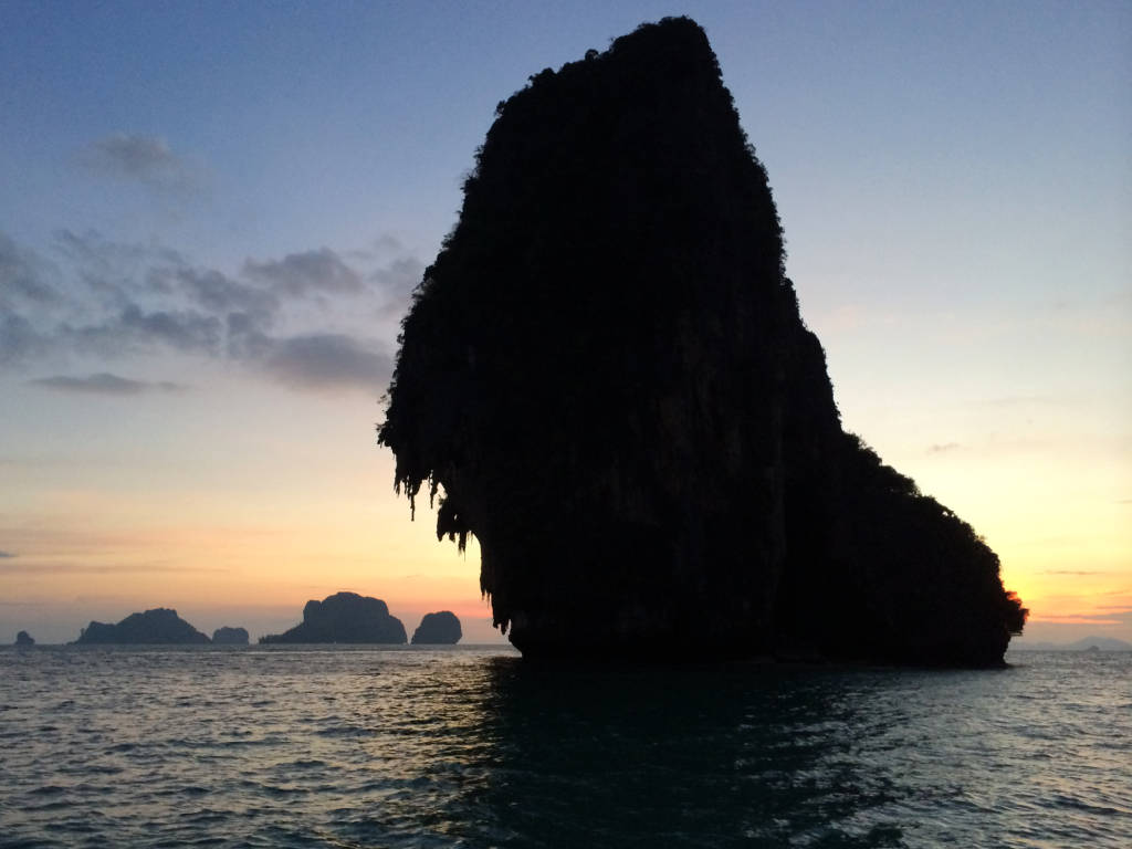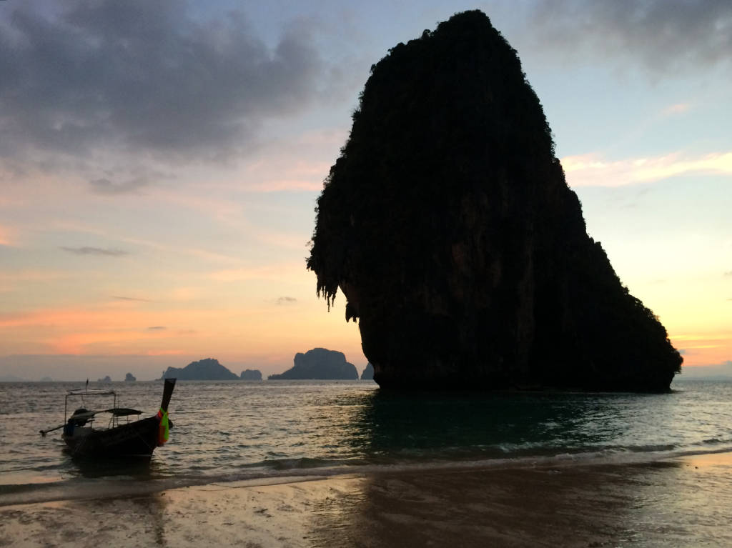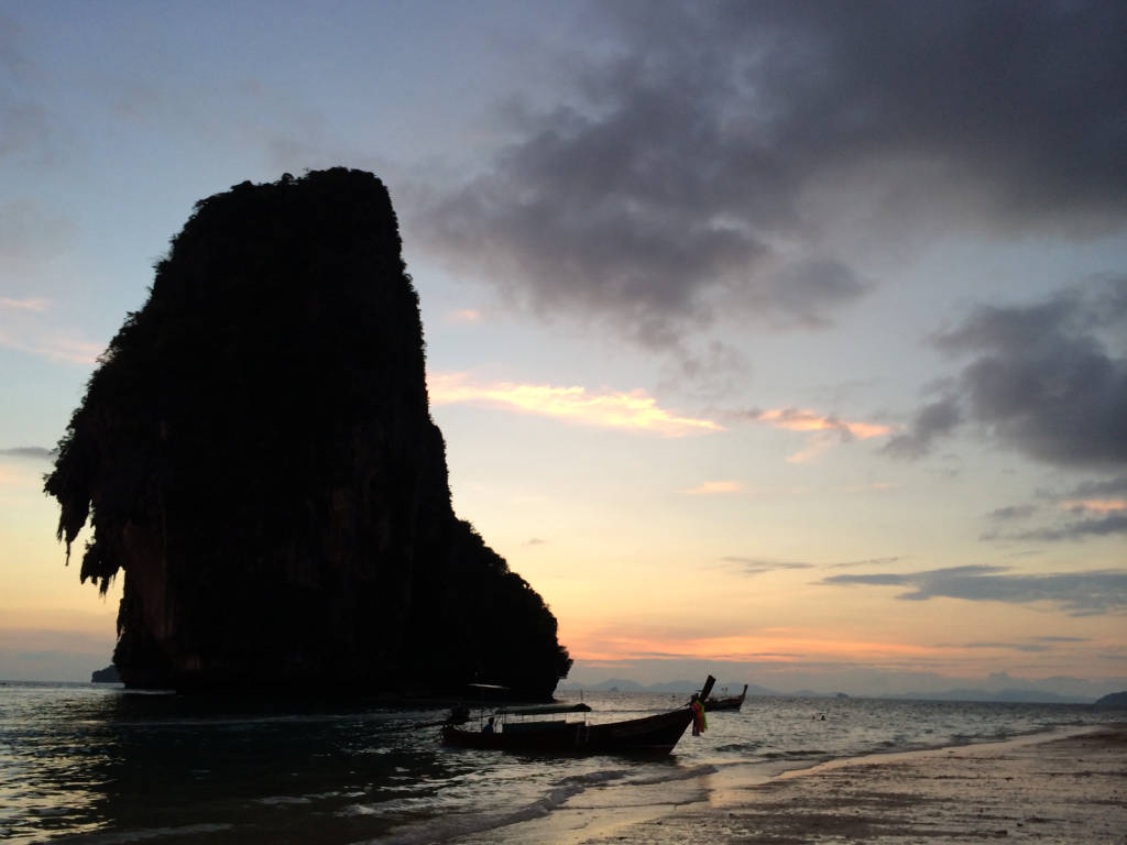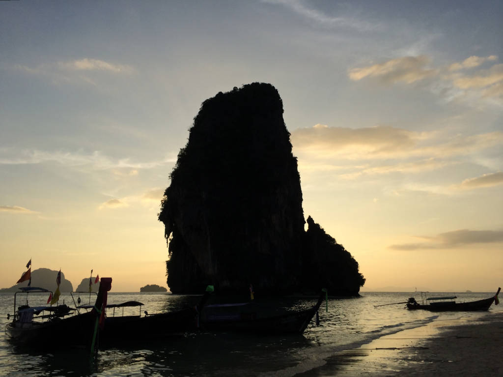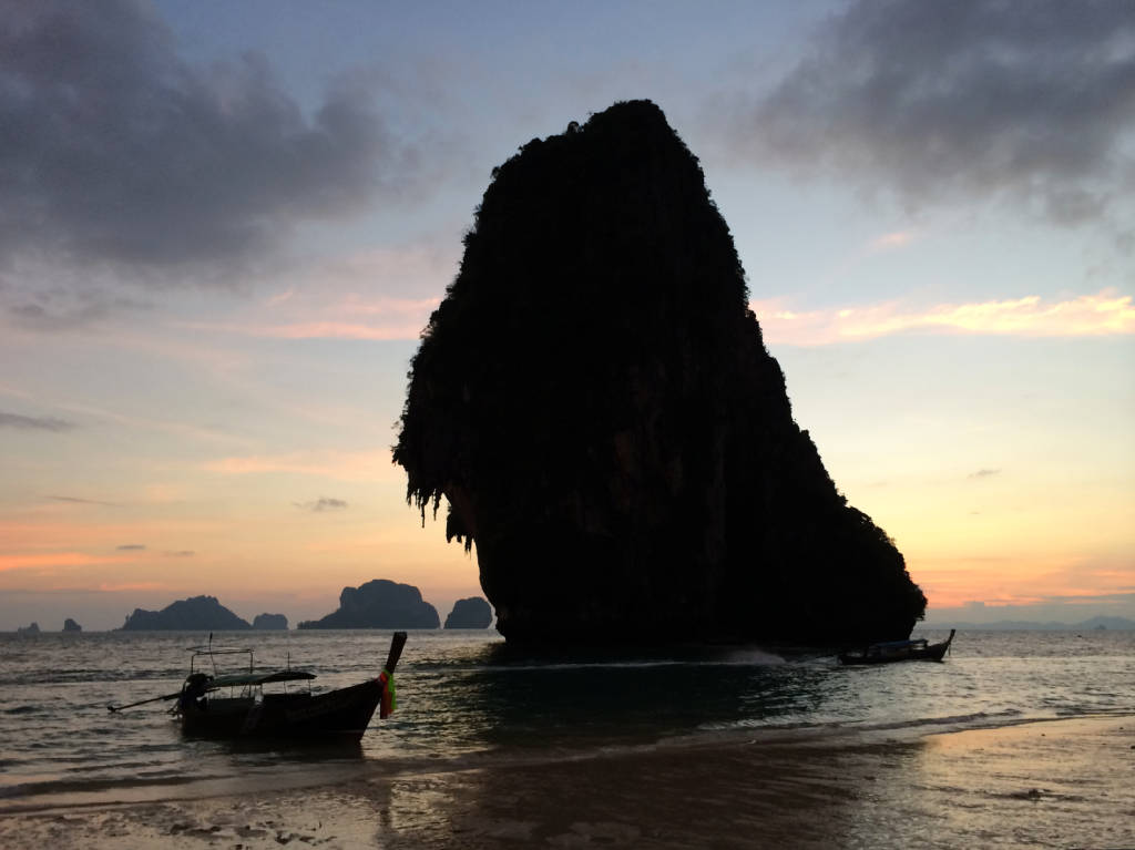 Railay est la péninsule tout au Sud de Ao Nang, on accède à la plage de Phra Nang Beach par bateau seulement, en accostant sur cette longue plage de sable qui fait face à un grand pic de karst solitaire dans la mer, on assiste à un fabuleux coucher de soleil.