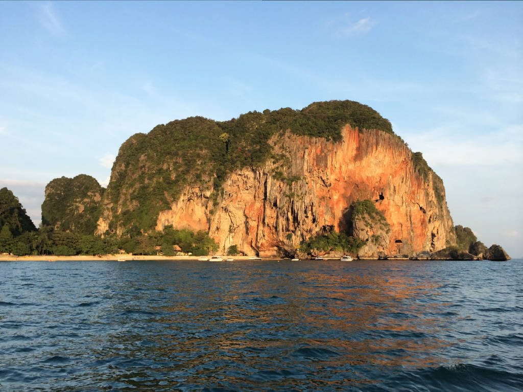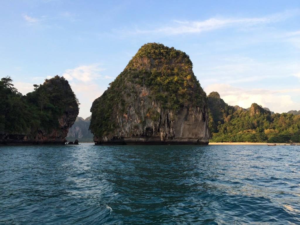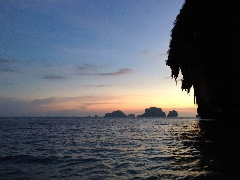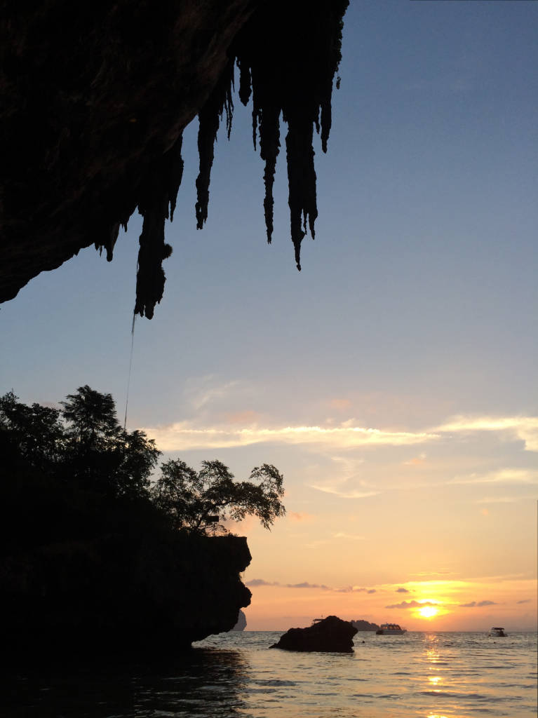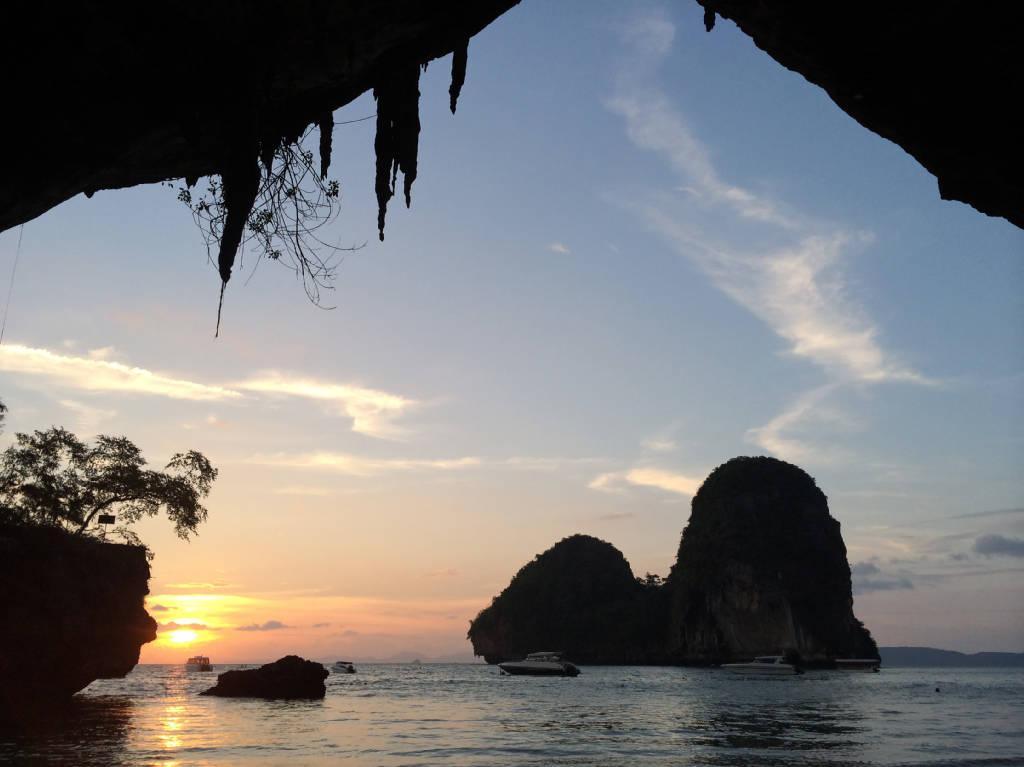 Railay est la péninsule tout au Sud de Ao Nang, on accède à la plage de Phra Nang Beach par bateau seulement, en accostant sur cette longue plage de sable qui fait face à un grand pic de karst solitaire dans la mer, on assiste à un fabuleux coucher de soleil.