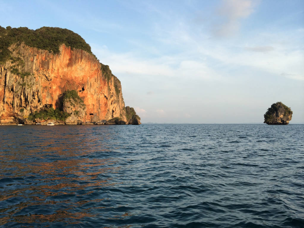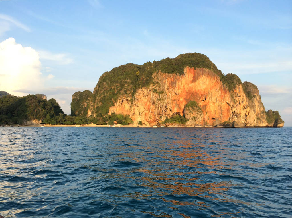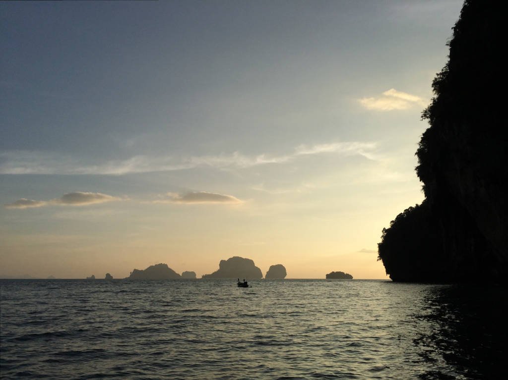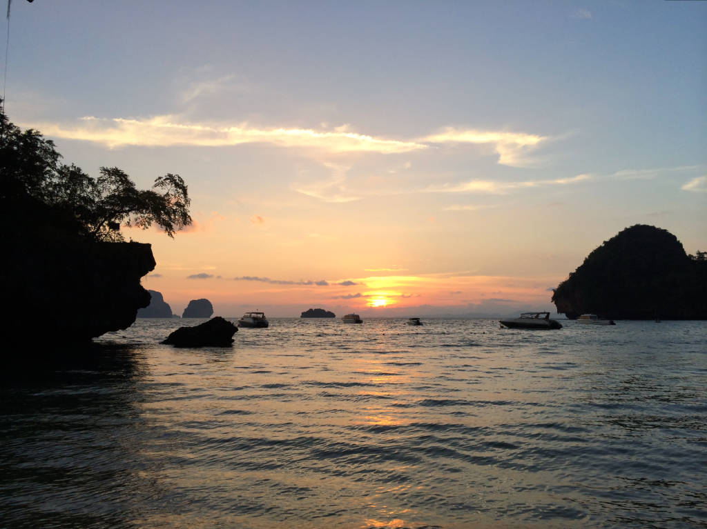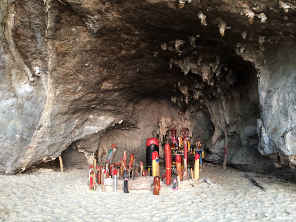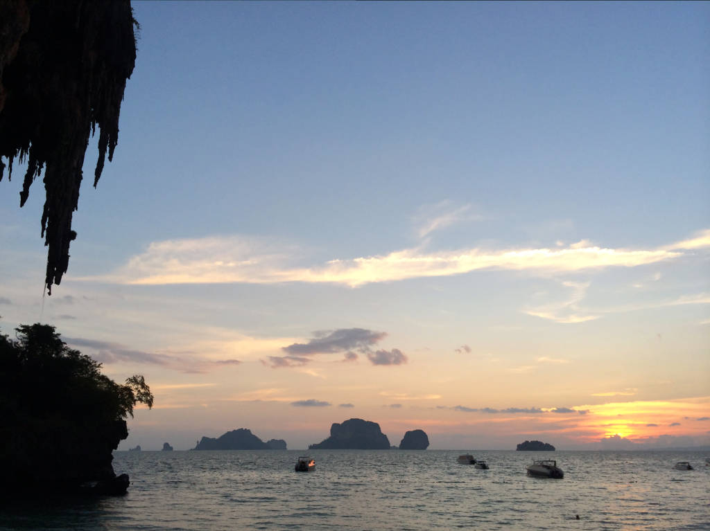 Railay est la péninsule tout au Sud de Ao Nang, on accède à la plage de Phra Nang Beach par bateau seulement, en accostant sur cette longue plage de sable qui fait face à un grand pic de karst solitaire dans la mer, on assiste à un fabuleux coucher de soleil.