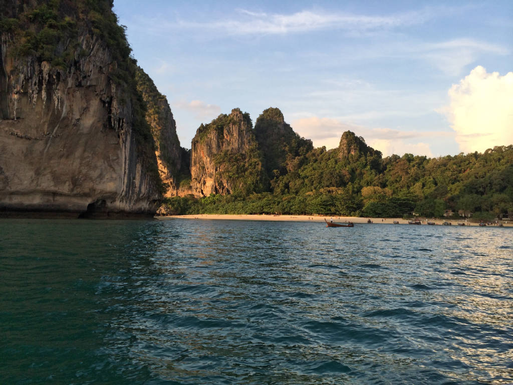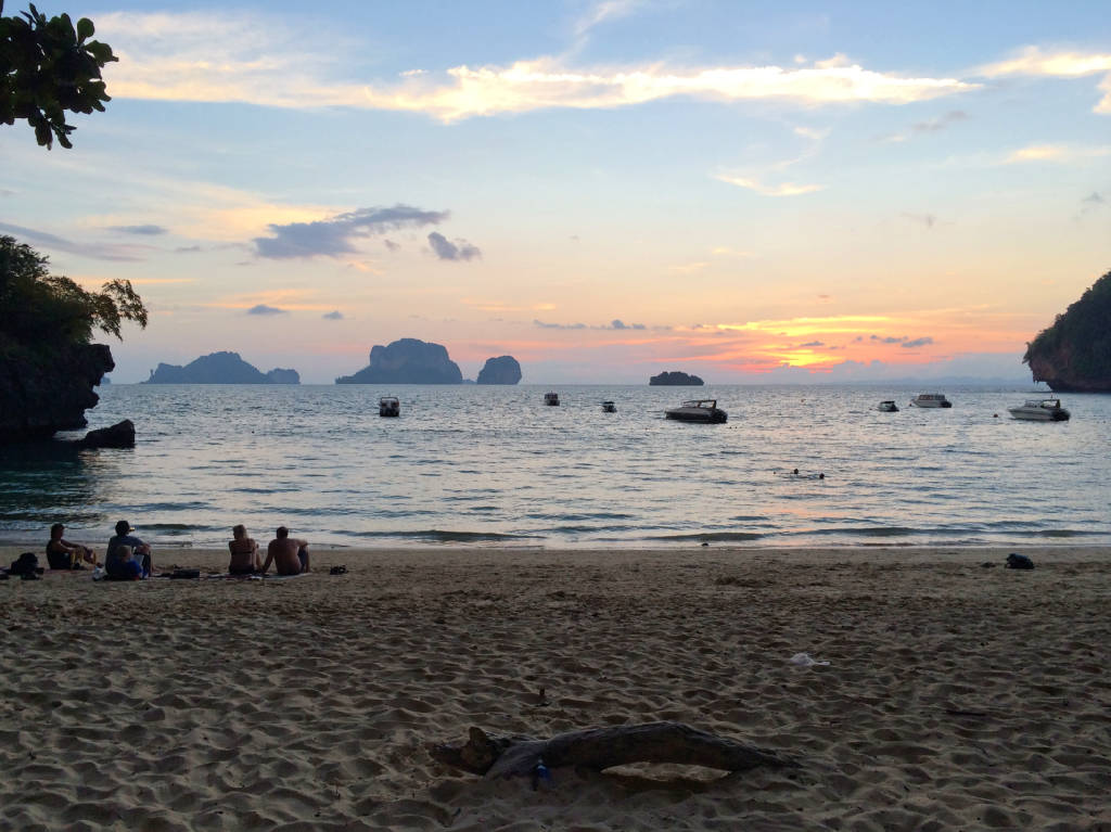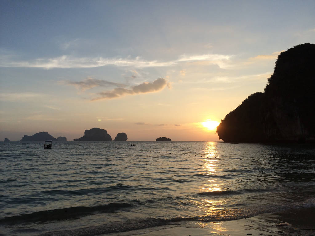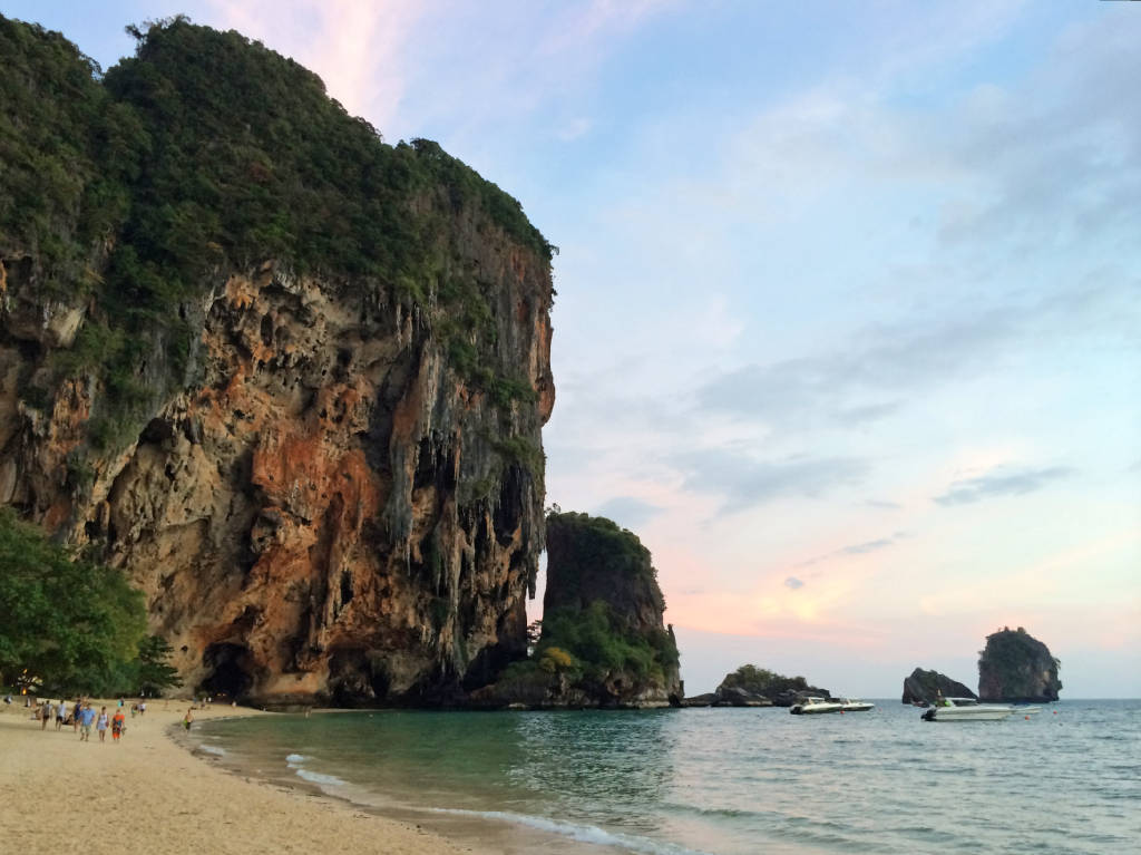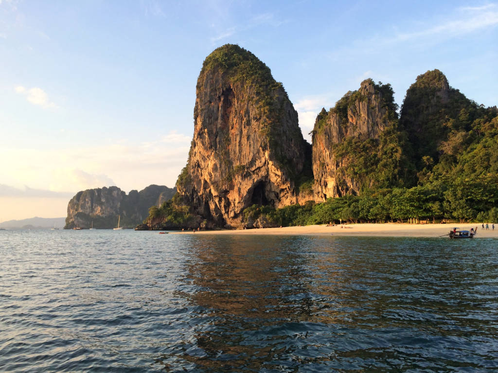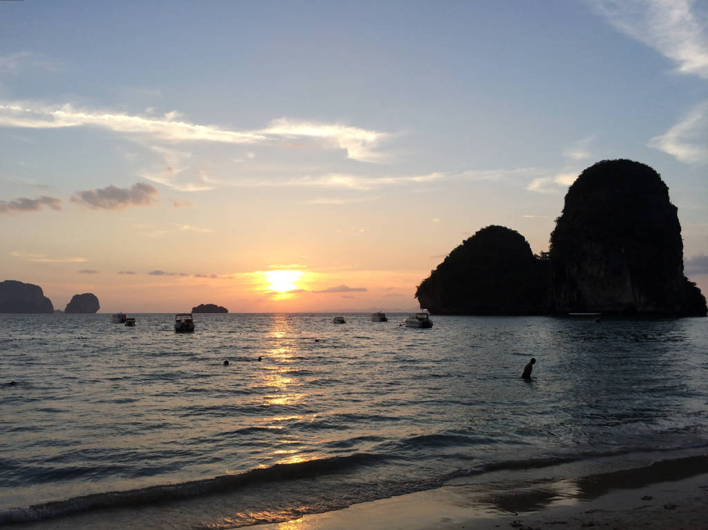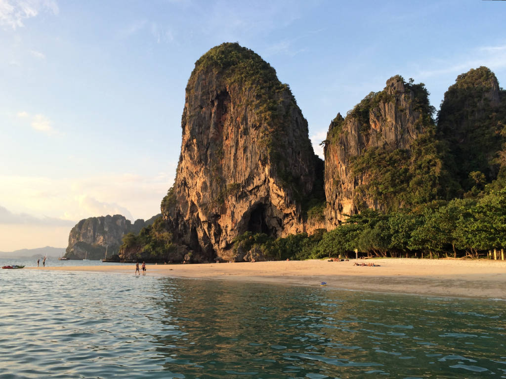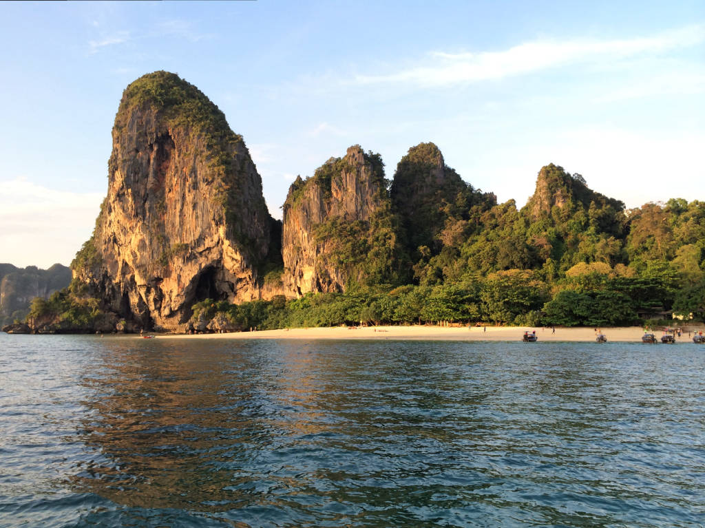 La plage de Railay est considérée comme une des plus belles plages du monde. Encerclée de pics de karst vertigineux qui attirent les grimpeurs du monde entier, le décor est splendide. Face à l’Ouest on apprécie le coucher de soleil et les couleurs du couchant en se promenant sur la longue plage de sable fin.