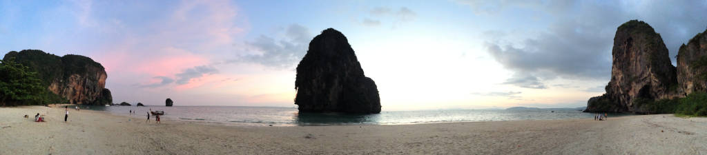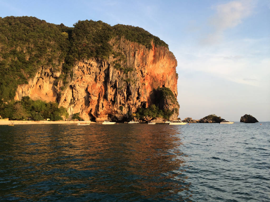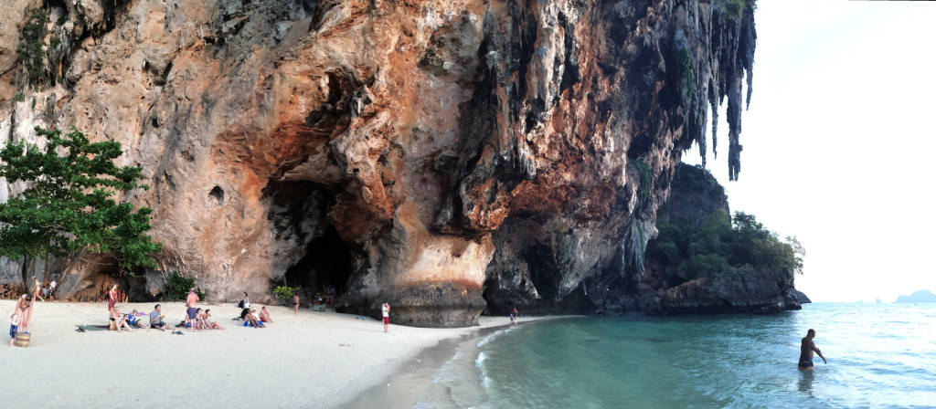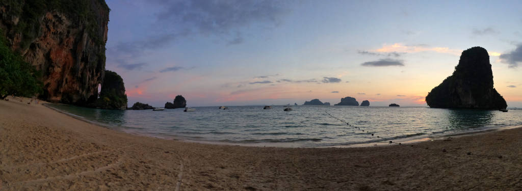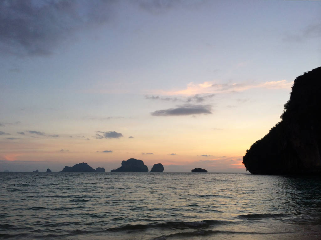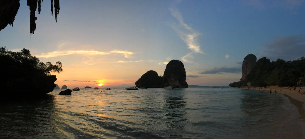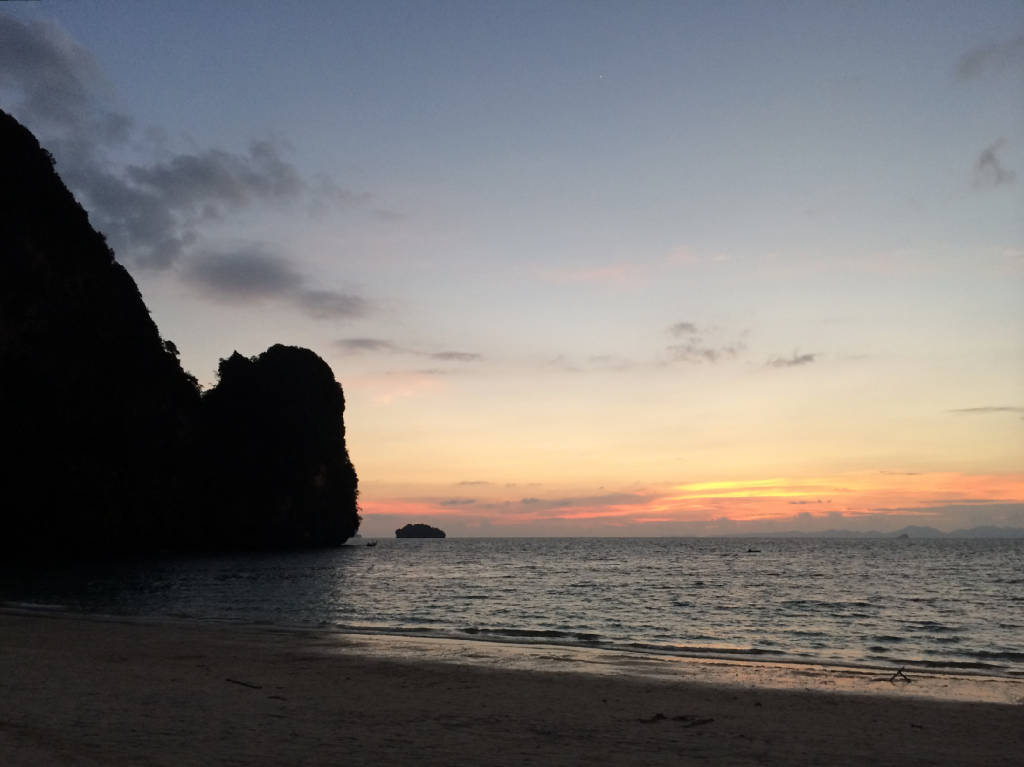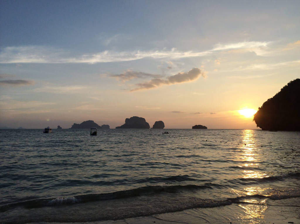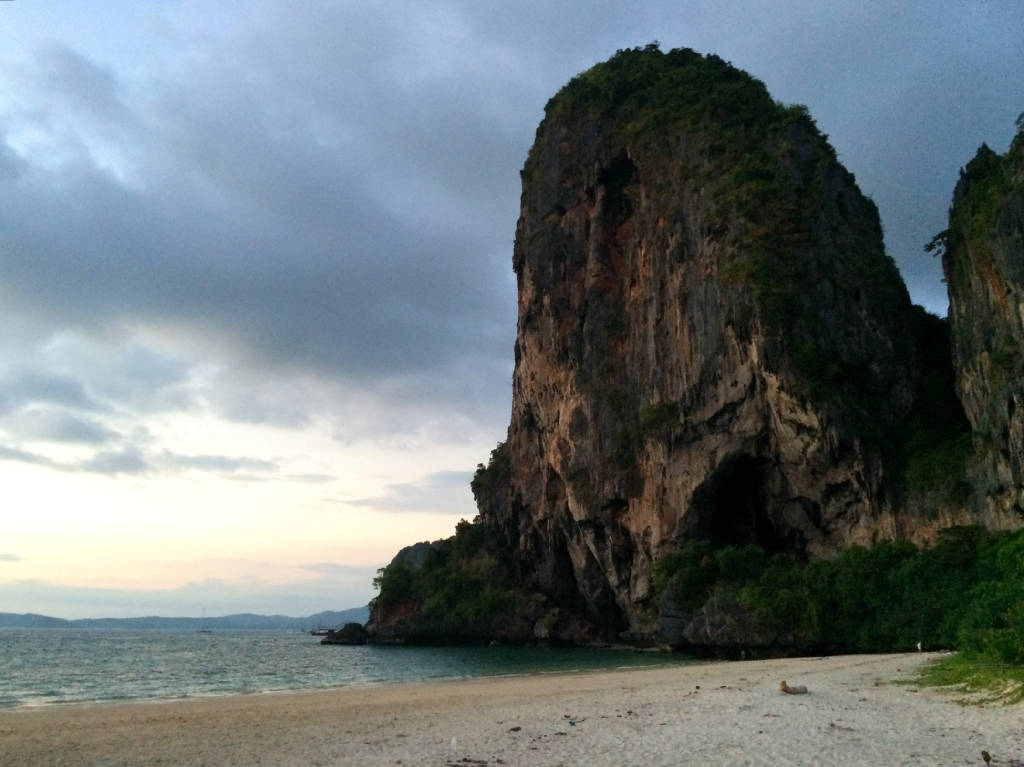 La plage de Railay est considérée comme une des plus belles plages du monde. Encerclée de pics de karst vertigineux qui attirent les grimpeurs du monde entier, le décor est splendide. Face à l’Ouest on apprécie le coucher de soleil et les couleurs du couchant en se promenant sur la longue plage de sable fin.