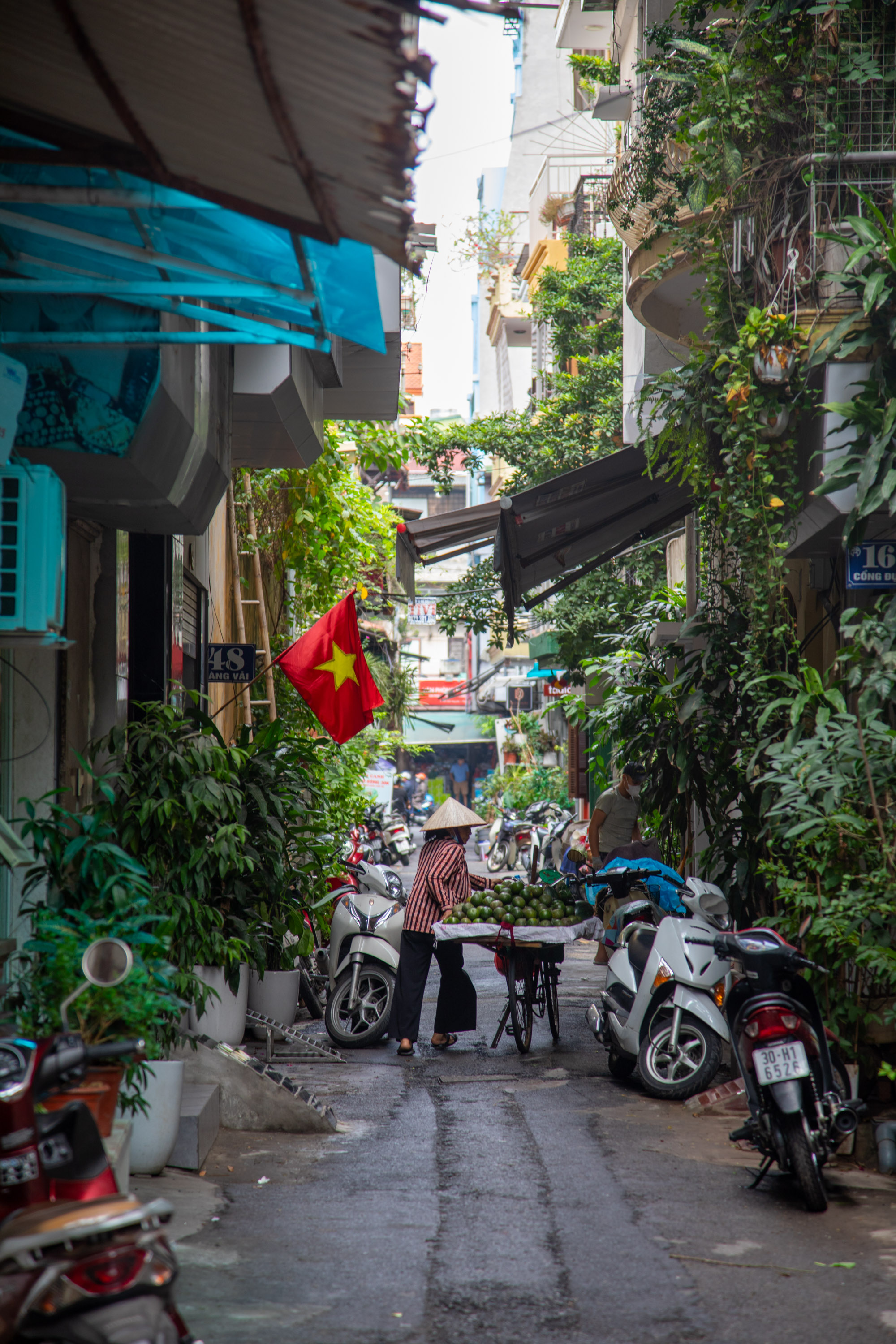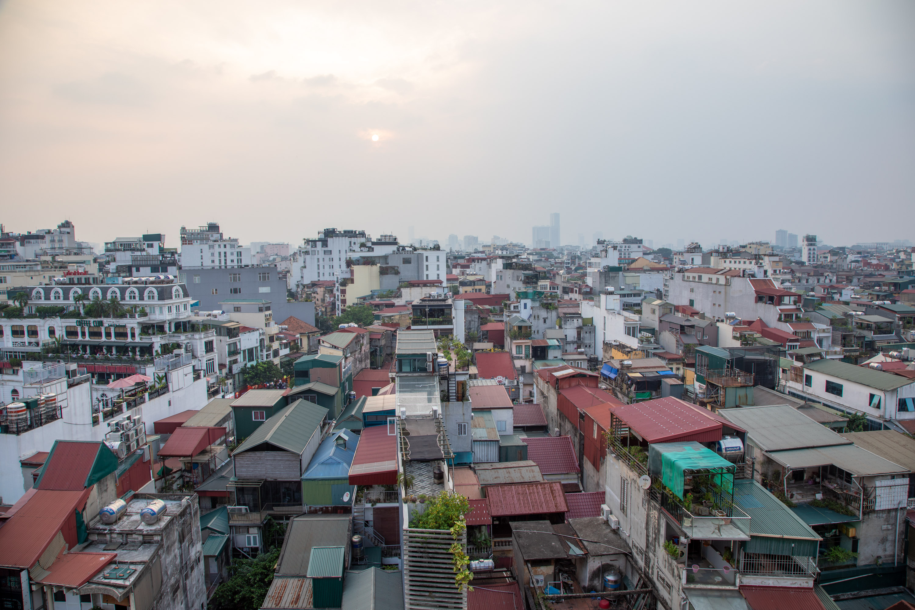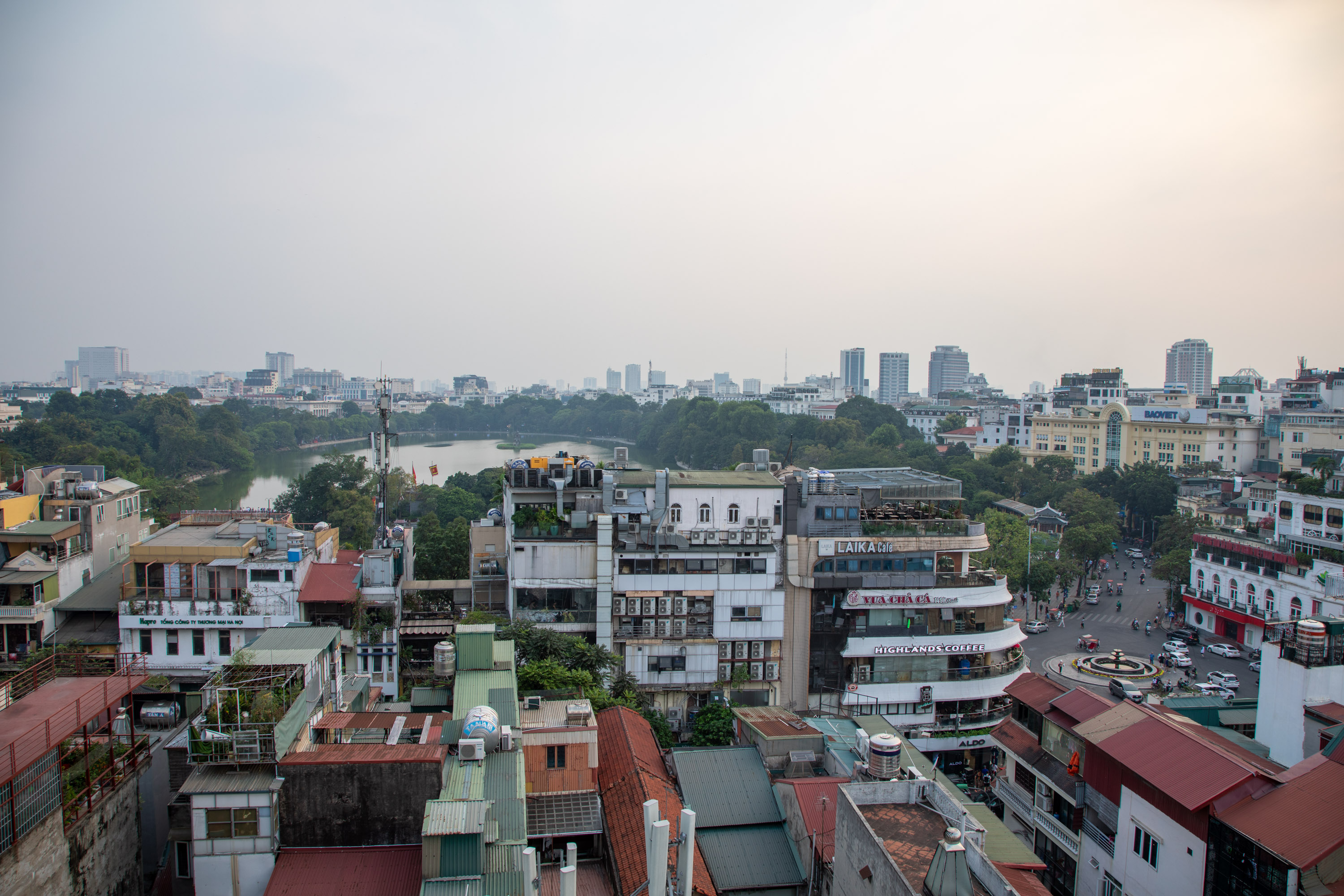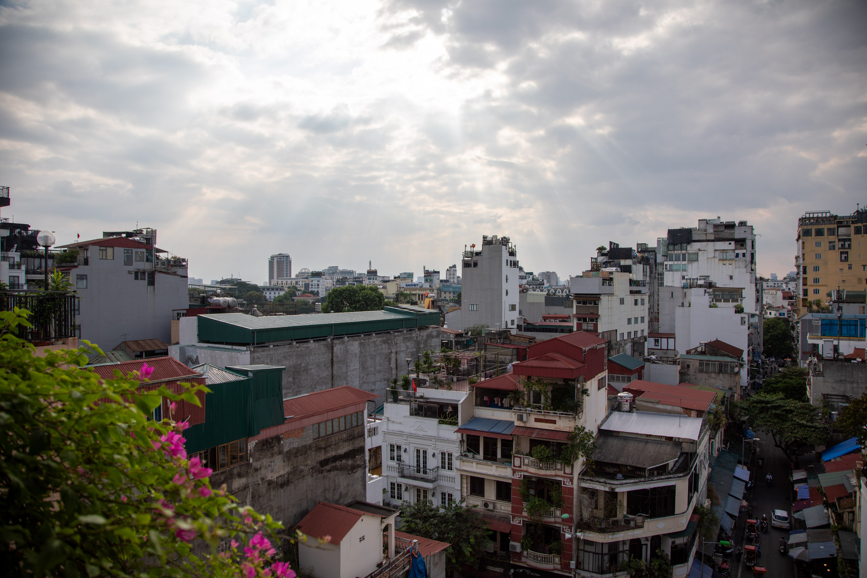 Nous arrivons en fin d’après midi à l’aéroport de Hanoi depuis la Chine voisine. Le vol est très court depuis Guangzhou et on a longé le golfe du Tonkin en survolant les très beaux paysages luxuriants du Guangdong et du Guangxi, des régions que l’on avait parcouru en voiture il y a deux ans et qui nous avait laissé une très belle impression, comme une version moins touristique de Guilin avec les montagnes de karst. Nous nous étions arrêté à la frontière au niveau de la cascade de Detian, la plus grande cascade transnationale d’Asie. En pleine période de fermeture des frontières du à la politique zéro Covid, la rive opposée de la rivière nous semblait être comme un autre monde inaccessible. Cette fois-ci, ca y est nous traversons la frontière et allons voir ce qu’il y a de l’autre côté, il y a une forme de revanche dans le symbole. Le temps est chaud et humide. Le chauffeur que l’on avait réservé en avance et là et nous attend à la sortie, il nous dépose en une quarantaine de minute au coeur du vieux quartier de la ville. On est tout de suite surpris par l’effervescence de la ville, les motos partout, une forme d’anarchie régulée qui fonctionne malgré tout. Le vieux quartier est le coeur touristique de Hanoi, et il y a beaucoup plus d’étrangers occidentaux qu’en Chine, le changement est frappant. Nous avons choisi l’hotel May De Ville Old Quarter Hanoi Hotel , au plein coeur du quartier pas très loin du lac Hoàn Kiếm. Nous voulons profiter d’un séjour urbain donc on veut être au plus proche de la zone la plus intéressante. L’hotel est très beau, on recommande vraiment. On avait peur du bruit et que l’on aurait du mal à dormir mais finalement la chambre donne sur une cour intérieure et on n’entend aucun bruit de la rue. L’atout principal de l’hotel est sa terrasse avec piscine qui domine la rue. Les maisons du centre ville semblent s’imbriquer les unes sur les autres comme des lego.