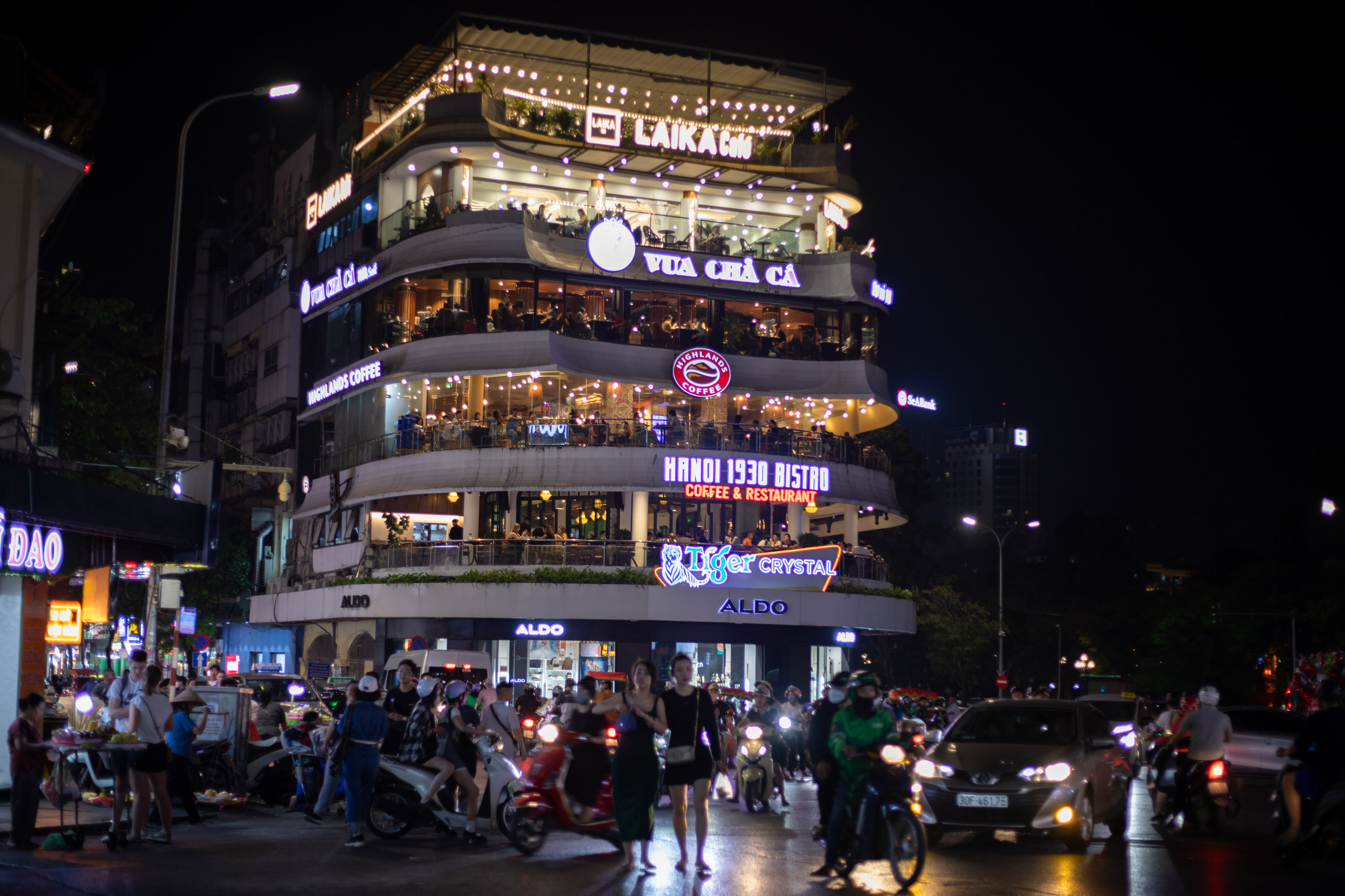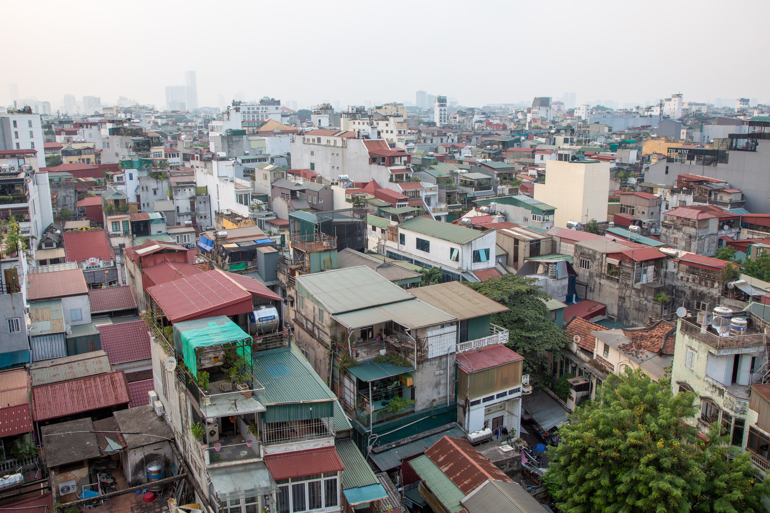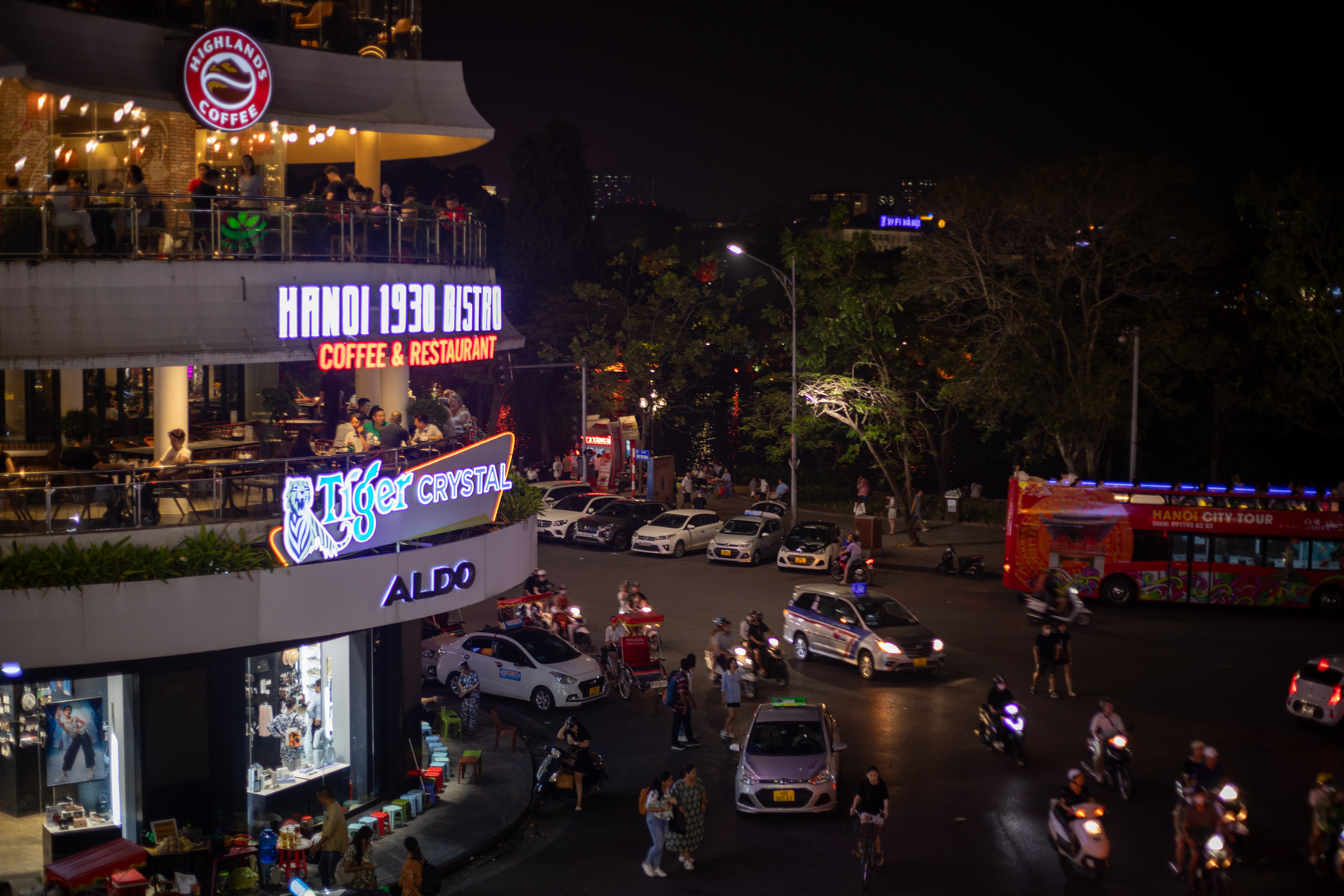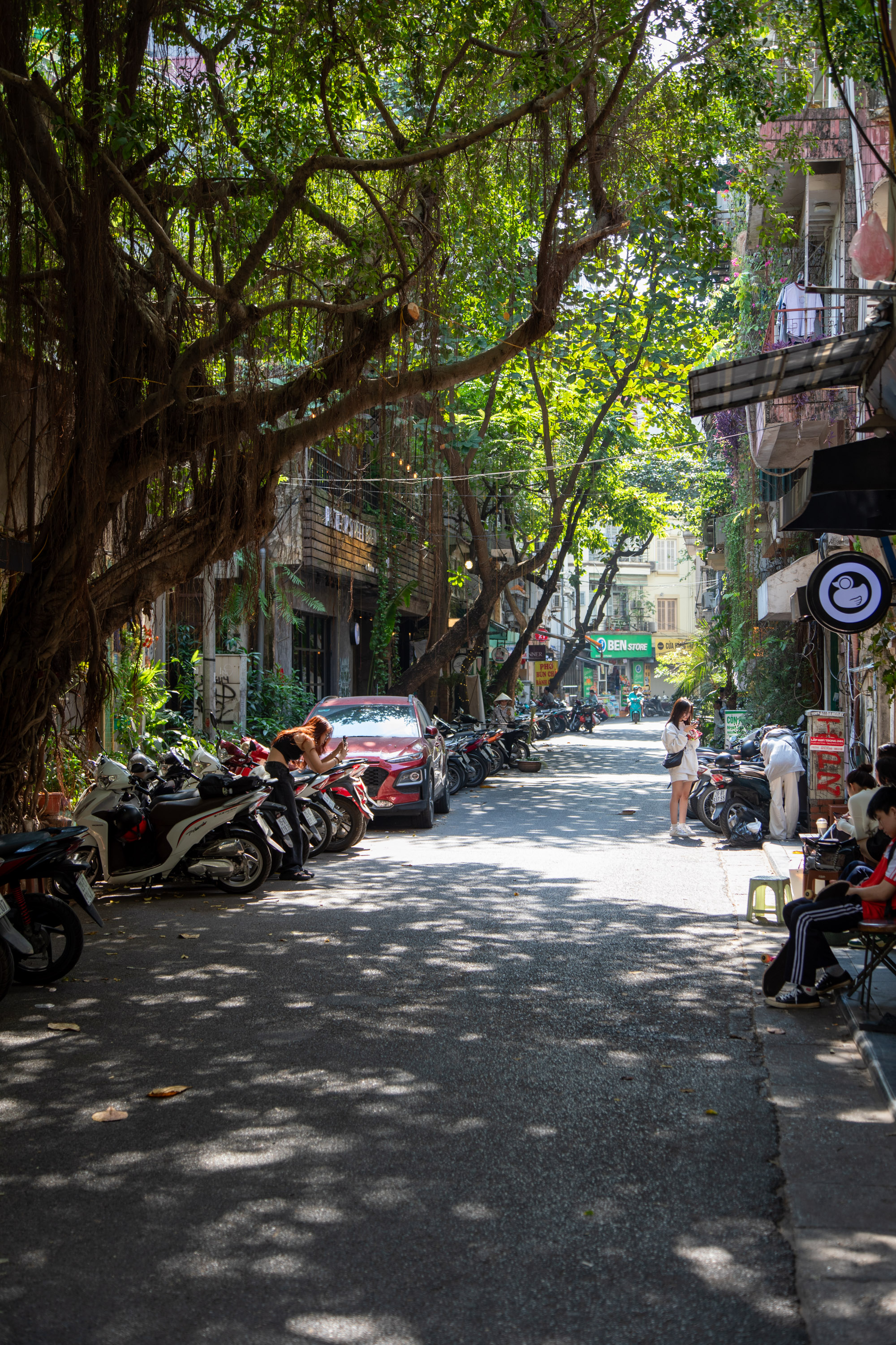 Nous arrivons en fin d’après midi à l’aéroport de Hanoi depuis la Chine voisine. Le vol est très court depuis Guangzhou et on a longé le golfe du Tonkin en survolant les très beaux paysages luxuriants du Guangdong et du Guangxi, des régions que l’on avait parcouru en voiture il y a deux ans et qui nous avait laissé une très belle impression, comme une version moins touristique de Guilin avec les montagnes de karst. Nous nous étions arrêté à la frontière au niveau de la cascade de Detian, la plus grande cascade transnationale d’Asie. En pleine période de fermeture des frontières du à la politique zéro Covid, la rive opposée de la rivière nous semblait être comme un autre monde inaccessible. Cette fois-ci, ca y est nous traversons la frontière et allons voir ce qu’il y a de l’autre côté, il y a une forme de revanche dans le symbole. Le temps est chaud et humide. Le chauffeur que l’on avait réservé en avance et là et nous attend à la sortie, il nous dépose en une quarantaine de minute au coeur du vieux quartier de la ville. On est tout de suite surpris par l’effervescence de la ville, les motos partout, une forme d’anarchie régulée qui fonctionne malgré tout. Le vieux quartier est le coeur touristique de Hanoi, et il y a beaucoup plus d’étrangers occidentaux qu’en Chine, le changement est frappant. Nous avons choisi l’hotel May De Ville Old Quarter Hanoi Hotel , au plein coeur du quartier pas très loin du lac Hoàn Kiếm. Nous voulons profiter d’un séjour urbain donc on veut être au plus proche de la zone la plus intéressante. L’hotel est très beau, on recommande vraiment. On avait peur du bruit et que l’on aurait du mal à dormir mais finalement la chambre donne sur une cour intérieure et on n’entend aucun bruit de la rue. L’atout principal de l’hotel est sa terrasse avec piscine qui domine la rue. Les maisons du centre ville semblent s’imbriquer les unes sur les autres comme des lego.